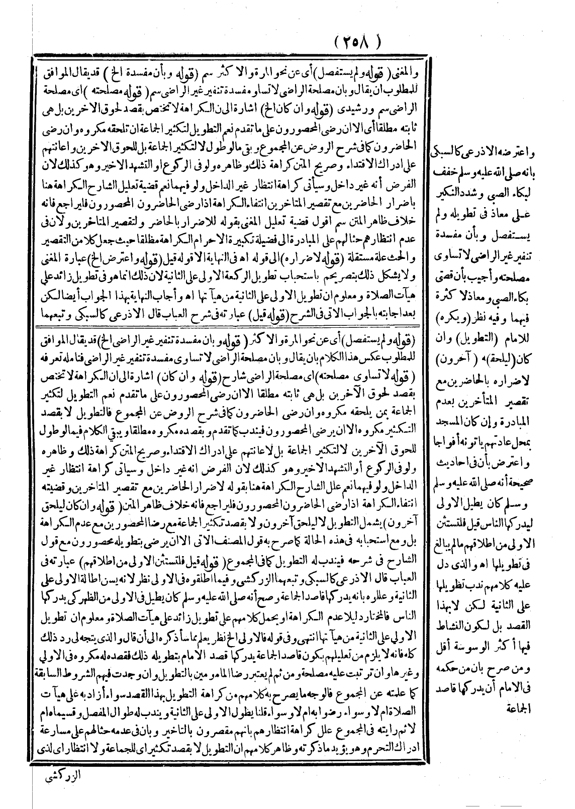 وَاعْتَرَضَهُ الْأَذْرَعِيُّ كَالسُّبْكِيِّ بِأَنَّهُ - صَلَّى اللَّهُ عَلَيْهِ وَسَلَّمَ - «خَفَّفَ لِبُكَاءِ الصَّبِيِّ وَشَدَّدَ النَّكِيرَ عَلَى مُعَاذٍ فِي تَطْوِيلِهِ وَلَمْ يَسْتَفْصِلْ» وَبِأَنَّ مَفْسَدَةَ تَنْفِيرِ غَيْرِ الرَّاضِي لَا تُسَاوِي مَصْلَحَتَهُ وَأُجِيبَ بِأَنَّ قِصَّتَيْ بُكَاءِ الصَّبِيِّ وَمُعَاذٍ لَا كَثْرَةَ فِيهِمَا وَفِيهِ نَظَرٌ.