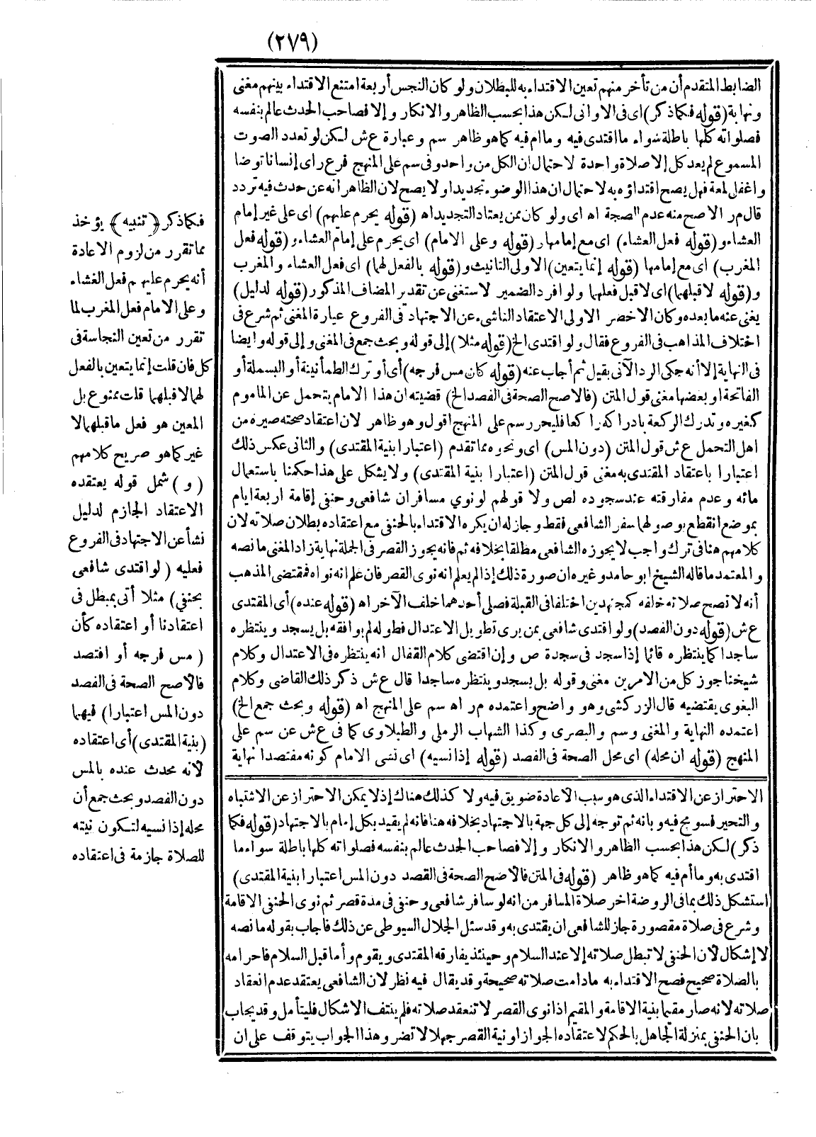 (وَ) شَمِلَ قَوْلُهُ يَعْتَقِدُهُ الِاعْتِقَادَ الْجَازِمَ لِدَلِيلٍ نَشَأَ عَنْ الِاجْتِهَادِ فِي الْفُرُوعِ فَعَلَيْهِ (لَوْ اقْتَدَى شَافِعِيٌّ بِحَنَفِيٍّ) مَثَلًا أَتَى بِمُبْطِلٍ فِي اعْتِقَادِنَا أَوْ اعْتِقَادِهِ كَأَنْ (مَسَّ فَرْجَهُ أَوْ افْتَصَدَ فَالْأَصَحُّ الصِّحَّةُ فِي الْفَصْدِ دُونَ الْمَسِّ اعْتِبَارًا) فِيهِمَا (بِنِيَّةِ الْمُقْتَدِي) أَيْ اعْتِقَادِهِ؛ لِأَنَّهُ مُحْدِثٌ عِنْدَهُ بِالْمَسِّ دُونَ الْفَصْدِ وَبَحَثَ جَمْعٌ أَنَّ مَحَلَّهُ إذَا نَسِيَهُ لِتَكُونَ نِيَّتُهُ لِلصَّلَاةِ جَازِمَةً فِي اعْتِقَادِهِ