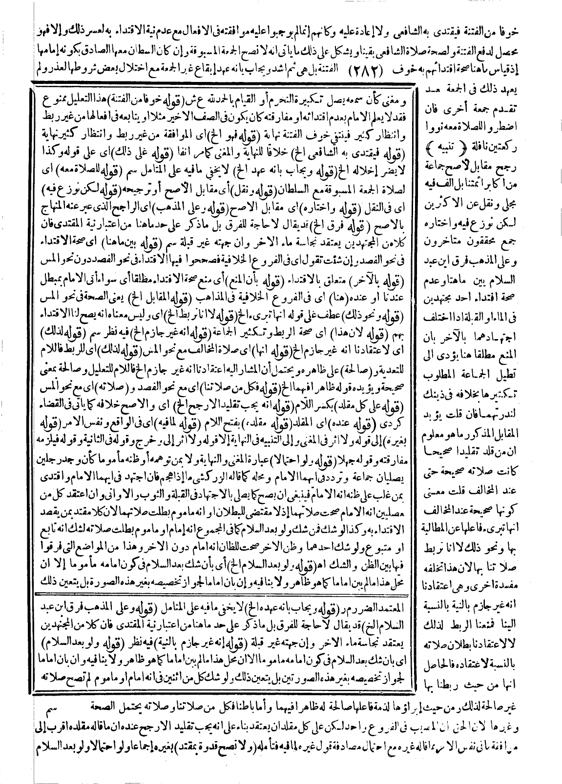 خَوْفًا مِنْ الْفِتْنَةِ فَيَقْتَدِي بِهِ الشَّافِعِيُّ وَلَا إعَادَةَ عَلَيْهِ وَكَأَنَّهُمْ إنَّمَا لَمْ يُوجِبُوا عَلَيْهِ مُوَافَقَتَهُ فِي الْأَفْعَالِ مَعَ عَدَمِ نِيَّةِ الِاقْتِدَاءِ بِهِ لِعُسْرِ ذَلِكَ وَإِلَّا فَهُوَ مُحَصِّلٌ لِدَفْعِ الْفِتْنَةِ وَلِصِحَّةِ صَلَاةِ الشَّافِعِيِّ يَقِينًا وَيُشْكِلُ عَلَى ذَلِكَ مَا يَأْتِي أَنَّهُ لَا تَصِحُّ الْجُمُعَةُ الْمَسْبُوقَةُ، وَإِنْ كَانَ السُّلْطَانُ مَعَهَا الصَّادِقُ بِكَوْنِهِ إمَامَهَا إذْ قِيَاسُ مَا هُنَا صِحَّةُ اقْتِدَائِهِمْ بِهِ خَوْفَ الْفِتْنَةِ بَلْ هِيَ ثَمَّ أَشَدُّ وَيُجَابُ بِأَنَّهُ عُهِدَ إيقَاعِ غَيْرِ الْجُمُعَةِ مَعَ اخْتِلَالِ بَعْضِ شُرُوطِهَا لِعُذْرٍ وَلَمْ يُعْهَدْ ذَلِكَ فِي الْجُمُعَةِ بَعْدَ تَقَدُّمِ جُمُعَةٍ أُخْرَى، فَإِنْ اُضْطُرُّوا لِلصَّلَاةِ مَعَهُ نَوَوْا رَكْعَتَيْنِ نَافِلَةً