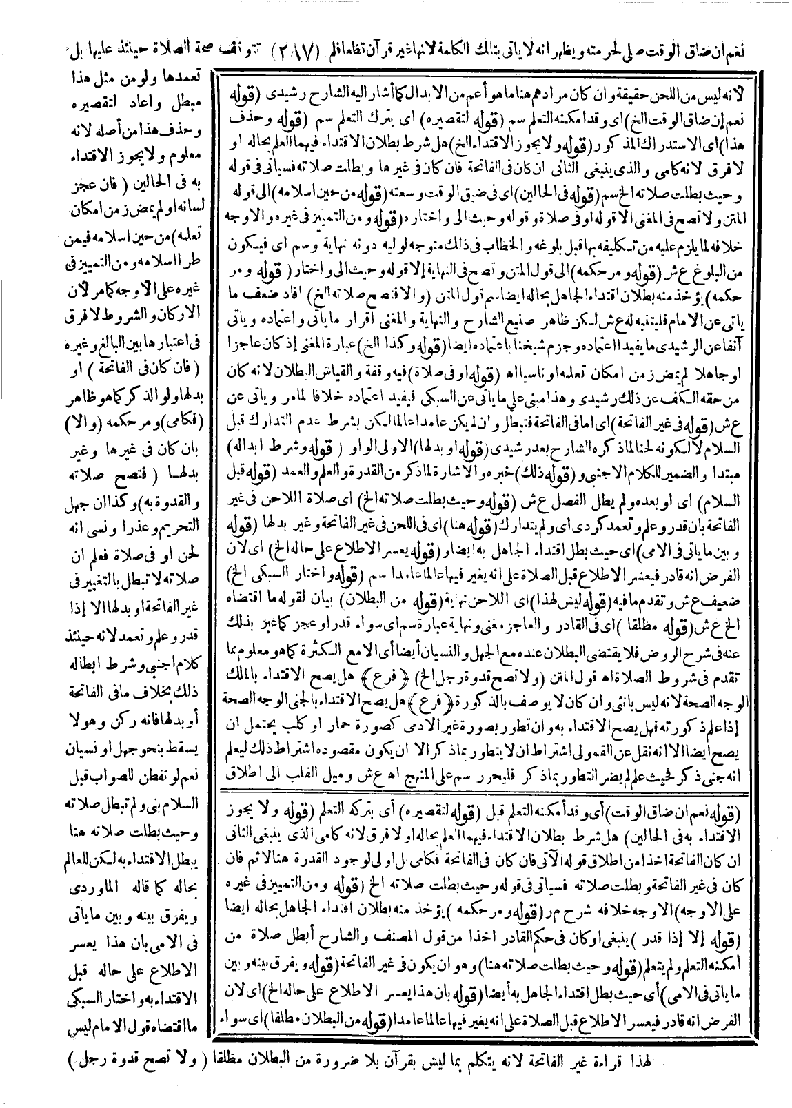 (قَوْلُهُ: نَعَمْ إنْ ضَاقَ الْوَقْتُ إلَخْ) أَيْ وَقَدْ أَمْكَنَهُ التَّعَلُّمُ سم (قَوْلُهُ: لِتَقْصِيرِهِ) أَيْ بِتَرْكِ التَّعَلُّمِ سم (قَوْلُهُ: وَحُذِفَ هَذَا) أَيْ الِاسْتِدْرَاكُ الْمَذْكُورُ (قَوْلُهُ: وَلَا يَجُوزُ الِاقْتِدَاءُ إلَخْ) هَلْ شَرْطُ بُطْلَانِ الِاقْتِدَاءِ فِيهِمَا الْعِلْمُ بِحَالِهِ أَوْ لَا فَرْقَ؛ لِأَنَّهُ كَأُمِّيٍّ وَاَلَّذِي يَنْبَغِي الثَّانِي إنْ كَانَ فِي الْفَاتِحَةِ، فَإِنْ كَانَ فِي غَيْرِهَا وَبَطَلَتْ صَلَاتُهُ فَسَيَأْتِي فِي قَوْلِهِ وَحَيْثُ بَطَلَتْ صَلَاتُهُ إلَخْ سم (قَوْلُهُ: فِي الْحَالَيْنِ) أَيْ فِي ضِيقِ الْوَقْتِ وَسَعَتِهِ (قَوْلُهُ: مِنْ حِينِ إسْلَامِهِ) إلَى قَوْلِ الْمَتْنِ وَلَا تَصِحُّ فِي الْمُغْنِي إلَّا قَوْلُهُ أَوْ فِي صَلَاةٍ وَقَوْلُهُ وَحَيْثُ إلَى وَاخْتَارَهُ (قَوْلُهُ: وَمِنْ التَّمْيِيزِ فِي غَيْرِهِ إلَخْ) وَالْأَوْجَهُ خِلَافُهُ لِمَا يَلْزَمُ عَلَيْهِ مِنْ تَكْلِيفِهِ بِهَا قَبْلَ بُلُوغِهِ، وَالْخِطَابُ فِي ذَلِكَ مُتَوَجِّهٌ لِوَلِيِّهِ دُونَهُ نِهَايَةٌ وسم أَيْ فَيَكُونُ مِنْ الْبُلُوغِ ع ش (قَوْلُهُ: وَمَرَّ حُكْمُهُ) إلَى قَوْلِ الْمَتْنِ وَتَصِحُّ فِي النِّهَايَةِ إلَّا قَوْلَهُ وَحَيْثُ إلَى وَاخْتَارَ (قَوْلُهُ: وَمَرَّ حُكْمُهُ) يُؤْخَذُ مِنْهُ بُطْلَانُ اقْتِدَاءِ الْجَاهِلِ بِحَالِهِ أَيْضًا سم قَوْلُ الْمَتْنِ (وَإِلَّا فَتَصِحُّ صَلَاتُهُ إلَخْ) أَفَادَ ضَعْفَ مَا يَأْتِي عَنْ الْإِمَامِ فَلْيُتَنَبَّهْ لَهُ ع ش لَكِنَّ ظَاهِرَ صَنِيعِ الشَّارِحِ، وَالنِّهَايَةِ وَالْمُغْنِي إقْرَارُ مَا يَأْتِي وَاعْتِمَادُهُ وَيَأْتِي آنِفًا عَنْ الرَّشِيدِيِّ مَا يُفِيدُ اعْتِمَادَهُ وَجَزَمَ شَيْخُنَا بِاعْتِمَادِهِ أَيْضًا (قَوْلُهُ: وَكَذَا إلَخْ) عِبَارَةُ الْمُغْنِي إذَا كَانَ عَاجِزًا أَوْ جَاهِلًا لَمْ يَمْضِ زَمَنُ إمْكَانِ تَعَلُّمِهِ أَوْ نَاسِيًا. اهـ.