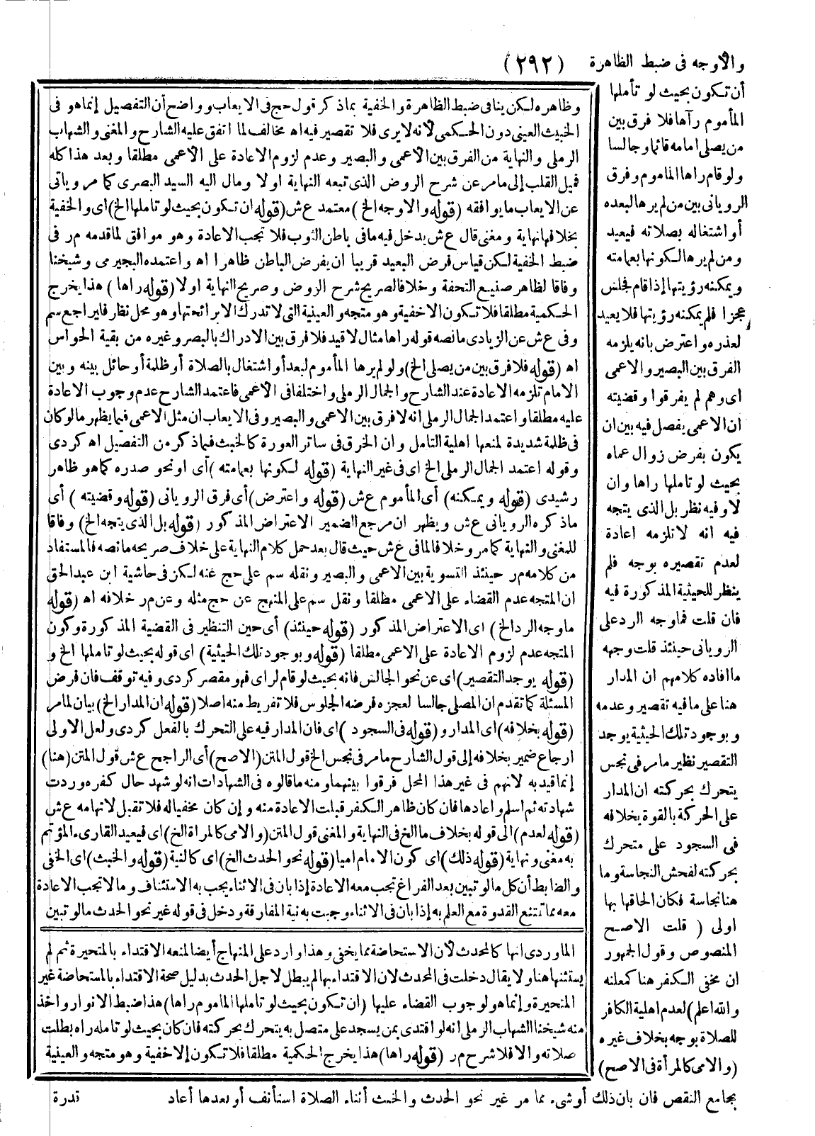 ، وَالْأَوْجَهُ فِي ضَبْطِ الظَّاهِرَةِ أَنْ تَكُونَ بِحَيْثُ لَوْ تَأَمَّلَهَا الْمَأْمُومُ رَآهَا فَلَا فَرْقَ بَيْنَ مَنْ يُصَلِّي إمَامُهُ قَائِمًا وَجَالِسًا وَلَوْ قَامَ رَآهَا الْمَأْمُومُ وَفَرَّقَ الرُّويَانِيُّ بَيْنَ مَنْ لَمْ يَرَهَا لِبُعْدِهِ أَوْ اشْتِغَالِهِ بِصَلَاتِهِ فَيُعِيدُ وَمَنْ لَمْ يَرَهَا لِكَوْنِهَا بِعِمَامَتِهِ وَيُمْكِنُهُ رُؤْيَتُهَا إذَا قَامَ فَجَلَسَ عَجْزًا فَلَمْ يُمْكِنْهُ رُؤْيَتُهَا فَلَا يُعِيدُ لِعُذْرِهِ وَاعْتَرَضَ بِأَنَّهُ يَلْزَمُهُ الْفَرْقُ بَيْنَ الْبَصِيرِ، وَالْأَعْمَى يُفَصَّلُ فِيهِ بَيْنَ أَنْ يَكُونَ بِفَرْضِ زَوَالِ عَمَاهُ بِحَيْثُ لَوْ تَأَمَّلَهَا رَآهَا وَأَنْ لَا وَفِيهِ نَظَرٌ بَلْ الَّذِي يُتَّجَهُ فِيهِ أَنَّهُ لَا تَلْزَمُهُ إعَادَةٌ لِعَدَمِ تَقْصِيرِهِ بِوَجْهٍ فَلَمْ يُنْظَرْ لِلْحَيْثِيَّةِ الْمَذْكُورَةِ فِيهِ، فَإِنْ قُلْت فَمَا وَجْهُ الرَّدِّ عَلَى الرُّويَانِيِّ حِينَئِذٍ قُلْت وَجْهُهُ مَا أَفَادَهُ كَلَامُهُمْ أَنَّ الْمَدَارَ هُنَا عَلَى مَا فِيهِ تَقْصِيرٌ وَعَدَمُهُ وَبِوُجُودِ تِلْكَ الْحَيْثِيَّةِ يُوجَدُ التَّقْصِيرُ نَظِيرُ مَا مَرَّ فِي نَجِسٍ يَتَحَرَّكُ بِحَرَكَتِهِ أَنَّ الْمَدَارَ عَلَى الْحَرَكَةِ بِالْقُوَّةِ بِخِلَافِهِ فِي السُّجُودِ عَلَى مُتَحَرِّكٍ بِحَرَكَتِهِ لِفُحْشِ النَّجَاسَةِ وَمَا هُنَا نَجَاسَةٌ فَكَانَ إلْحَاقُهَا بِهَا أَوْلَى