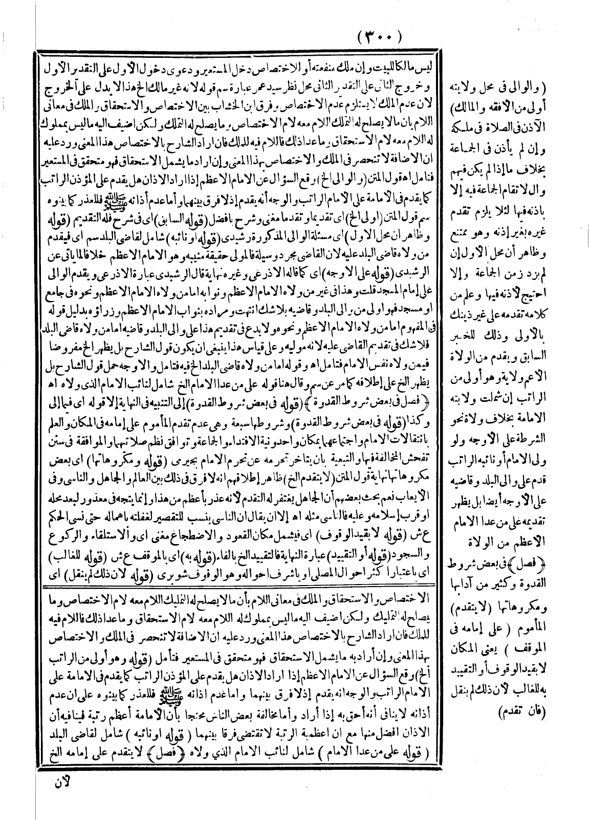 (، وَالْوَالِي فِي مَحَلِّ وِلَايَتِهِ أَوْلَى مِنْ الْأَفْقَهِ وَالْمَالِكِ) إلَّا إذَا أَذِنَ فِي الصَّلَاةِ فِي مِلْكِهِ، وَإِنْ لَمْ يَأْذَنْ فِي الْجَمَاعَةِ بِخِلَافِ مَا إذَا لَمْ يَكُنْ فِيهِمْ وَالٍ لَا تُقَامُ الْجَمَاعَةُ فِي مِلْكِهِ إلَّا بِإِذْنِهِ فِيهَا لِئَلَّا يَلْزَمَ تَقَدُّمُ غَيْرِهِ بِغَيْرِ إذْنِهِ وَهُوَ مُمْتَنِعٌ وَظَاهِرٌ أَنَّ مَحَلَّ الْأَوَّلِ إنْ لَمْ يَزِدْ زَمَنُ الْجَمَاعَةِ وَإِلَّا اُحْتِيجَ لِإِذْنِهِ فِيهَا وَعُلِمَ مِنْ كَلَامِهِ تَقَدُّمُهُ عَلَى غَيْرِ ذَيْنِك بِالْأَوْلَى، وَذَلِكَ لِلْخَبَرِ السَّابِقِ وَيُقَدَّمُ مِنْ الْوُلَاةِ الْأَعَمُّ وِلَايَةً وَهُوَ أَوْلَى مِنْ الرَّاتِبِ إنْ شَمِلَتْ وِلَايَتُهُ الْإِمَامَةَ بِخِلَافِ وُلَاةِ نَحْوِ الشُّرْطَةِ عَلَى الْأَوْجَهِ وَلَوْ وَلَّى الْإِمَامُ أَوْ نَائِبُهُ الرَّاتِبَ قُدِّمَ عَلَى وَالِي الْبَلَدِ وَقَاضِيهِ عَلَى الْأَوْجَهِ أَيْضًا بَلْ يَظْهَرُ تَقْدِيمُهُ عَلَى مَنْ عَدَا الْإِمَامِ الْأَعْظَمِ مِنْ الْوُلَاةِ.