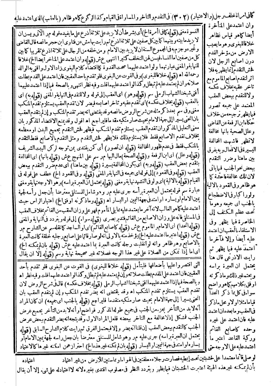 كَمَا فِي امْرَأَةٍ خَلْفَ رَجُلٍ (وَالِاعْتِبَارُ) فِي التَّقَدُّمِ وَالتَّأَخُّرِ، وَالْمُسَاوَاةِ فِي الْقِيَامِ وَكَذَا الرُّكُوعُ كَمَا هُوَ ظَاهِرٌ (بِالْعَقِبِ) الَّذِي اعْتَمَدَ عَلَيْهِ، وَإِنْ اعْتَمَدَ عَلَى الْمُتَأَخِّرَةِ أَيْضًا كَمَا هُوَ قِيَاسُ نَظَائِرِهِ خِلَافًا لِلْبَغَوِيِّ وَهُوَ مَا يُصِيبُ الْأَرْضَ مِنْ مُؤَخَّرِ الْقَدَمِ دُونَ أَصَابِعِ الرِّجْلِ؛ لِأَنَّ فُحْشَ التَّقَدُّمِ إنَّمَا يَظْهَرُ بِهِ فَلَا أَثَرَ لِتَقَدُّمِ أَصَابِعِ الْمَأْمُومِ مَعَ تَأَخُّرِ عَقِبِهِ بِخِلَافِ عَكْسِهِ وَلَا لِلتَّقَدُّمِ بِبَعْضِ الْعَقِبِ الْمُعْتَمَدِ عَلَى جَمِيعِهِ إنْ تَصَوَّرَ فِيمَا يَظْهَرُ تَرْجِيحُهُ مِنْ خِلَافٍ حَكَاهُ ابْنُ الرِّفْعَةِ عَنْ الْقَاضِي وَعَلَّلَ الصِّحَّةَ بِأَنَّهَا مُخَالِفَةٌ لَا تَظْهَرُ فَأَشْبَهَتْ الْمُخَالَفَةَ الْيَسِيرَةَ فِي الْأَفْعَالِ وَبِهِ يُفَرَّقُ بَيْنَ مَا هُنَا وَضَرَرُ التَّقَدُّمِ بِبَعْضِ نَحْوِ الْجَنْبِ فِيمَا يَأْتِي لِأَنَّ تِلْكَ مُخَالَفَةٌ فَاحِشَةٌ كَمَا هُوَ ظَاهِرٌ وَفِي الْقُعُودِ بِالْأَلْيَةِ وَلَوْ رَاكِبًا وَفِي الِاضْطِجَاعِ بِالْجَنْبِ أَيْ جَمِيعِهِ وَهُوَ مَا تَحْتَ عَظْمِ الْكَتِفِ إلَى الْخَاصِرَةِ فِيمَا يَظْهَرُ وَفِي الِاسْتِلْقَاءِ بِالْعَقِبِ إنْ اعْتَمَدَ عَلَيْهِ أَيْضًا وَإِلَّا فَآخِرُ مَا اعْتَمَدَ عَلَيْهِ فِيمَا يَظْهَرُ ثُمَّ رَأَيْت الْأَذْرَعِيَّ قَالَ هُنَا يَحْتَمِلُ أَنَّ الْعِبْرَةَ بِرَأْسِهِ وَيَحْتَمِلُ غَيْرَ ذَلِكَ وَمَا ذَكَرْتُهُ أَوْفَقُ بِكَلَامِهِمْ كَمَا هُوَ وَاضِحٌ سَوَاءٌ فِي كُلٍّ مِمَّا ذُكِرَ اتَّحَدَا قِيَامًا مَثَلًا أَوْ لَا، وَمَحَلُّ مَا ذُكِرَ فِي الْعَقِبِ وَمَا بَعْدَهُ إنْ اعْتَمَدَ عَلَيْهِ