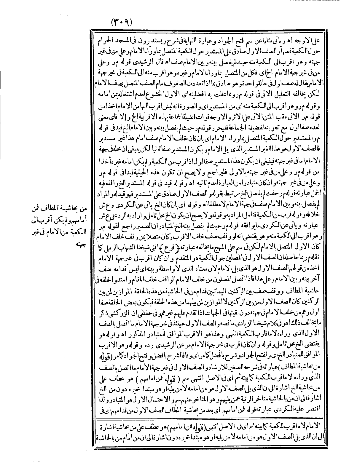 قَالَ الرَّشِيدِيُّ قَوْلُهُ م ر وَعَلَى مَنْ فِي غَيْرِ جِهَةِ الْإِمَامِ إلَخْ أَيْ فَكُلٌّ مِنْ الْمُتَّصِلِ بِمَا وَرَاءَ الْإِمَامِ وَغَيْرِهِ وَهُوَ أَقْرَبُ مِنْهُ إلَى الْكَعْبَةِ فِي غَيْرِ جِهَةِ الْإِمَامِ يُقَالُ لَهُ صَفٌّ أَوَّلُ فِي حَالَةٍ وَاحِدَةٍ وَهُوَ صَادِقٌ بِمَا إذَا تَعَدَّدَتْ الصُّفُوفُ أَمَامَ الصَّفِّ الْمُتَّصِلِ بِصَفِّ الْإِمَامِ لَكِنْ يُخَالِفُهُ التَّعْلِيلُ الْآتِي فِي قَوْلِهِ م ر وَمِمَّا عَلَّلْت بِهِ أَفْضَلِيَّتَهُ أَيْ الْأَوَّلِ الْخُشُوعُ لِعَدَمِ اشْتِغَالِهِ بِمَنْ أَمَامَهُ وَقَوْلُهُ م ر وَهُوَ أَقْرَبُ إلَى الْكَعْبَةِ مِنْهُ أَيْ مِنْ الْمُسْتَدِيرِ أَيْ، وَالصُّورَةُ أَنَّهُ لَيْسَ أَقْرَبَ إلَيْهَا مِنْ الْإِمَامِ أَخْذًا مِنْ قَوْلِهِ م ر الْآتِي عَقِبَ الْمَتْنِ الْآتِي عَلَى الْأَثَرِ وَالْأَوْجَهُ فَوَاتُ فَضِيلَةِ الْجَمَاعَةِ بِهَذِهِ الْأَقْرَبِيَّةِ إلَخْ وَإِلَّا فَأَيُّ مَعْنًى لِعَدِّهِ صَفًّا أَوَّلَ مَعَ تَفْوِيتِهِ لِفَضِيلَةِ الْجَمَاعَةِ فَلْيُحَرَّرْ وَقَوْلُهُ م ر حَيْثُ لَمْ يَفْصِلْ بَيْنَهُ وَبَيْنَ الْإِمَامِ إلَخْ قَيْدٌ فِي قَوْلِهِ م ر الْمُسْتَدِيرُ حَوْلَ الْكَعْبَةِ الْمُتَّصِلُ بِمَا وَرَاءَ الْإِمَامِ أَيْ بِأَنْ كَانَ خَلْفَ الْإِمَامِ صَفٌّ أَمَامَ هَذَا غَيْرُ مُسْتَدِيرٍ فَالصَّفُّ الْأَوَّلُ هُوَ هَذَا الْغَيْرُ الْمُسْتَدِيرُ الَّذِي يَلِي الْإِمَامَ وَيَكُونُ الْمُسْتَدِيرُ صَفًّا ثَانِيًا لَكِنْ يَنْبَغِي أَنَّ مَحَلَّهُ فِي جِهَةِ الْإِمَامِ أَمَّا فِي غَيْرِ جِهَتِهِ فَيَنْبَغِي أَنْ يَكُونَ هَذَا الْمُسْتَدِيرُ صَفًّا أَوَّلَ إذَا قَرُبَ مِنْ الْكَعْبَةِ وَلَمْ يَكُنْ أَمَامَهُ غَيْرُهُ أَخْذًا مِنْ قَوْلِهِ م ر وَعَلَى مَنْ فِي غَيْرِ جِهَتِهِ بِالْأَوْلَى فَلْيُرَاجَعْ وَلَا يَصِحُّ أَنْ تَكُونَ هَذِهِ الْحَيْثِيَّةُ قَيْدًا فِي قَوْلِهِ م ر وَعَلَى مَنْ فِي غَيْرِ جِهَتِهِ، وَإِنْ كَانَ مُتَبَادَرًا مِنْ الْعِبَارَةِ لِعَدَمِ تَأَتِّيه. اهـ.
