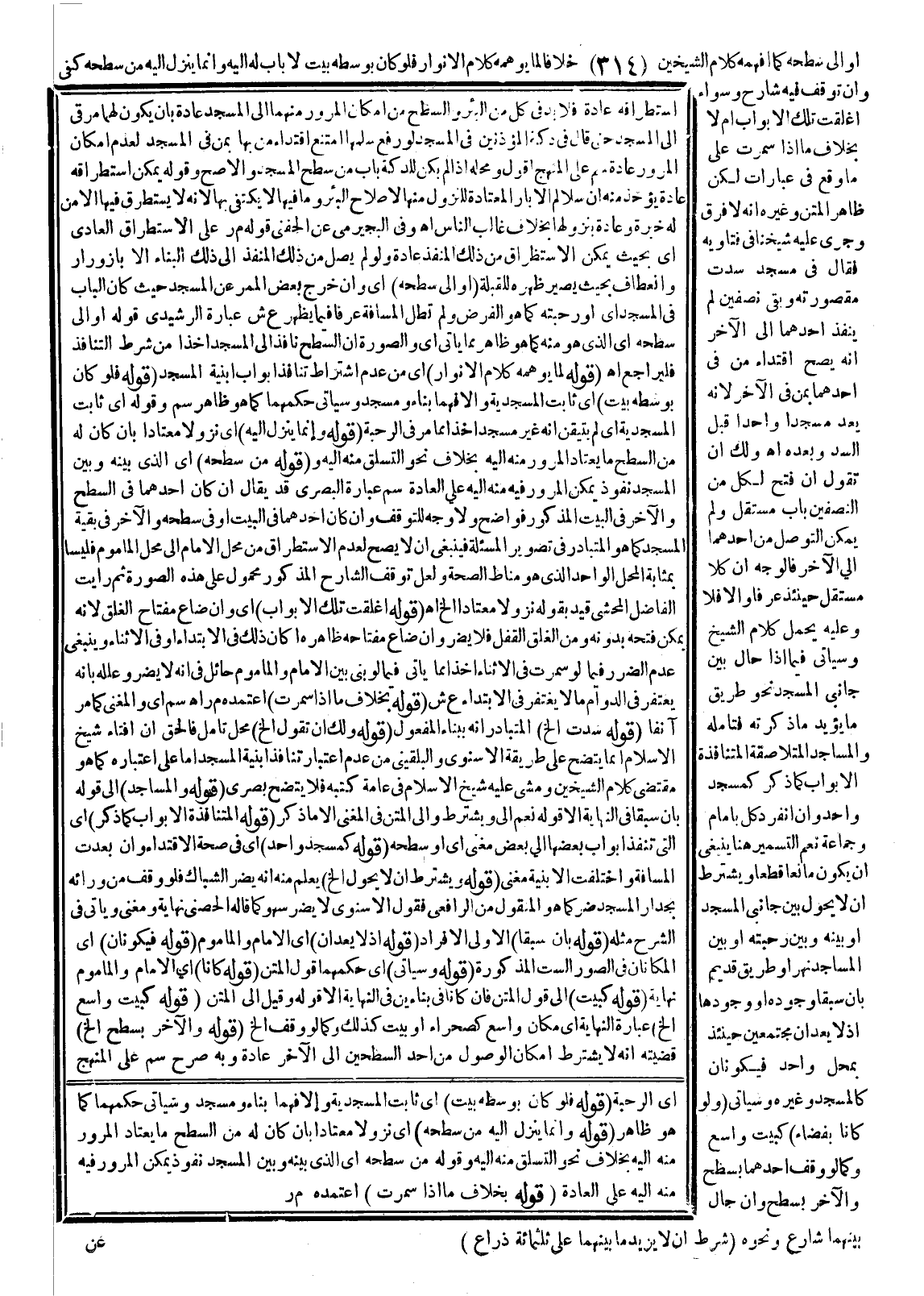 أَوْ إلَى سَطْحِهِ كَمَا أَفْهَمهُ كَلَامُ الشَّيْخَيْنِ خِلَافًا لِمَا يُوهِمُهُ كَلَامُ الْأَنْوَارِ فَلَوْ كَانَ بِوَسَطِهِ بَيْتٌ لَا بَابَ لَهُ إلَيْهِ، وَإِنَّمَا يَنْزِلُ إلَيْهِ مِنْ سَطْحِهِ كَفَى، وَإِنْ تَوَقَّفَ فِيهِ شَارِحٌ وَسَوَاءٌ أُغْلِقَتْ تِلْكَ الْأَبْوَابُ أَمْ لَا بِخِلَافِ مَا إذَا سُمِّرَتْ عَلَى مَا وَقَعَ فِي عِبَارَاتٍ لَكِنَّ ظَاهِرَ الْمَتْنِ وَغَيْرَهُ أَنَّهُ لَا فَرْقَ وَجَرَى عَلَيْهِ شَيْخُنَا فِي فَتَاوِيهِ فَقَالَ فِي مَسْجِدٍ سُدَّتْ مَقْصُورَتُهُ وَبَقِيَ نِصْفَيْنِ لَمْ يَنْفُذْ أَحَدُهُمَا إلَى الْآخَرِ أَنَّهُ يَصِحُّ اقْتِدَاءُ مَنْ فِي أَحَدِهِمَا بِمَنْ فِي الْآخَرِ؛ لِأَنَّهُ يُعَدُّ مَسْجِدًا وَاحِدًا قَبْلَ السَّدِّ وَبَعْدَهُ. اهـ. وَلَك أَنْ تَقُولَ إنْ فُتِحَ لِكُلٍّ مِنْ النِّصْفَيْنِ بَابٌ مُسْتَقِلٌّ وَلَمْ يُمْكِنْ التَّوَصُّلُ مِنْ أَحَدِهِمَا إلَى الْآخَرِ فَالْوَجْهُ أَنَّ كُلًّا مُسْتَقِلٌّ حِينَئِذٍ عُرْفًا وَإِلَّا فَلَا وَعَلَيْهِ يُحْمَلُ كَلَامُ الشَّيْخِ وَسَيَأْتِي فِيمَا إذَا حَالَ بَيْنَ جَانِبَيْ الْمَسْجِدِ نَحْوُ طَرِيقٍ مَا يُؤَيِّدُ مَا ذَكَرْته فَتَأَمَّلْهُ، وَالْمَسَاجِدُ الْمُتَلَاصِقَةُ الْمُتَنَافِذَةُ الْأَبْوَابِ كَمَا ذُكِرَ كَمَسْجِدٍ وَاحِدٍ، وَإِنْ انْفَرَدَ كُلٌّ بِإِمَامٍ وَجَمَاعَةٍ نَعَمْ التَّسْمِيرُ هُنَا يَنْبَغِي أَنْ يَكُونَ مَانِعًا قَطْعًا وَيُشْتَرَطُ أَنْ لَا يَحُولَ بَيْنَ جَانِبَيْ الْمَسْجِدِ أَوْ بَيْنَهُ وَبَيْنَ رَحْبَتِهِ أَوْ بَيْنَ الْمَسَاجِدِ نَهْرٌ أَوْ طَرِيقٌ قَدِيمٌ بِأَنْ سَبَقَا وُجُودَهُ أَوْ وُجُودَهَا إذْ لَا يُعَدَّانِ مُجْتَمِعَيْنِ حِينَئِذٍ بِمَحَلٍّ وَاحِدٍ فَيَكُونَانِ كَالْمَسْجِدِ وَغَيْرِهِ وَسَيَأْتِي.