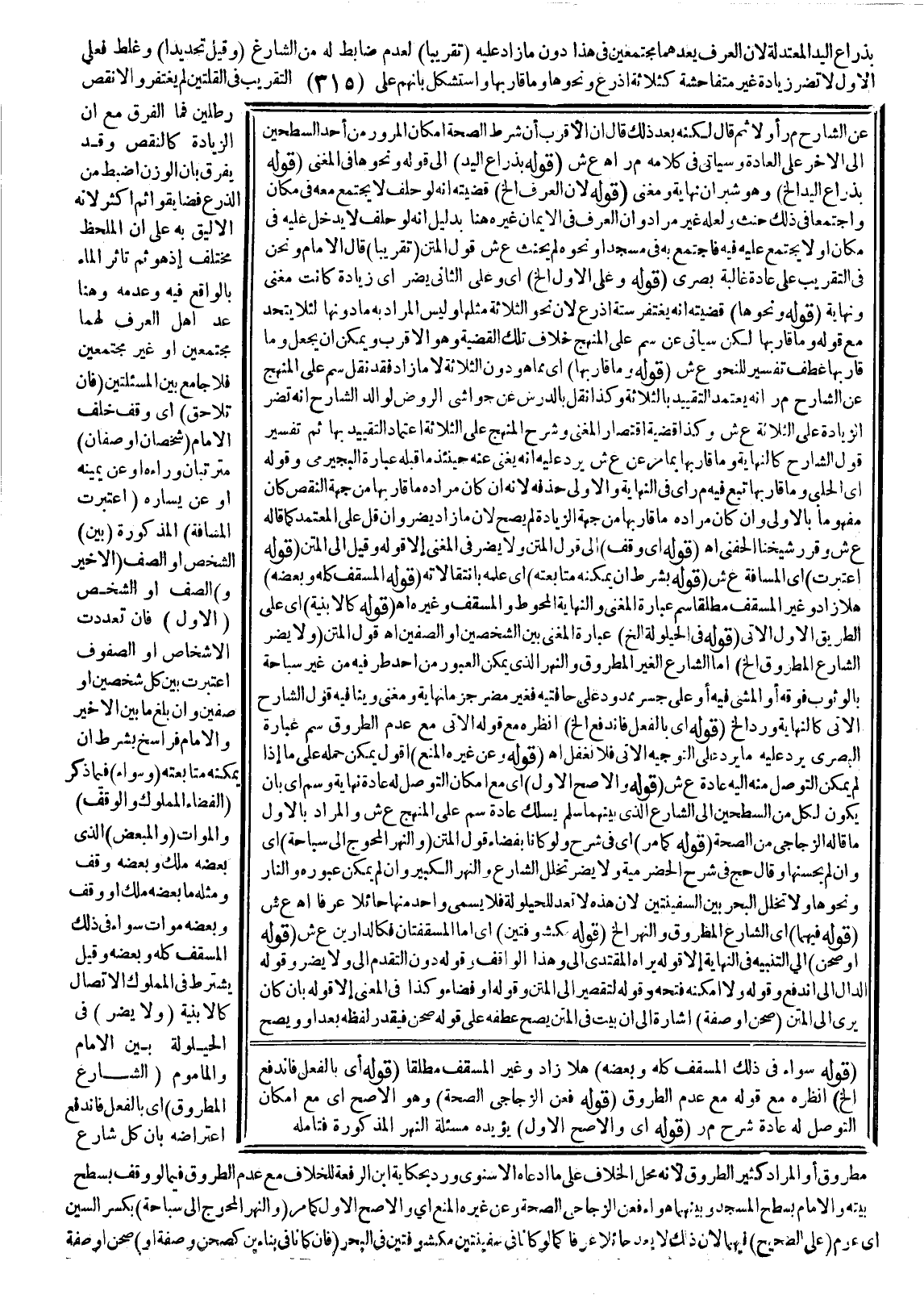 بِذِرَاعِ الْيَدِ الْمُعْتَدِلَةِ؛ لِأَنَّ الْعُرْفَ يَعُدُّهُمَا مُجْتَمِعَيْنِ فِي هَذَا دُونَ مَا زَادَ عَلَيْهِ (تَقْرِيبًا) لِعَدَمِ ضَابِطٍ لَهُ مِنْ الشَّارِعِ (وَقِيلَ تَحْدِيدًا) وَغَلِطَ فَعَلَى الْأَوَّلِ لَا تَضُرُّ زِيَادَةٌ غَيْرُ مُتَفَاحِشَةٍ كَثَلَاثَةِ أَذْرُعٍ وَنَحْوِهَا وَمَا قَارَبَهَا وَاسْتُشْكِلَ بِأَنَّهُمْ عَلَى التَّقْرِيبِ فِي الْقُلَّتَيْنِ لَمْ يُغْتَفَرْ وَإِلَّا نَقَصَ رِطْلَيْنِ فَمَا الْفَرْقُ مَعَ أَنَّ الزِّيَادَةَ كَالنَّقْصِ وَقَدْ يُفَرَّقُ بِأَنَّ الْوَزْنَ أَضْبَطُ مِنْ الذِّرَاعِ فَضَايَقُوا ثَمَّ أَكْثَرُ لِأَنَّهُ الْأَلْيَقُ بِهِ عَلَى أَنَّ الْمَلْحَظَ مُخْتَلِفٌ إذْ هُوَ ثَمَّ تَأَثُّرُ الْمَاءِ بِالْوَاقِعِ فِيهِ وَعَدَمُهُ وَهُنَا عَدُّ أَهْلِ الْعُرْفِ لَهُمَا مُجْتَمِعَيْنِ أَوْ غَيْرَ مُجْتَمِعَيْنِ فَلَا جَامِعَ بَيْنَ الْمَسْأَلَتَيْنِ.