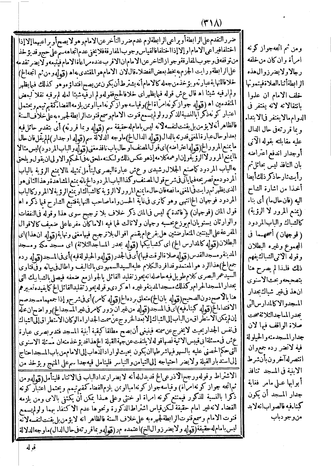 (فَائِدَةٌ) لَيْسَ فِي الْمَتْنِ ذِكْرُ خِلَافٍ بِلَا تَرْجِيحٍ سِوَى هَذَا وَقَوْلُهُ فِي النَّفَقَاتِ، وَالْوَارِثَانِ يَسْتَوِيَانِ أَمْ يُوَزَّعُ بِحَسَبِهِ وَجْهَانِ وَلَا ثَالِثَ لَهُمَا فِيهِ إلَّا مَا كَانَ مُفَرَّعًا عَلَى ضَعِيفٍ كَالْأَقْوَالِ الْمُفَرَّعَةِ عَلَى الْبَيِّنَتَيْنِ الْمُتَعَارِضَتَيْنِ هَلْ يُقْرَعُ أَمْ يُقْسَمُ أَقْوَالٌ بِلَا تَرْجِيحٍ فِيهَا مُغْنِي وَنِهَايَةٌ (قَوْلُهُ: أَنَّ هَذَا) أَيْ الْبُطْلَانَ (قَوْلُهُ: كَالْمَدَارِسِ إلَخْ) أَيْ كَشَبَابِيكِهَا (قَوْلُهُ: بِجُدُرِ الْمَسَاجِدِ الثَّلَاثَةِ) أَيْ مَسْجِدِ مَكَّةَ وَمَسْجِدِ الْمَدِينَةِ وَمَسْجِدِ الْقُدْسِ (قَوْلُهُ: صَلَاةُ الْوَاقِفِ فِيهَا) أَيْ فِي الْجُدُرِ (قَوْلُهُ: وَالْحَيْلُولَةُ فِيهِ) أَيْ فِي الْمَسْجِدِ (قَوْلُهُ: رَدَّهُ جَمْعٌ إلَخْ) هَذَا الرَّدُّ هُوَ الْمُعْتَمَدُ وَقَدْ أَفْرَدَ الْكَلَامَ عَلَيْهِ السَّيِّدُ السَّمْهُودِيُّ بِالتَّأْلِيفِ وَأَطَالَ فِي بَيَانِهِ وَفِي فَتَاوَى السَّيِّدِ عُمَرَ الْبَصْرِيِّ كَلَامٌ طَوِيلٌ فِيهِ حَاصِلُهُ أَنَّهُ يَجُوزُ تَقْلِيدُ الْقَائِلِ بِالْجَوَازِ مَعَ ضَعْفِهِ فَيُصَلِّي بِالشَّبَابِيكِ الَّتِي بِجِدَارِ الْمَسْجِدِ الْحَرَامِ وَكَذَلِكَ مَسْجِدُ الْمَدِينَةِ وَغَيْرُهُ اهـ كُرْدِيٌّ وَقَوْلُهُ يَجُوزُ تَقْلِيدُ الْقَائِلِ إلَخْ أَيْ كَمَا يُفِيدُهُ تَعْبِيرُهُمْ هُنَا بِالْأَصَحِّ دُونَ الصَّحِيحِ