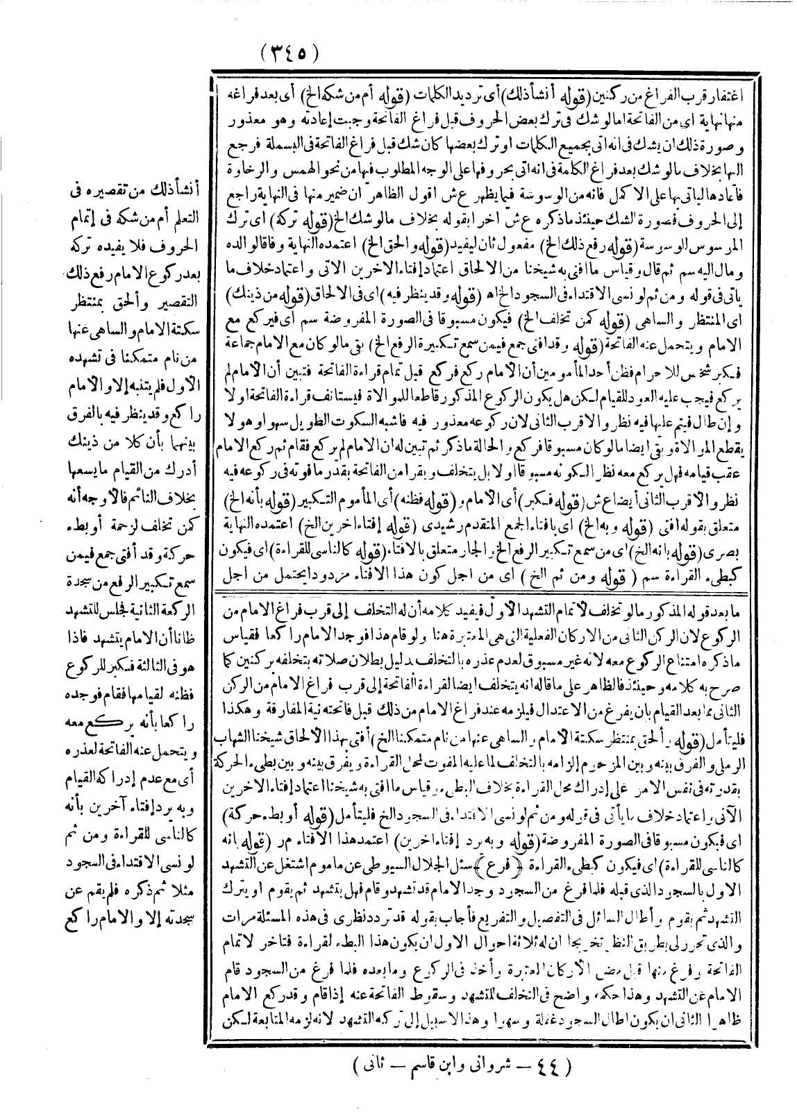 أَنَشَأَ ذَلِكَ مِنْ تَقْصِيرِهِ فِي التَّعَلُّمِ أَمْ مِنْ شَكِّهِ فِي إتْمَامِ الْحُرُوفِ فَلَا يُفِيدُهُ تَرْكُهُ بَعْدَ رُكُوعِ الْإِمَامِ رُفِعَ ذَلِكَ التَّقْصِيرُ وَأُلْحِقَ بِمُنْتَظِرِ سَكْتَةِ الْإِمَامِ وَالسَّاهِي عَنْهَا مَنْ نَامَ مُتَمَكِّنًا فِي تَشَهُّدِهِ الْأَوَّلِ فَلَمْ يَتَنَبَّهْ إلَّا، وَالْإِمَامُ رَاكِعٌ وَقَدْ يُنْظَرُ فِيهِ بِالْفَرْقِ بَيْنَهُمَا بِأَنَّ كُلًّا مِنْ ذَيْنِك أَدْرَكَ مِنْ الْقِيَامِ مَا يَسَعُهَا بِخِلَافِ النَّائِمِ فَالْأَوْجَهُ أَنَّهُ كَمَنْ تَخَلَّفَ لِزَحْمَةٍ أَوْ بُطْءِ حَرَكَةٍ وَقَدْ أَفْتَى جَمْعٌ فِيمَنْ سَمِعَ تَكْبِيرَ الرَّفْعِ مِنْ سَجْدَةِ الرَّكْعَةِ الثَّانِيَةِ فَجَلَسَ لِلتَّشَهُّدِ ظَانًّا أَنَّ الْإِمَامَ يَتَشَهَّدُ، فَإِذَا هُوَ فِي الثَّالِثَةِ فَكَبَّرَ لِلرُّكُوعِ فَظَنَّهُ لِقِيَامِهَا فَقَامَ فَوَجَدَهُ رَاكِعًا بِأَنَّهُ يَرْكَعُ مَعَهُ وَيَتَحَمَّلُ عَنْهُ الْفَاتِحَةَ لِعُذْرِهِ أَيْ مَعَ عَدَمِ إدْرَاكِهِ الْقِيَامَ وَبِهِ يُرَدُّ إفْتَاءُ آخَرِينَ بِأَنَّهُ كَالنَّاسِي لِلْقِرَاءَةِ وَمِنْ ثَمَّ لَوْ نَسِيَ الِاقْتِدَاءَ فِي السُّجُودِ مَثَلًا ثُمَّ ذَكَرَهُ فَلَمْ يَقُمْ عَنْ سَجَدْتِهِ إلَّا، وَالْإِمَامُ رَاكِعٌ