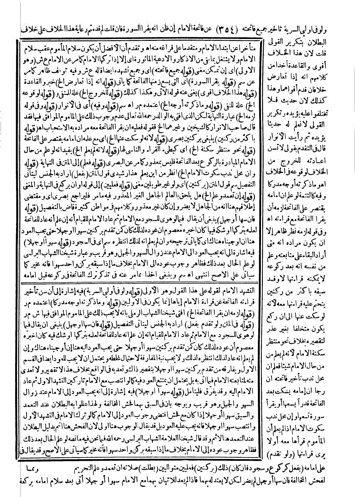 وَلَوْ فِي أَوَّلِيِّ السِّرِّيَّةِ تَأْخِيرُ جَمِيعِ فَاتِحَتِهِ عَنْ فَاتِحَةِ الْإِمَامِ إنْ ظَنَّ أَنَّهُ يَقْرَأُ السُّورَةَ، فَإِنْ قُلْت لِمَ قَدَّمْتُمْ رِعَايَةَ هَذَا الْخِلَافِ عَلَى خِلَافِ الْبُطْلَانِ بِتَكْرِيرِ الْقَوْلِيِّ قُلْت؛ لِأَنَّ هَذَا الْخِلَافَ أَقْوَى، وَالْقَاعِدَةُ أَخْذًا مِنْ كَلَامِهِمْ أَنَّهُ إذَا تَعَارَضَ خِلَافَانِ قُدِّمَ أَقْوَاهُمَا وَهَذَا كَذَلِكَ؛ لِأَنَّ حَدِيثَ «فَلَا تَخْتَلِفُوا عَلَيْهِ» يُؤَيِّدُهُ وَتَكْرِيرُ الْقَوْلِيِّ لَا نَعْلَمُ لَهُ حَدِيثًا يُؤَيِّدُهُ ثُمَّ رَأَيْت الْأَنْوَارَ قَالَ فِي التَّقَدُّمِ بِقَوْلِي لَا تُسَنُّ إعَادَتُهُ لِلْخُرُوجِ مِنْ الْخِلَافِ لِوُقُوعِهِ فِي الْخِلَافِ اهـ.