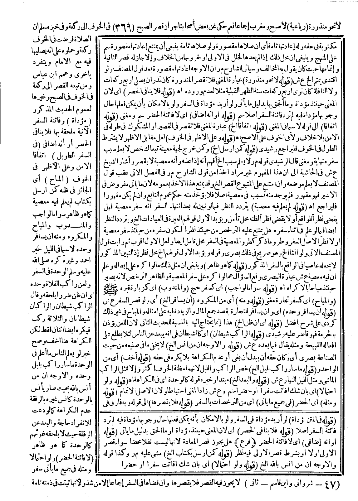 لَا نَحْوُ مَنْذُورَةٍ (رُبَاعِيَّةٌ) لَا صُبْحٌ وَمَغْرِبٌ إجْمَاعًا نَعَمْ حُكِيَ عَنْ بَعْضِ أَصْحَابِنَا جَوَازُ قَصْرِ الصُّبْحِ فِي الْخَوْفِ إلَى رَكْعَةٍ وَفِي خَبَرِ مُسْلِمٍ «إنَّ الصَّلَاةَ فُرِضَتْ فِي الْخَوْفِ رَكْعَةً» وَحَمَلُوهُ عَلَى أَنَّهُ يُصَلِّيهَا فِيهِ مَعَ الْإِمَامِ وَيَنْفَرِدُ بِأُخْرَى وَعَمَّمَ ابْنُ عَبَّاسٍ وَمَنْ تَبِعَهُ الْقَصْرَ إلَى رَكْعَةٍ فِي الْخَوْفِ فِي الصُّبْحِ وَغَيْرِهَا لِعُمُومِ الْحَدِيثِ الْمَذْكُورِ (مُؤَدَّاةٌ) وَفَائِتَةُ السَّفَرِ الْآتِيَةِ مُلْحَقَةٌ بِهَا فَلَا يُنَافِي الْحَصْرَ أَوْ أَنَّهُ إضَافِيٌّ (فِي السَّفَرِ الطَّوِيلِ) اتِّفَاقًا فِي الْأَمْنِ وَعَلَى الْأَظْهَرِ فِي الْخَوْفِ (الْمُبَاحِ) أَيْ الْجَائِزِ فِي ظَنِّهِ كَمَنْ أَرْسَلَ بِكِتَابٍ لَمْ يَعْلَمْ فِيهِ مَعْصِيَةً كَمَا هُوَ ظَاهِرٌ سَوَاءٌ الْوَاجِبُ، وَالْمَنْدُوبُ، وَالْمُبَاحُ وَالْمَكْرُوهُ وَمِنْهُ أَنْ يُسَافِرَ وَحْدَهُ لَا سِيَّمَا فِي اللَّيْلِ لِخَبَرِ أَحْمَدَ وَغَيْرِهِ «كُرِهَ - صَلَّى اللَّهُ عَلَيْهِ وَسَلَّمَ - الْوَحْدَةُ فِي السَّفَرِ وَلُعِنَ رَاكِبُ الْفَلَاةِ وَحْدَهُ» أَيْ إنْ ظَنَّ ضَرَرًا يَلْحَقُهُ وَقَالَ: «الرَّاكِبُ شَيْطَانٌ، وَالرَّاكِبَانِ شَيْطَانَانِ وَالثَّلَاثَةُ رَكْبٌ» فَيُكْرَهُ أَيْضًا اثْنَانِ فَقَطْ لَكِنَّ الْكَرَاهَةَ هُنَا أَخَفُّ وَصَحَّ خَبَرُ «لَوْ يَعْلَمُ النَّاسُ مَا أَعْلَمُ فِي الْوَحْدَةِ مَا سَارَ رَاكِبٌ بِلَيْلٍ وَحْدَهُ» وَالْأَوْجَهُ أَنَّ مَنْ أَنِسَ بِاَللَّهِ بِحَيْثُ صَارَ يَأْنَسُ بِالْوَحْدَةِ كَأُنْسِ غَيْرِهِ بِالرُّفْقَةِ عَدَمُ الْكَرَاهَةِ كَمَا لَوْ دَعَتْ لِلِانْفِرَادِ حَاجَةٌ وَالْبُعْدُ عَنْ الرُّفْقَةِ حَيْثُ لَا يَلْحَقُهُ غَوْثُهُمْ كَالْوَحْدَةِ كَمَا هُوَ ظَاهِرٌ (لَا فَائِتَةُ الْحَضَرِ) وَلَوْ احْتِمَالًا وَمِثْلُهُ فِي جَمِيعِ مَا يَأْتِي سَفَرٌ لَا يَجُوزُ فِيهِ الْقَصْرُ فَلَا يَقْصُرُهَا، وَإِنْ قَضَاهَا فِي السَّفَرِ إجْمَاعًا إلَّا مَنْ شَذَّ وَلِأَنَّهَا ثَبَتَتْ فِي ذِمَّتِهِ تَامَّةً