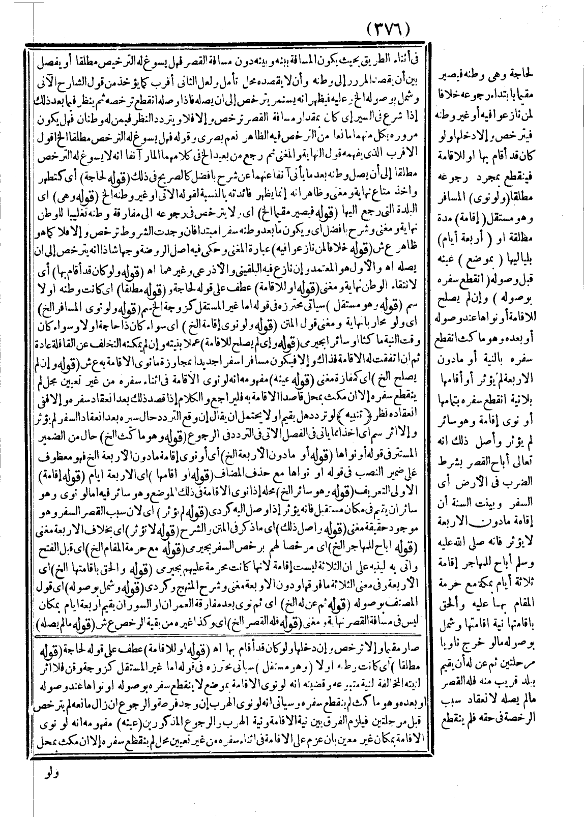 لِحَاجَةٍ وَهِيَ وَطَنُهُ فَيَصِيرُ مُقِيمًا بِابْتِدَاءِ رُجُوعِهِ خِلَافًا لِمَنْ نَازَعُوا فِيهِ أَوْ غَيْرَ وَطَنِهِ فَيَتَرَخَّصُ، وَإِنْ دَخَلَهَا وَلَوْ كَانَ قَدْ أَقَامَ بِهَا أَوْ لِلْإِقَامَةِ فَيَنْقَطِعُ بِمُجَرَّدِ رُجُوعِهِ مُطْلَقًا.