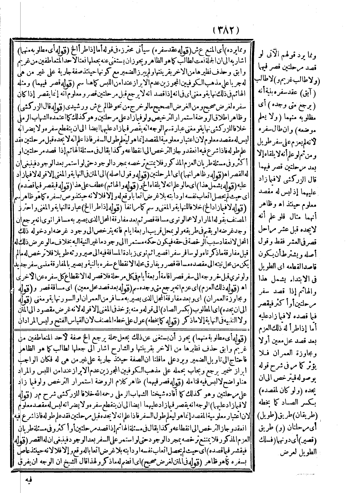 (قَوْلُهُ: قَالَ الزَّرْكَشِيُّ إلَخْ) وَظَاهِرُ إطْلَاقِ الرَّوْضَةِ اسْتِمْرَارُ التَّرَخُّصِ وَلَوْ فِيمَا زَادَ عَلَى مَرْحَلَتَيْنِ وَهُوَ كَذَلِكَ كَمَا اعْتَمَدَهُ الشِّهَابُ الرَّمْلِيُّ خِلَافًا لِلزَّرْكَشِيِّ نِهَايَةٌ وَمُغْنِي عِبَارَةُ سم الْوَجْهُ أَنَّهُ يَقْصُرُ فِيمَا زَادَ عَلَيْهِمَا أَيْضًا إلَى أَنْ يَنْقَطِعَ سَفَرُهُ وَلَا يَضُرُّ أَنَّهُ لَيْسَ لَهُ مَقْصِدٌ مَعْلُومٌ وَلِأَنَّ اعْتِبَارَ مَعْلُومِيَّةِ الْمَقْصِدِ إنَّمَا هُوَ لِيَعْلَمَ طُولَ السَّفَرِ، فَإِذَا عَلِمَ أَنَّهُ لَا يَجِدُهُ قَبْلَ مَرْحَلَتَيْنِ فَقَدْ عَلِمَ طُولَهُ فَإِذَا شَرَعَ فِيهِ انْعَقَدَ وَجَازَ التَّرَخُّصُ إلَى انْقِطَاعِهِ وَكَذَا يُقَالُ فِي مَسْأَلَةِ الْهَائِمِ إذَا قَصَدَ مَرْحَلَتَيْنِ أَوْ أَكْثَرَ وَفِي مَسْأَلَةِ طَرَيَان الْعَزْمِ الْمَذْكُورِ فَلَا يَمْتَنِعُ تَرَخُّصُهُ بِمُجَرَّدِ الْوُجُودِ حَتَّى لَوْ اسْتَمَرَّ بَعْدَ الْوُجُودِ فَيَنْبَغِي أَنَّ لَهُ الْقَصْرَ. اهـ. (قَوْلُهُ وَظَاهِرٌ أَنَّهُمَا إلَخْ) أَيْ الْمَرْحَلَتَيْنِ (قَوْلُهُ: وَقَوْلُ أَصْلِهِ) إلَى الْمَتْنِ فِي النِّهَايَةِ، وَالْمُغْنِي إلَّا قَوْلَهُ لَا فِيمَا زَادَ عَلَيْهِ (قَوْلُهُ: يَشْمَلُ هَذَا) أَيْ مَا لَوْ عَلِمَ أَنَّهُ لَا يَلْقَاهُ إلَخْ (وَقَوْلُهُ: وَالْهَائِمُ) عَطْفٌ عَلَى هَذَا (قَوْلُهُ: فَيَقْصُرُ فِيمَا قَصَدَهُ) أَيْ حَيْثُ لَمْ يَحْصُلْ إتْعَابُ نَفْسِهِ أَوْ دَابَّتِهِ بِلَا غَرَضٍ إتْعَابًا لَهُ وَقَعَ وَإِلَّا فَلَا؛ لِأَنَّهُ حِينَئِذٍ عَاصٍ بِسَفَرِهِ كَمَا هُوَ ظَاهِرٌ سم