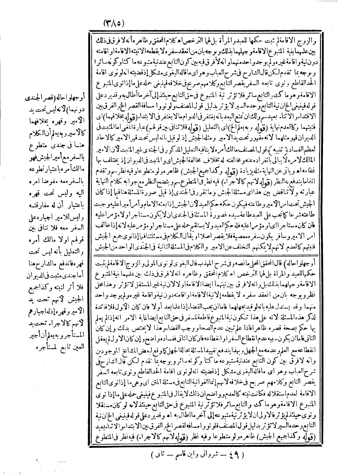 فَإِنْ كَانَ الثَّانِيَ فَفَسَادُهُ وَاضِحٌ، وَإِنْ كَانَ الْأَوَّلَ لَمْ يَعْقِلْ انْقِطَاعَهُ مَعَ الْعِلْمِ وَعَدَمِهِ مَعَ الْجَهْلِ وَبِهَذَا يَنْدَفِعُ تَقْيِيدُ الْمَسْأَلَةِ بِحَالَةِ الْجَهْلِ كَمَا وَقَعَ لِبَعْضِ الْمَشَايِخِ الْمَوْجُودِينَ وَأَنَّهُ لَا فَرْقَ بَيْنَ كَوْنِ التَّابِعِ عِنْدَ نِيَّةِ مَتْبُوعِهِ مَاكِثًا وَكَوْنِهِ سَائِرًا وَيُوَجَّهُ بِمَا تَقَدَّمَ لَكِنْ قَالَ الشَّارِحُ فِي شَرْحِ الْعُبَابِ وَهُوَ أَيْ مَا قَالَهُ الْبَغَوِيّ مُشْكِلٌ إذْ قَضِيَّتُهُ أَنَّهُ لَوْ نَوَى إقَامَةَ الْحَدِّ الْقَاطِعِ وَنَوَى تَابِعُهُ السَّفَرَ يَقْصُرُ التَّابِعُ وَكَلَامُهُمْ صَرِيحٌ فِي خِلَافِهِ؛ لِأَنَّهُمْ إنَّمَا أَلْغَوْا نِيَّةَ التَّابِعِ فِي مَسْأَلَةِ الْمَتْنِ أَيْ وَهِيَ مَا إذَا نَوَى التَّابِعُ الْإِقَامَةَ لِعَدَمِ اسْتِقْلَالِهِ فَكَانَتْ نِيَّتُهُ كَالْعَدَمِ وَوَاضِحٌ أَنَّ ذَلِكَ لَا يُقَالُ فِي الْمَتْبُوعِ فَيَنْبَغِي حَمْلُهُ عَلَى مَا إذَا نَوَى الْمَتْبُوعُ الْإِقَامَةَ وَهُوَ مَاكِثٌ، وَالتَّابِعُ سَائِرٌ فَلَا تُؤَثِّرُ نِيَّةُ الْمَتْبُوعِ فِي حَقِّ التَّابِعِ حِينَئِذٍ؛ لِأَنَّهُ لَوْ كَانَ مُسْتَقِلًّا وَنَوَى حِينَئِذٍ لَمْ يُؤَثِّرْ فَالْأَوْلَى أَنْ لَا يُؤَثِّرَ نِيَّةُ مَتْبُوعِهِ إلَى آخِرِ مَا أَطَالَ بِهِ. اهـ. وَقَدْ يُرَدُّ عَلَى قَوْلِهِ فَيَنْبَغِي إلَخْ أَنَّ نِيَّةَ التَّابِعِ وَحْدَهُ السَّيْرَ لَا تُؤَثِّرُ بِدَلِيلِ قَوْلِ الْمُصَنِّفِ فَلَوْ نَوَوْا مَسَافَةً لِقَصْرِ إلَخْ، وَالْفَرْقُ بَيْنَ الِابْتِدَاءِ وَالْأَثْنَاءِ بَعِيدٌ.