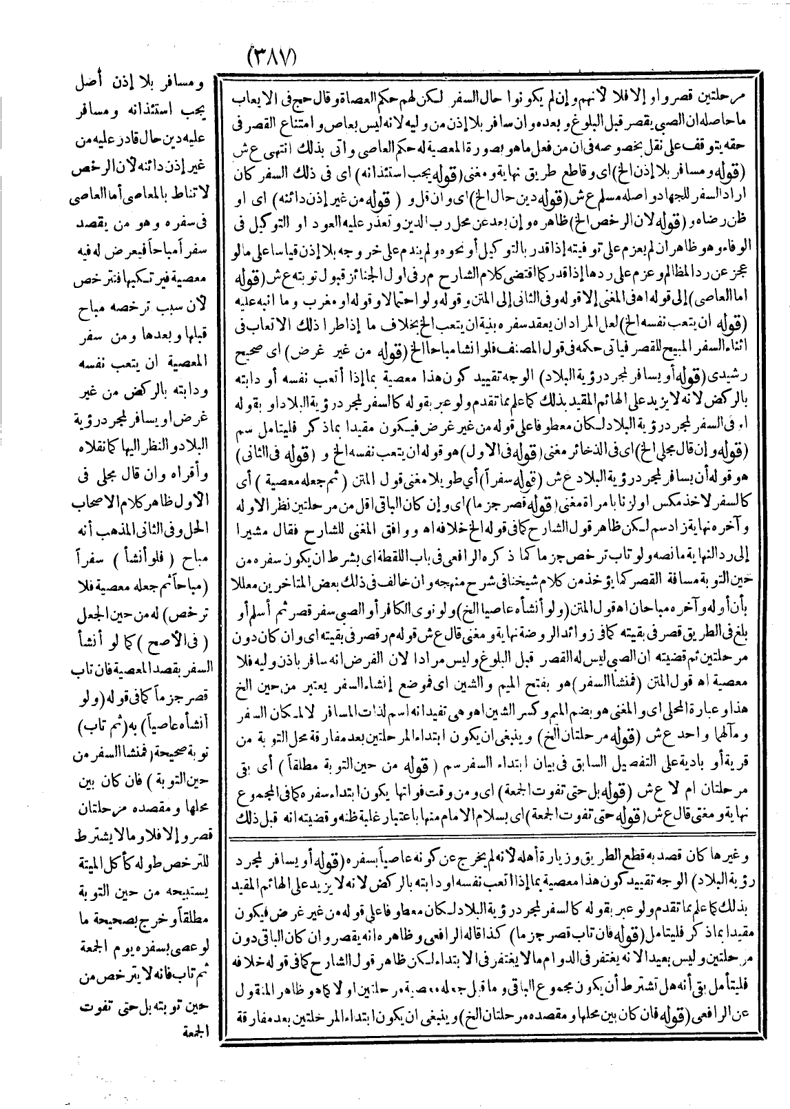 ـــــــــــــــــــــــــــــQمَرْحَلَتَيْنِ قَصَرُوا وَإِلَّا فَلَا؛ لِأَنَّهُمْ، وَإِنْ لَمْ يَكُونُوا عُصَاةً حَالَ السَّفَرِ لَكِنْ لَهُمْ حُكْمُ الْعُصَاةِ وَقَالَ حَجّ فِي الْإِيعَابِ مَا حَاصِلُهُ أَنَّ الصَّبِيَّ يَقْصُرُ قَبْلَ الْبُلُوغِ وَبَعْدَهُ، وَإِنْ سَافَرَ بِلَا إذْنٍ مِنْ وَلِيِّهِ؛ لِأَنَّهُ لَيْسَ بِعَاصٍ وَامْتِنَاعُ الْقَصْرِ فِي حَقِّهِ يَتَوَقَّفُ عَلَى نَقْلٍ بِخُصُوصِهِ فِي أَنَّ مَنْ فَعَلَ مَا هُوَ بِصُورَةِ الْمَعْصِيَةِ لَهُ حُكْمُ الْعَاصِي وَأَتَى بِذَلِكَ انْتَهَى اهـ ع ش (قَوْلُهُ: وَمُسَافِرٌ بِلَا إذْنٍ إلَخْ) أَيْ وَقَاطِعُ طَرِيقٍ نِهَايَةٌ وَمُغْنِي (قَوْلُهُ: يَجِبُ اسْتِئْذَانُهُ) أَيْ فِي ذَلِكَ السَّفَرِ كَأَنْ أَرَادَ السَّفَرَ لِلْجِهَادِ وَأَصْلُهُ مُسْلِمٌ ع ش.