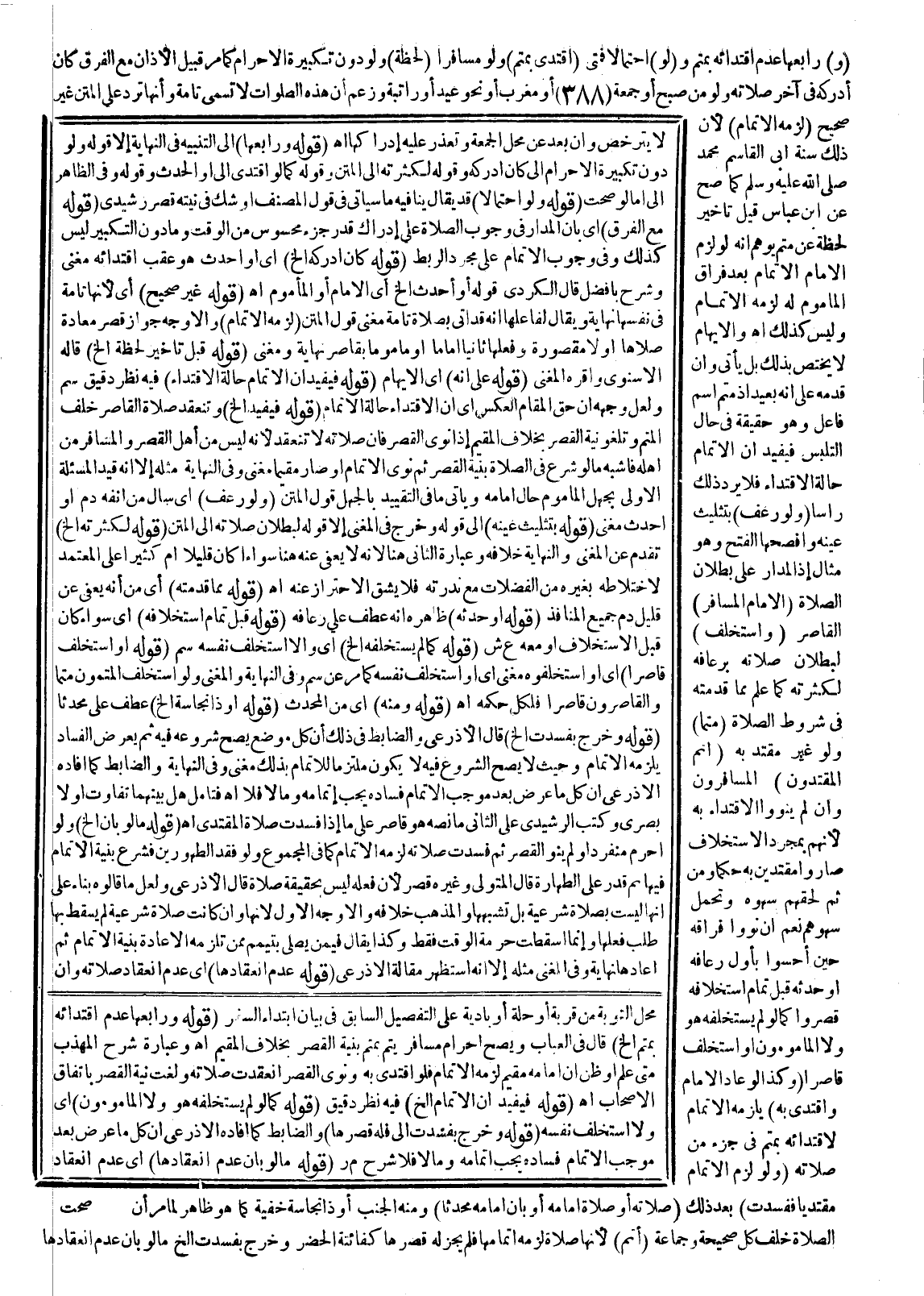 (وَ) رَابِعُهَا عَدَمُ اقْتِدَائِهِ بِمُتِمٍّ وَ (لَوْ) احْتِمَالًا فَمَتَى (اقْتَدَى بِمُتِمٍّ) وَلَوْ مُسَافِرًا (لَحْظَةً) وَلَوْ دُونَ تَكْبِيرَةِ الْإِحْرَامِ كَمَا مَرَّ قُبَيْلَ الْأَذَانِ مَعَ الْفَرْقِ كَأَنْ أَدْرَكَهُ فِي آخِرِ صَلَاتِهِ وَلَوْ مِنْ صُبْحٍ أَوْ جُمُعَةٍ أَوْ مَغْرِبٍ أَوْ نَحْوِ عِيدٍ أَوْ رَاتِبَةٍ وَزَعَمَ أَنَّ هَذِهِ الصَّلَوَاتِ لَا تُسَمَّى تَامَّةً وَأَنَّهَا تُرَدُّ عَلَى الْمَتْنِ غَيْرُ صَحِيحٍ (لَزِمَهُ الْإِتْمَامُ) ؛ لِأَنَّ ذَلِكَ سُنَّةُ أَبِي الْقَاسِمِ مُحَمَّدٍ - صَلَّى اللَّهُ عَلَيْهِ وَسَلَّمَ - كَمَا صَحَّ عَنْ ابْنِ عَبَّاسٍ قِيلَ تَأْخِيرُ لَحْظَةٍ عَنْ مُتِمٍّ يُوهِمُ أَنَّهُ لَوْ لَزِمَ الْإِمَامَ الْإِتْمَامُ بَعْدَ فِرَاقِ الْمَأْمُومِ لَهُ لَزِمَهُ الْإِتْمَامُ وَلَيْسَ كَذَلِكَ اهـ، وَالْإِيهَامُ لَا يَخْتَصُّ بِذَلِكَ بَلْ يَأْتِي، وَإِنْ قَدَّمَهُ عَلَى أَنَّهُ بَعِيدٌ إذْ مُتِمٌّ اسْمُ فَاعِلٍ وَهُوَ حَقِيقَةٌ فِي حَالِ التَّلَبُّسِ فَيُفِيدُ أَنَّ الْإِتْمَامَ حَالَةَ الِاقْتِدَاءِ فَلَا يُرَدُّ ذَلِكَ رَأْسًا.