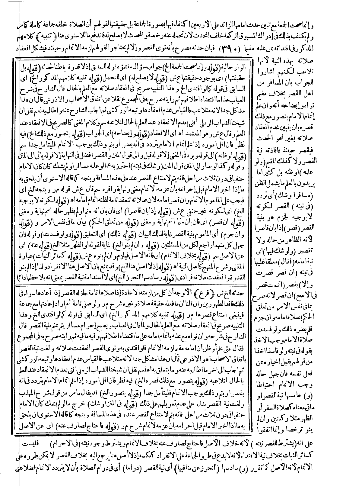 (وَ) خَامِسُهَا نِيَّةُ الْقَصْرِ أَوْ مَا فِي مَعْنَاهُ كَصَلَاةِ السَّفَرِ أَوْ الظُّهْرِ مَثَلًا رَكْعَتَيْنِ، وَإِنْ لَمْ يَنْوِ تَرَخُّصًا، وَإِنَّمَا اتَّفَقُوا عَلَى أَنَّهُ (يُشْتَرَطُ لِلْقَصْرِ نِيَّةٌ) ؛ لِأَنَّهُ خِلَافُ الْأَصْلِ فَاحْتَاجَ لِصَارِفٍ عَنْهُ بِخِلَافِ الْإِتْمَامِ وَيُشْتَرَطُ وُجُودُ نِيَّتِهِ (فِي الْإِحْرَامِ) كَسَائِرِ النِّيَّاتِ بِخِلَافِ نِيَّةِ الِاقْتِدَاءِ؛ لِأَنَّهُ لَا بِدَعَ فِي طُرُوُّ الْجَمَاعَةِ عَلَى الِانْفِرَادِ كَعَكْسِهِ إذْ لَا أَصْلَ هُنَا يُرْجَعُ إلَيْهِ بِخِلَافِ الْقَصْرِ لَا يُمْكِنُ طُرُوُّهُ عَلَى الْإِتْمَامِ؛ لِأَنَّهُ الْأَصْلُ كَمَا تَقَرَّرَ.