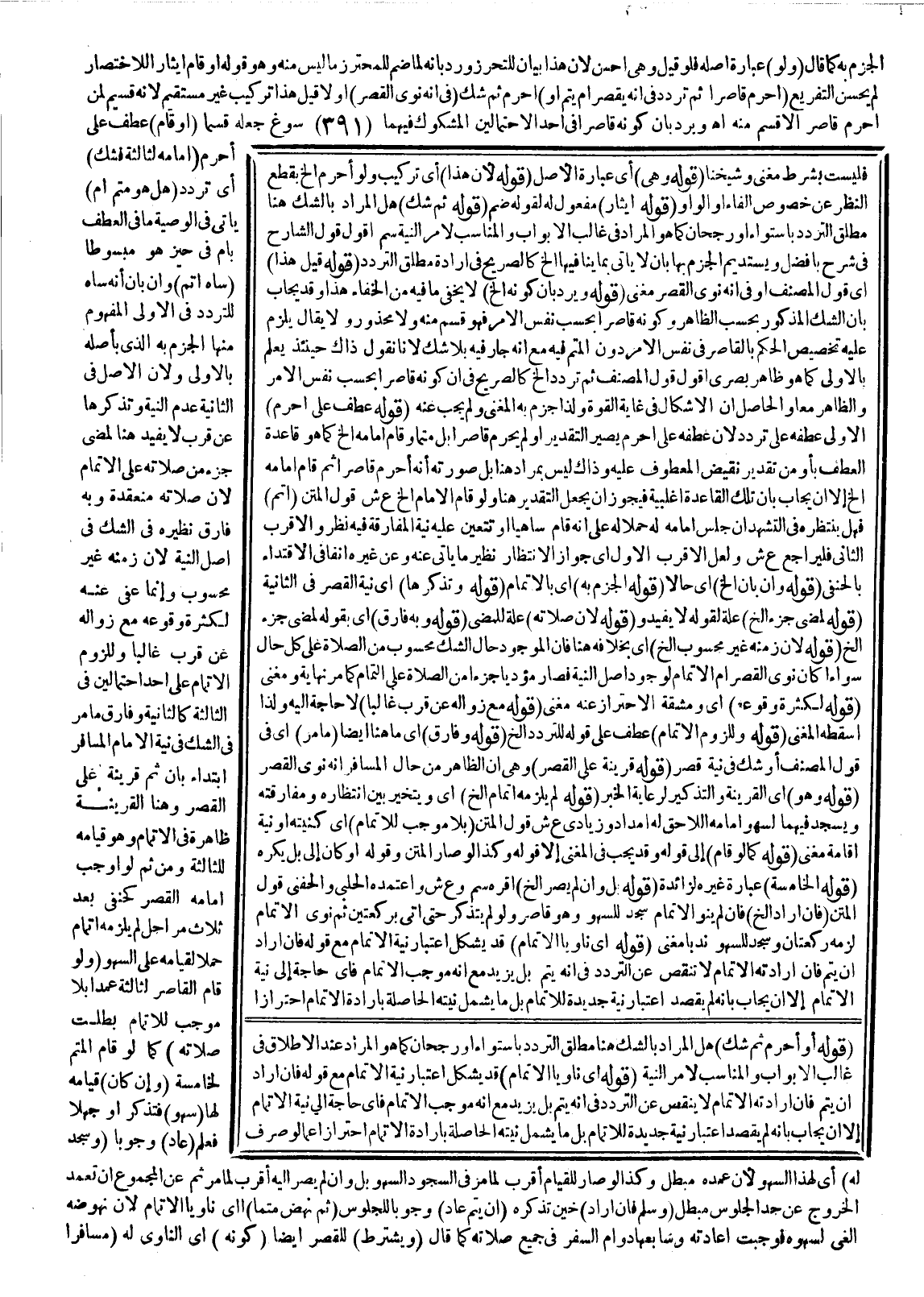 الْجَزْمِ بِهِ كَمَا قَالَ (وَلَوْ) عِبَارَةُ أَصْلِهِ فَلَوْ قِيلَ وَهِيَ أَحْسَنُ؛ لِأَنَّ هَذَا بَيَانٌ لِلتَّحَرُّزِ وَرُدَّ بِأَنَّهُ لَمَّا ضَمَّ لِلْمُحْتَرِزِ مَا لَيْسَ مِنْهُ وَهُوَ قَوْلُهُ أَوْ قَامَ إيثَارًا لِلِاخْتِصَارِ لَمْ يَحْسُنْ التَّفْرِيعُ (أَحْرَمَ قَاصِرًا ثُمَّ تَرَدَّدَ فِي أَنَّهُ يَقْصُرُ أَمْ يُتِمُّ أَوْ) أَحْرَمَ ثُمَّ شَكَّ (فِي أَنَّهُ نَوَى الْقَصْرَ) أَوْ لَا قِيلَ هَذَا تَرْكِيبٌ غَيْرُ مُسْتَقِيمٍ لِأَنَّهُ قَسِيمٌ لِمَنْ أَحْرَمَ قَاصِرًا لَا قِسْمٌ مِنْهُ اهـ وَيُرَدُّ بِأَنَّ كَوْنَهُ قَاصِرًا فِي أَحَدِ الِاحْتِمَالَيْنِ الْمَشْكُوكِ فِيهِمَا سَوَّغَ جَعْلَهُ قِسْمًا (أَوْ قَامَ) عَطْفٌ عَلَى أَحْرَمَ (إمَامُهُ لِثَالِثَةٍ فَشَكَّ) أَيْ تَرَدَّدَ (هَلْ هُوَ مُتِمٌّ أَمْ) يَأْتِي فِي الْوَصِيَّةِ مَا فِي الْعَطْفِ بِأَمْ فِي حَيِّزِ هُوَ مَبْسُوطًا (سَاهٍ أَتَمَّ)