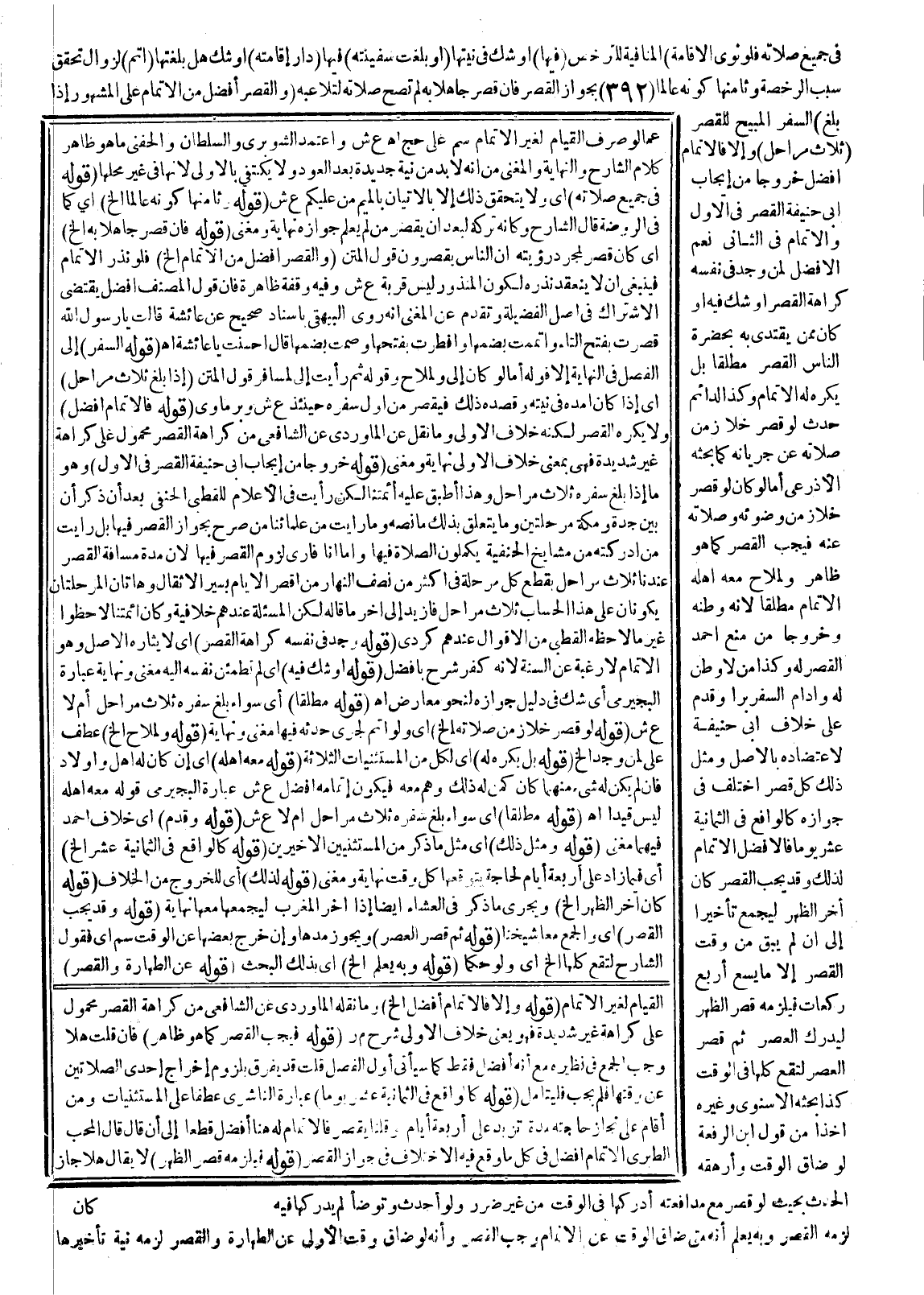 (قَوْلُهُ: وَإِلَّا فَالْإِتْمَامُ أَفْضَلُ إلَخْ) وَمَا نَقَلَهُ الْمَاوَرْدِيُّ عَنْ الشَّافِعِيِّ مِنْ كَرَاهَةِ الْقَصْرِ مَحْمُولٌ عَلَى كَرَاهَةٍ غَيْرِ شَدِيدَةٍ فَهُوَ يَعْنِي خِلَافَ الْأَوْلَى شَرْحُ م ر (قَوْلُهُ: فَيَجِبُ الْقَصْرُ كَمَا هُوَ ظَاهِرٌ) ، فَإِنْ قُلْت هَلَّا وَجَبَ الْجَمْعُ فِي نَظِيرِهِ مَعَ أَنَّهُ أَفْضَلُ فَقَطْ كَمَا سَيَأْتِي أَوَّلَ الْفَصْلِ قُلْت قَدْ يُفَرَّقُ بِلُزُومِ إخْرَاجِ إحْدَى الصَّلَاتَيْنِ عَنْ وَقْتِهَا فَلَمْ يَجِبْ فَلْيُتَأَمَّلْ (قَوْلُهُ: كَالْوَاقِعِ فِي الثَّمَانِيَةَ عَشَرَ يَوْمًا) عِبَارَةُ النَّاشِرِيّ عَطْفًا عَلَى الْمُسْتَثْنَيَانِ وَمَنْ أَقَامَ عَلَى نِجَازِ حَاجَتِهِ مُدَّةً تَزِيدُ عَلَى أَرْبَعَةِ أَيَّامٍ وَقُلْنَا يَقْصُرُ فَالْإِتْمَامُ لَهُ هُنَا أَفْضَلُ قَطْعًا إلَى أَنْ قَالَ قَالَ الْمُحِبُّ الطَّبَرِيُّ الْإِتْمَامُ أَفْضَلُ فِي كُلِّ مَا وَقَعَ فِيهِ الِاخْتِلَافُ فِي جَوَازِ الْقَصْرِ. اهـ. (قَوْلُهُ: فَيَلْزَمُهُ قَصْرُ الظُّهْرِ إلَخْ) لَا يُقَالُ هَلَّا جَازَ