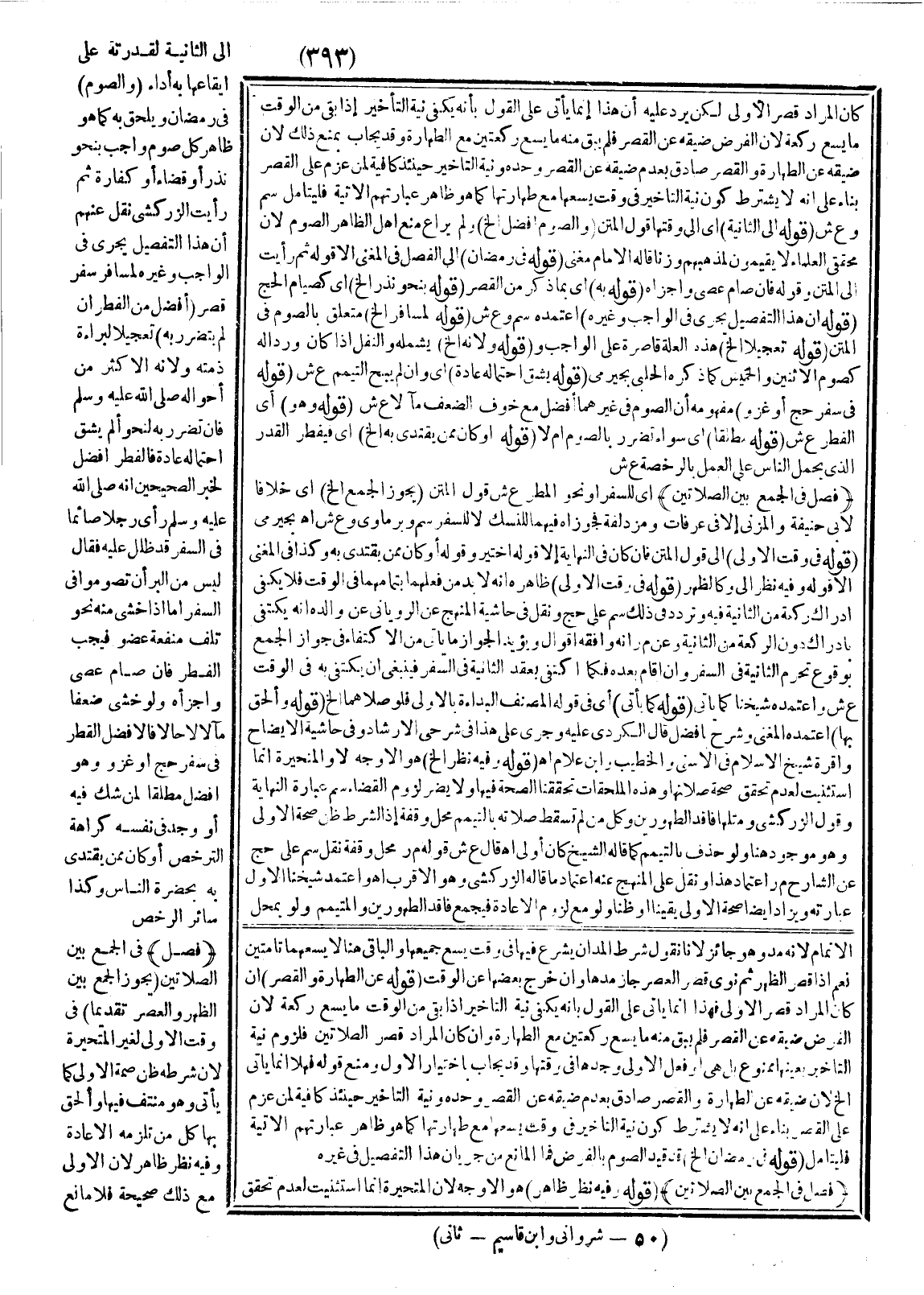 إلَى الثَّانِيَةِ لِقُدْرَتِهِ عَلَى إيقَاعِهَا بِهِ أَدَاءً (وَالصَّوْمُ) فِي رَمَضَانَ وَيُلْحَقُ بِهِ كَمَا هُوَ ظَاهِرٌ كُلُّ صَوْمٍ وَاجِبٍ بِنَحْوِ نَذْرٍ أَوْ قَضَاءٍ أَوْ كَفَّارَةٍ ثُمَّ رَأَيْت الزَّرْكَشِيَّ نَقَلَ عَنْهُمْ أَنَّ هَذَا التَّفْصِيلَ يَجْرِي فِي الْوَاجِبِ وَغَيْرِهِ لِمُسَافِرٍ سَفَرَ قَصْرٍ (أَفْضَلُ مِنْ الْفِطْرِ إنْ لَمْ يَتَضَرَّرْ بِهِ) تَعْجِيلًا لِبَرَاءَةِ ذِمَّتِهِ وَلِأَنَّهُ الْأَكْثَرُ مِنْ أَحْوَالِهِ - صَلَّى اللَّهُ عَلَيْهِ وَسَلَّمَ -، فَإِنْ تَضَرَّرَ بِهِ لِنَحْوِ أَلَمٍ يَشُقُّ احْتِمَالُهُ عَادَةً فَالْفِطْرُ أَفْضَلُ لِخَبَرِ الصَّحِيحَيْنِ «أَنَّهُ - صَلَّى اللَّهُ عَلَيْهِ وَسَلَّمَ - رَأَى رَجُلًا صَائِمًا فِي السَّفَرِ قَدْ ظُلِّلَ عَلَيْهِ فَقَالَ لَيْسَ مِنْ الْبِرِّ أَنْ تَصُومُوا فِي السَّفَرِ» أَمَّا إذَا خَشِيَ مِنْهُ نَحْوَ تَلَفِ مَنْفَعَةِ عُضْوٍ فَيَجِبُ الْفِطْرُ فَمَنْ صَامَ عَصَى وَأَجْزَأَهُ وَلَوْ خَشِيَ ضَعْفًا مَآلًا لَا حَالًّا فَالْأَفْضَلُ الْفِطْرُ فِي سَفَرِ حَجٍّ أَوْ غَزْوٍ وَهُوَ أَفْضَلُ مُطْلَقًا لِمَنْ شَكَّ فِيهِ أَوْ وَجَدَ فِي نَفْسِهِ كَرَاهَةَ التَّرَخُّصِ أَوْ كَانَ مِمَّنْ يُقْتَدَى بِهِ بِحَضْرَةِ النَّاسِ وَكَذَا سَائِرُ الرُّخَصِ.