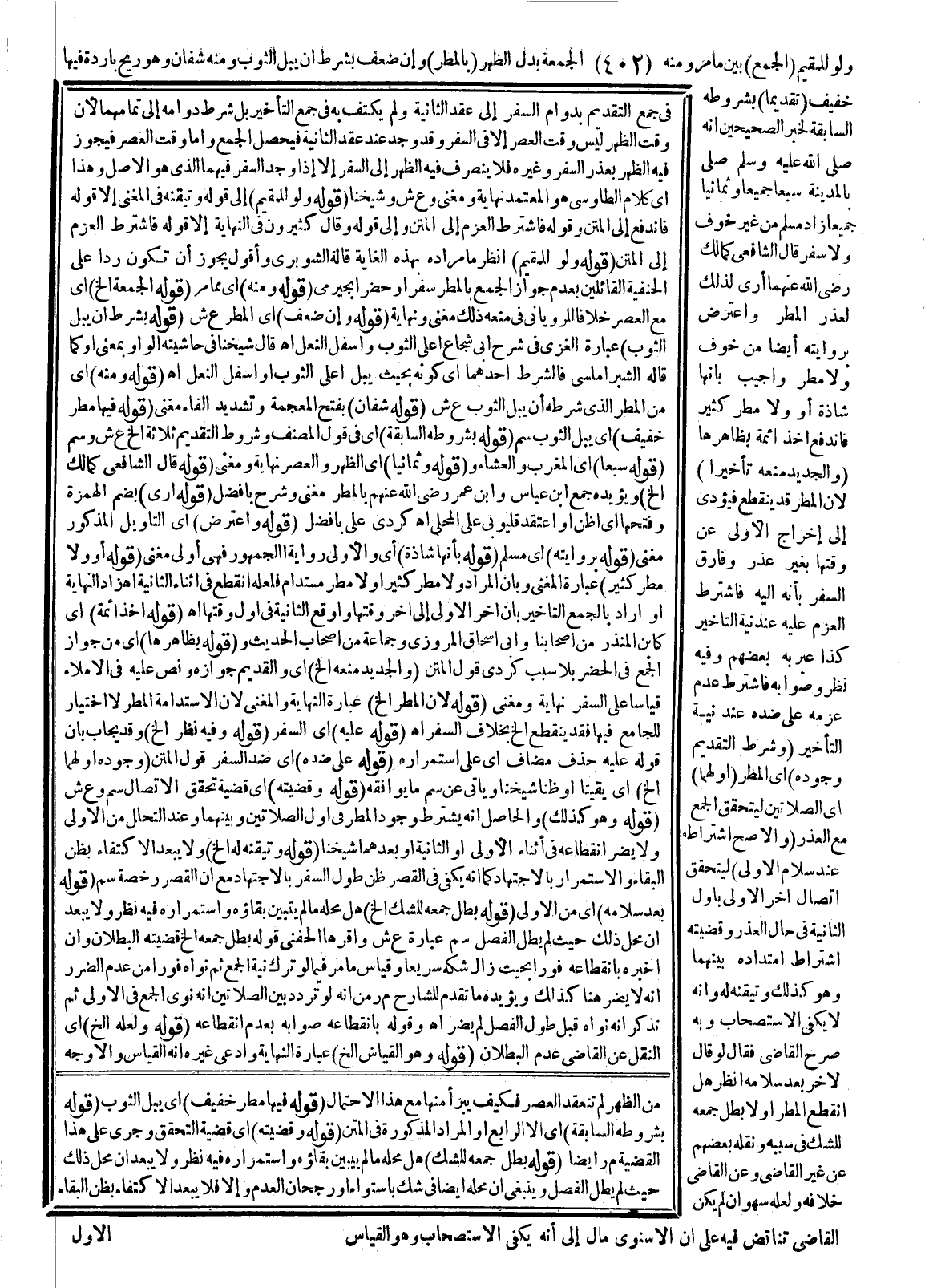 (وَشَرْطُ التَّقْدِيمِ وُجُودُهُ) أَيْ الْمَطَرِ (أَوَّلَهُمَا) أَيْ الصَّلَاتَيْنِ لِيَتَحَقَّقَ الْجَمْعُ مَعَ الْعُذْرِ (وَالْأَصَحُّ اشْتِرَاطُهُ عِنْدَ سَلَامِ الْأُولَى) لِيَتَحَقَّقَ اتِّصَالُ آخِرِ الْأُولَى بِأَوَّلِ الثَّانِيَةِ فِي حَالَةِ الْعُذْرِ وَقَضِيَّتُهُ اشْتِرَاطُ امْتِدَادِهِ بَيْنَهُمَا وهُوَ كَذَلِكَ وَتَيَقُّنُهُ لَهُ وَأَنَّهُ لَا يَكْفِي الِاسْتِصْحَابُ وَبِهِ صَرَّحَ الْقَاضِي فَقَالَ: لَوْ قَالَ لِآخَرَ بَعْدَ سَلَامِهِ اُنْظُرْ هَلْ انْقَطَعَ الْمَطَرُ أَوْ لَا بَطَلَ جَمْعُهُ لِلشَّكِّ فِي سَبَبِهِ. وَنَقَلَهُ بَعْضُهُمْ عَنْ غَيْرِ الْقَاضِي وَعَنْ الْقَاضِي خِلَافُهُ وَلَعَلَّهُ سَهْوٌ إنْ لَمْ يَكُنْ الْقَاضِي تَنَاقَضَ فِيهِ عَلَى أَنَّ الْإِسْنَوِيَّ مَالَ إلَى أَنَّهُ يَكْفِي الِاسْتِصْحَابُ وَهُوَ الْقِيَاسُ