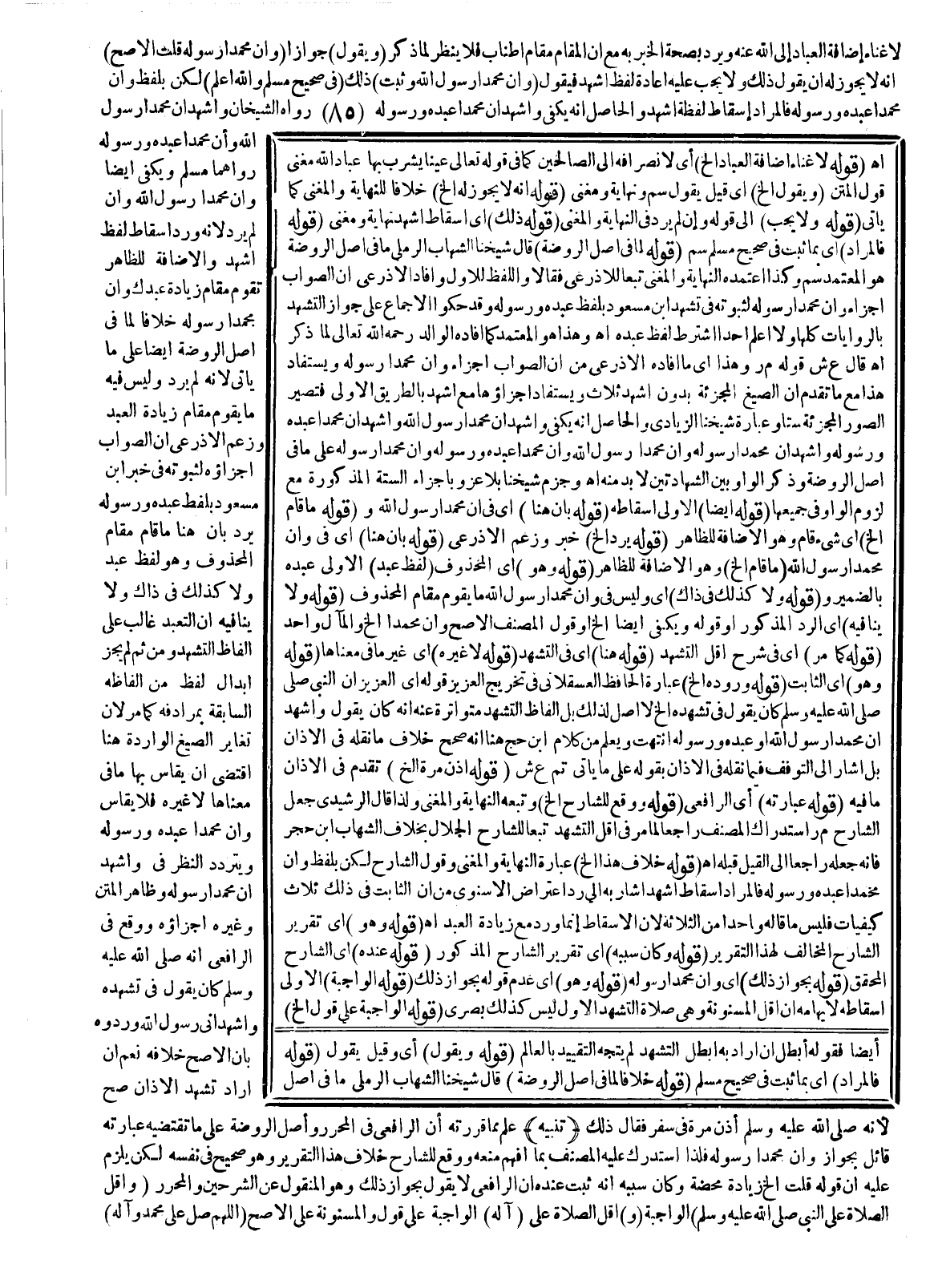 (تَنْبِيهٌ) عُلِمَ مِمَّا قَرَّرْته أَنَّ الرَّافِعِيَّ فِي الْمُحَرَّرِ وَأَصْلِ الرَّوْضَةِ عَلَى مَا تَقْتَضِيهِ عِبَارَتُهُ قَائِلٌ بِجَوَازِ: وَأَنَّ مُحَمَّدًا رَسُولُهُ فَلِذَا اسْتَدْرَكَ عَلَيْهِ الْمُصَنِّفُ بِمَا أَفْهَمَ مَنْعُهُ وَوَقَعَ لِلشَّارِحِ خِلَافُ هَذَا التَّقْرِيرِ وَهُوَ صَحِيحٌ فِي نَفْسِهِ لَكِنْ يَلْزَمُ عَلَيْهِ أَنَّ قَوْلَهُ قُلْت إلَخْ زِيَادَةٌ مَحْضَةٌ وَكَانَ سَبَبُهُ أَنَّهُ ثَبَتَ عِنْدَهُ أَنَّ الرَّافِعِيَّ لَا يَقُولُ بِجَوَازِ ذَلِكَ وَهُوَ الْمَنْقُولُ عَنْ الشَّرْحَيْنِ وَالْمُحَرَّرِ.
