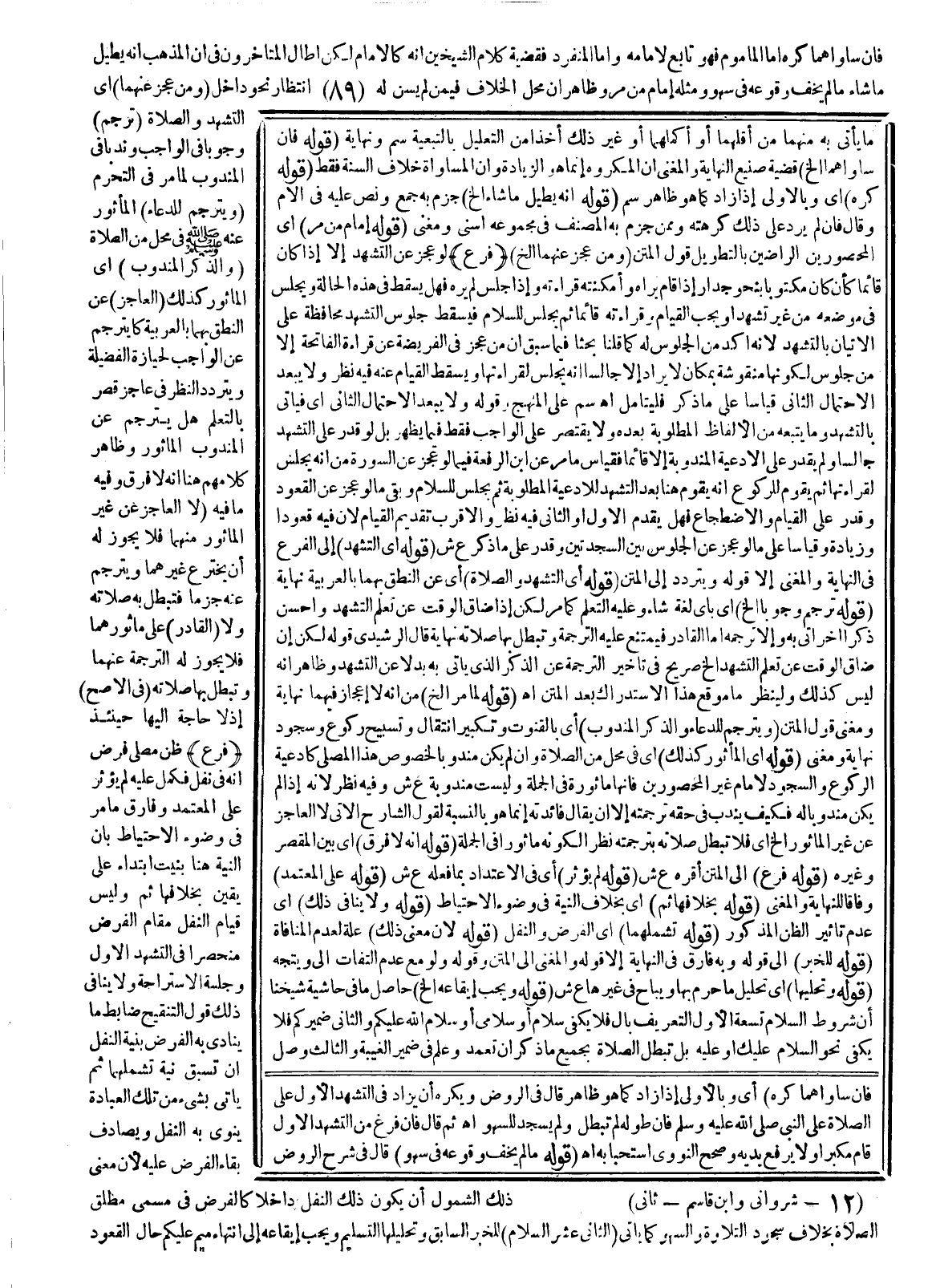 (الثَّانِيَ عَشَرَ السَّلَامُ) لِلْخَبَرِ السَّابِقِ وَتَحْلِيلُهَا التَّسْلِيمُ وَيَجِبُ إيقَاعُهُ إلَى انْتِهَاءِ مِيمِ عَلَيْكُمْ حَالَ الْقُعُودِ