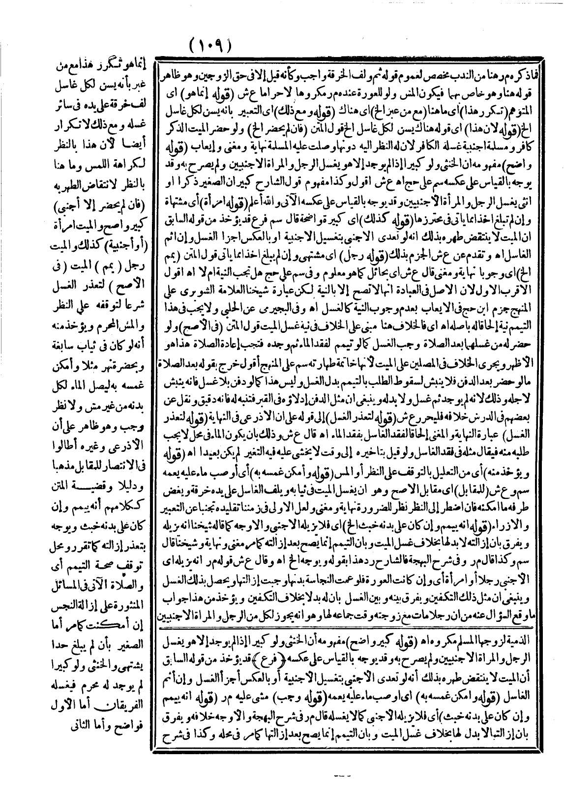 قَوْلُ الْمَتْنِ (فَإِنْ لَمْ يَحْضُرْ إلَخْ) وَلَوْ حَضَرَ الْمَيِّتَ الذَّكَرَ كَافِرٌ وَمُسْلِمَةٌ أَجْنَبِيَّةٌ غَسَّلَهُ الْكَافِرُ لِأَنَّ لَهُ النَّظَرَ إلَيْهِ دُونَهَا وَصَلَّتْ عَلَيْهِ الْمُسْلِمَةُ نِهَايَةٌ وَمُغْنِي وَإِيعَابٌ (قَوْلُهُ: وَاضِحٌ) مَفْهُومُهُ أَنَّ الْخُنْثَى - وَلَوْ كَبِيرًا - إذَا لَمْ يُوجَدْ إلَّا هُوَ يُغَسِّلُ الرَّجُلَ وَالْمَرْأَةَ الْأَجْنَبِيَّيْنِ وَلَمْ يُصَرِّحْ بِهِ وَقَدْ يُوَجَّهُ بِالْقِيَاسِ عَلَى عَكْسِهِ سم عَلَى حَجّ اهـ ع ش أَقُولُ وَكَذَا مَفْهُومُ قَوْلِ الشَّارِحِ " كَبِيرٌ " أَنَّ الصَّغِيرَ ذَكَرًا أَوْ أُنْثَى يُغَسِّلُ الرَّجُلَ وَالْمَرْأَةَ الْأَجْنَبِيَّيْنِ وَقَدْ يُوَجَّهُ بِالْقِيَاسِ عَلَى عَكْسِهِ الْآتِي وَاَللَّهُ أَعْلَمُ (قَوْلُهُ: امْرَأَةٌ) أَيْ مُشْتَهَاةٌ وَإِنْ لَمْ تَبْلُغْ أَخْذًا مِمَّا يَأْتِي فِي مُحْتَرَزِهَا (قَوْلُهُ: كَذَلِكَ) أَيْ كَبِيرَةٌ وَاضِحَةٌ قَالَ سم فَرْعٌ قَدْ يُؤْخَذُ مِنْ قَوْلِهِ السَّابِقِ إنَّ الْمَيِّتَ لَا يَنْتَقِضُ طُهْرُهُ بِذَلِكَ أَنَّهُ لَوْ تَعَدَّى الْأَجْنَبِيُّ بِتَغْسِيلِ الْأَجْنَبِيَّةِ أَوْ بِالْعَكْسِ أَجْزَأَ الْغُسْلُ وَإِنْ أَثِمَ الْغَاسِلُ اهـ وَتَقَدَّمَ عَنْ ع ش الْجَزْمُ بِذَلِكَ (قَوْلُهُ: رَجُلٌ) أَيْ مُشْتَهًى وَإِنْ لَمْ يَبْلُغْ أَخْذًا مِمَّا يَأْتِي.