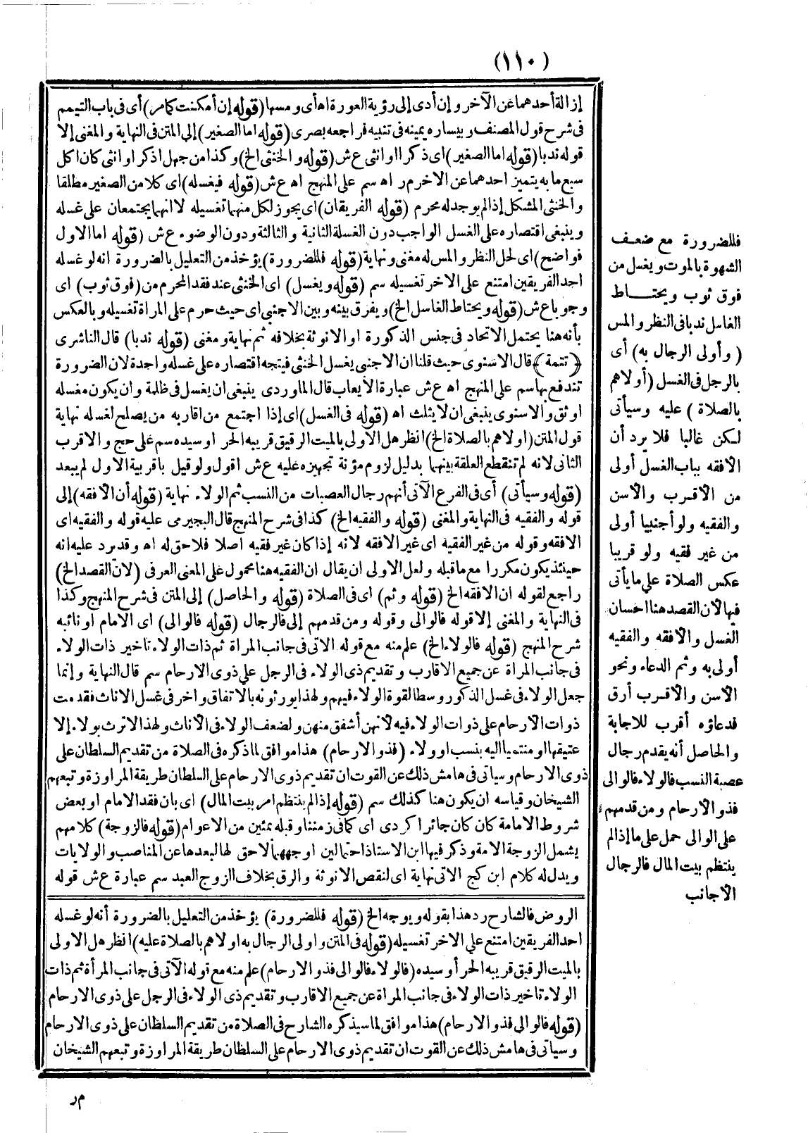 (قَوْلُهُ: فِي الْمَتْنِ وَأَوْلَى الرِّجَالِ بِهِ أَوْلَاهُمْ بِالصَّلَاةِ عَلَيْهِ) اُنْظُرْ هَلْ الْأَوْلَى بِالْمَيِّتِ الرَّقِيقِ قَرِيبُهُ الْحَرُّ أَوْ سَيِّدُهُ. (قَوْلُهُ: فَالْوَلَاءُ فَالْوَالِي فَذُو الْأَرْحَامِ) عُلِمَ مِنْهُ مَعَ قَوْلِهِ الْآتِي فِي جَانِبِ الْمَرْأَةِ " ثُمَّ ذَاتُ الْوَلَاءِ " تَأْخِيرُ ذَاتِ الْوَلَاءِ فِي جَانِبِ الْمَرْأَةِ عَنْ جَمِيعِ الْأَقَارِبِ وَتَقْدِيمُ ذِي الْوَلَاءِ فِي الرَّجُلِ عَلَى ذَوِي الْأَرْحَامِ (قَوْلُهُ: فَالْوَالِي فَذُو الْأَرْحَامِ) هَذَا مُوَافِقٌ لِمَا سَيَذْكُرُهُ الشَّارِحُ فِي الصَّلَاةِ مِنْ تَقْدِيمِ السُّلْطَانِ عَلَى ذَوِي الْأَرْحَامِ وَسَيَأْتِي فِي هَامِشِ ذَلِكَ عَنْ الْقُوتِ أَنَّ تَقْدِيمَ ذَوِي الْأَرْحَامِ عَلَى السُّلْطَانِ طَرِيقَةُ الْمَرَاوِزَةِ وَتَبِعَهُمْ الشَّيْخَانِ