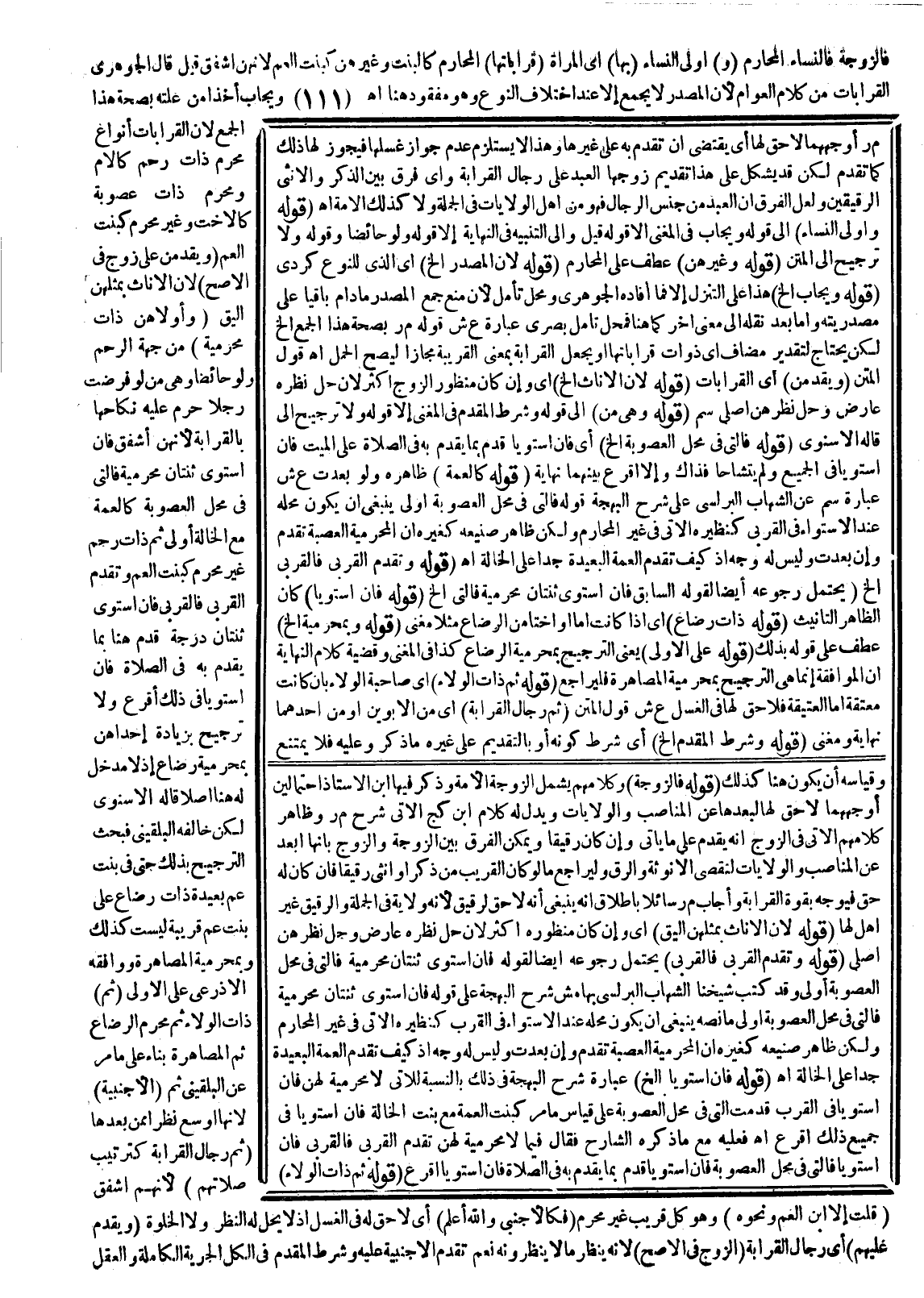 (قَوْلُهُ: وَيُجَابُ إلَخْ) هَذَا عَلَى التَّنَزُّلِ وَإِلَّا فَمَا أَفَادَهُ الْجَوْهَرِيُّ مَحَلُّ تَأَمُّلٍ لِأَنَّ مَنْعَ جَمْعِ الْمَصْدَرِ مَا دَامَ بَاقِيًا عَلَى مَصْدَرِيَّتِهِ وَأَمَّا بَعْدَ نَقْلِهِ إلَى مَعْنًى آخَرَ كَمَا هُنَا فَمَحَلُّ تَأَمُّلٍ بَصْرِيٌّ عِبَارَةُ ع ش قَوْلُهُ: م ر بِصِحَّةِ هَذَا الْجَمْعِ إلَخْ لَكِنْ يُحْتَاجُ لِتَقْدِيرِ مُضَافٍ أَيْ ذَوَاتِ قَرَابَاتِهَا أَوْ بِجَعْلِ الْقَرَابَةِ بِمَعْنَى الْقَرِيبَةِ مَجَازًا لِيَصِحَّ الْحَمْلُ اهـ قَوْلُ الْمَتْنِ (وَيُقَدَّمْنَ) أَيْ الْقَرَابَاتُ (قَوْلُهُ: لِأَنَّ الْإِنَاثَ إلَخْ) أَيْ وَإِنْ كَانَ مَنْظُورُ الزَّوْجِ أَكْثَرَ لِأَنَّ حِلَّ نَظَرِهِ عَارِضٌ وَحِلَّ نَظَرِهِنَّ أَصْلِيٌّ سم (قَوْلُهُ: وَهِيَ مِنْ) إلَى قَوْلِهِ " وَشَرْطُ الْمُقَدَّمِ " فِي الْمُغْنِي إلَّا قَوْلَهُ وَلَا تَرْجِيحَ إلَى " قَالَهُ الْإِسْنَوِيُّ (قَوْلُهُ: فَالَّتِي فِي مَحَلِّ الْعُصُوبَةِ إلَخْ) أَيْ فَإِنْ اسْتَوَيَا قُدِّمَ بِمَا يُقَدَّمُ بِهِ فِي الصَّلَاةِ عَلَى الْمَيِّتِ فَإِنْ اسْتَوَيَا فِي الْجَمِيعِ وَلَمْ يَتَشَاحَّا فَذَاكَ وَإِلَّا أُقْرِعَ بَيْنَهُمَا نِهَايَةٌ (قَوْلُهُ: كَالْعَمَّةِ) ظَاهِرُهُ وَلَوْ بَعُدَتْ ع ش عِبَارَةُ سم عَنْ الشِّهَابِ الْبُرُلُّسِيِّ عَلَى شَرْحِ الْبَهْجَةِ قَوْلُهُ: فَالَّتِي فِي مَحَلِّ الْعُصُوبَةِ أَوْلَى يَنْبَغِي أَنْ يَكُونَ مَحَلُّهُ عِنْدَ الِاسْتِوَاءِ فِي الْقُرْبَى كَنَظِيرِهِ الْآتِي فِي غَيْرِ الْمَحَارِمِ وَلَكِنَّ ظَاهِرَ صَنِيعِهِ كَغَيْرِهِ أَنَّ الْمَحْرَمِيَّةَ الْعَصَبَةَ تُقَدَّمُ وَإِنْ بَعُدَتْ وَلَيْسَ لَهُ وَجْهٌ إذْ كَيْفَ تُقَدَّمُ الْعَمَّةُ الْبَعِيدَةُ جِدًّا عَلَى الْخَالَةِ اهـ.