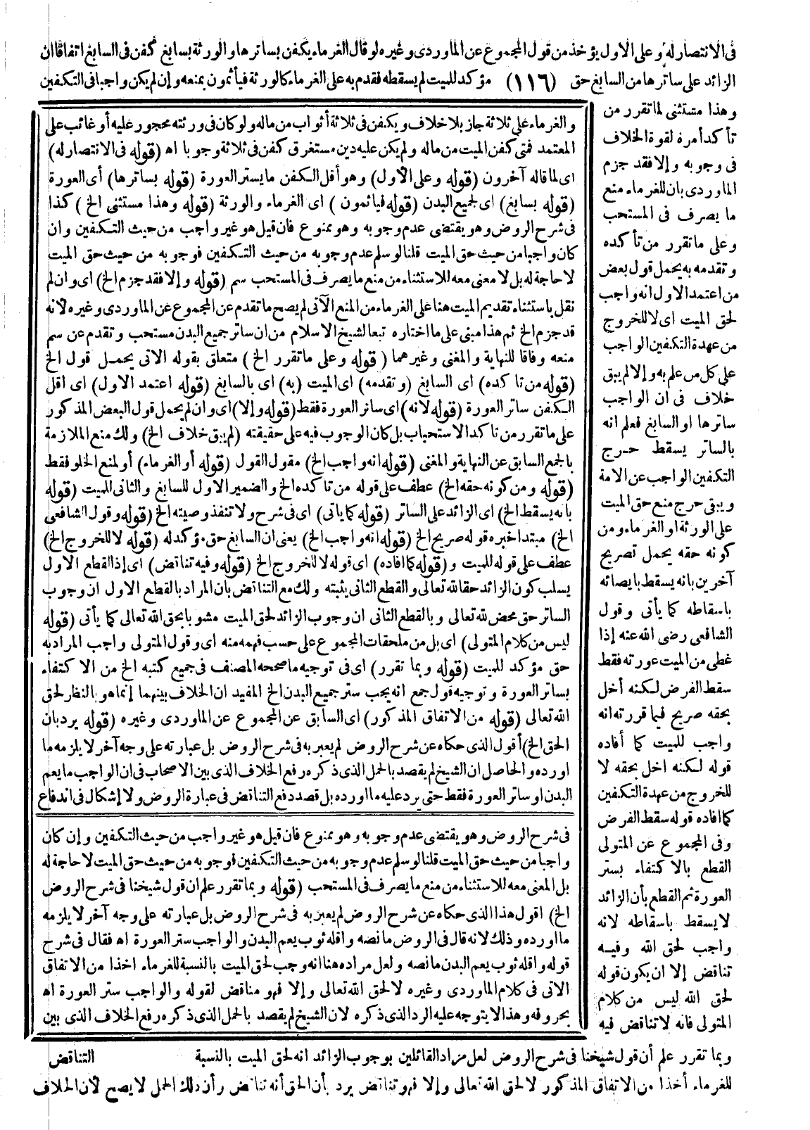 وَعَلَى مَا تَقَرَّرَ مِنْ تَأَكُّدِهِ وَتَقَدُّمِهِ بِهِ يُحْمَلُ قَوْلُ بَعْضِ مَنْ اعْتَمَدَ الْأَوَّلَ إنَّهُ وَاجِبٌ لِحَقِّ الْمَيِّتِ أَيْ لَا لِلْخُرُوجِ مِنْ عُهْدَةِ التَّكْفِينِ الْوَاجِبِ عَلَى كُلِّ مَنْ عَلِمَ بِهِ وَإِلَّا لَمْ يَبْقَ خِلَافٌ فِي أَنَّ الْوَاجِبَ سَاتِرُهَا أَوْ السَّابِغُ فَعُلِمَ أَنَّهُ بِالسَّاتِرِ يَسْقُطُ حَرَجُ التَّكْفِينِ الْوَاجِبِ عَنْ الْأُمَّةِ وَيَبْقَى حَرَجٌ مِنْهُ حَقُّ الْمَيِّتِ عَلَى الْوَرَثَةِ أَوْ الْغُرَمَاءِ، وَمِنْ كَوْنِهِ حَقَّهُ يُحْمَلُ تَصْرِيحُ آخَرِينَ بِأَنَّهُ يَسْقُطُ بِإِيصَائِهِ بِإِسْقَاطِهِ كَمَا يَأْتِي وَقَوْلُ الشَّافِعِيِّ - رَضِيَ اللَّهُ عَنْهُ - إذَا غُطِّيَ مِنْ الْمَيِّتِ عَوْرَتُهُ فَقَطْ سَقَطَ الْفَرْضُ لَكِنَّهُ أَخَلَّ بِحَقِّهِ صَرِيحٌ فِيمَا قَرَّرْتُهُ أَنَّهُ وَاجِبٌ لِلْمَيِّتِ كَمَا أَفَادَهُ قَوْلُهُ لَكِنَّهُ أَخَلَّ بِحَقِّهِ لَا لِلْخُرُوجِ مِنْ عُهْدَةِ التَّكْفِينِ كَمَا أَفَادَهُ قَوْلُهُ سَقَطَ الْفَرْضُ وَفِي الْمَجْمُوعِ عَنْ الْمُتَوَلِّي الْقَطْعُ بِالِاكْتِفَاءِ بِسَتْرِ الْعَوْرَةِ ثُمَّ الْقَطْعُ بِأَنَّ الزَّائِدَ لَا يَسْقُطُ بِإِسْقَاطِهِ لِأَنَّهُ وَاجِبٌ لِحَقِّ اللَّهِ وَفِيهِ تَنَاقُضٌ إلَّا أَنْ يَكُونَ قَوْلُهُ لِحَقِّ اللَّهِ لَيْسَ مِنْ كَلَامِ الْمُتَوَلِّي فَإِنَّهُ لَا تَنَاقُضَ فِيهِ وَبِمَا تَقَرَّرَ عُلِمَ أَنَّ قَوْلَ شَيْخِنَا فِي شَرْحِ الرَّوْضِ لَعَلَّ مُرَادَ الْقَائِلِينَ بِوُجُوبِ الزَّائِدِ أَنَّهُ لِحَقِّ الْمَيِّتِ بِالنِّسْبَةِ لِلْغُرَمَاءِ أَخْذًا مِنْ الِاتِّفَاقِ الْمَذْكُورِ لَا لِحَقِّ اللَّهِ تَعَالَى وَإِلَّا فَهُوَ تَنَاقُضٌ يُرَدُّ بِأَنَّ الْحَقَّ أَنَّهُ تَنَاقُضٌ وَأَنَّ ذَلِكَ الْحَمْلَ لَا يَصِحُّ لِأَنَّ الْخِلَافَ