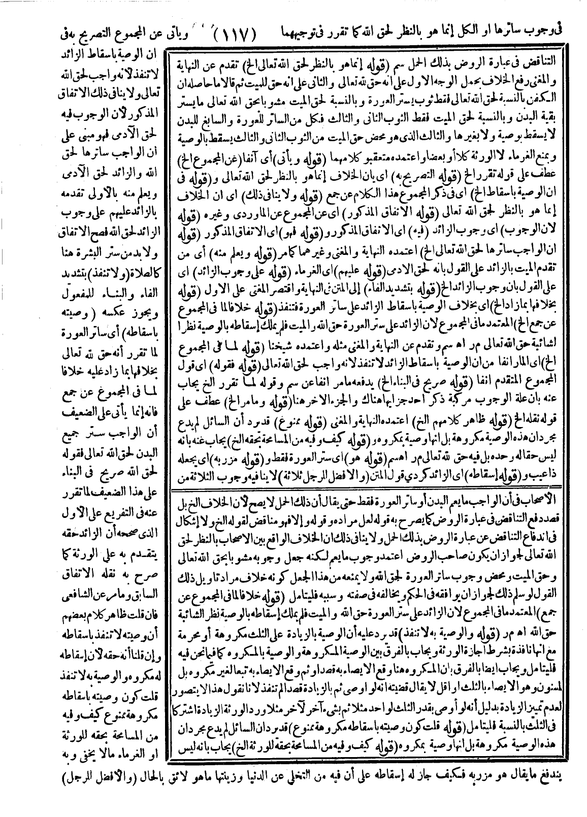 ـــــــــــــــــــــــــــــSالْأَصْحَابِ فِي أَنَّ الْوَاجِبَ مَا يَعُمُّ الْبَدَنَ أَوْ سَاتِرُ الْعَوْرَةِ فَقَطْ حَتَّى يُقَالَ إنَّ ذَلِكَ الْحَمْلَ لَا يَصِحُّ لِأَنَّ الْخِلَافَ إلَخْ بَلْ قَصَدَ دَفْعَ التَّنَاقُضِ فِي عِبَارَةِ الرَّوْضِ كَمَا يُصَرِّحُ بِهِ قَوْلُهُ: لَعَلَّ مُرَادَهُ وَقَوْلُهُ: وَإِلَّا فَهُوَ مُنَاقِضٌ لِقَوْلِهِ إلَخْ وَلَا إشْكَالَ فِي انْدِفَاعِ التَّنَاقُضِ عَنْ عِبَارَةِ الرَّوْضِ بِذَلِكَ الْحَمْلِ وَلَا يُنَافِي ذَلِكَ أَنَّ الْخِلَافَ الْوَاقِعَ بَيْنَ الْأَصْحَابِ بِالنَّظَرِ لِحَقِّ اللَّهِ تَعَالَى لِجَوَازِ أَنْ يَكُونَ صَاحِبُ الرَّوْضِ اعْتَمَدَ وُجُوبَ مَا يَعُمُّ لَكِنَّهُ جَعَلَ وُجُوبَهُ مَشُوبًا بِحَقِّ اللَّهِ تَعَالَى وَحَقِّ الْمَيِّتِ، وَمَحْضُ وُجُوبِ سَاتِرِ الْعَوْرَةِ لِحَقِّ اللَّهِ وَلَا يَمْنَعُهُ مِنْ هَذَا الْجَعْلِ كَوْنُهُ خِلَافَ مُرَادِ تَأْوِيلِ ذَلِكَ الْقَوْلِ لَوْ سُلِّمَ ذَلِكَ لِجَوَازِ أَنْ يُوَافِقَهُ فِي الْحُكْمِ وَيُخَالِفَهُ فِي صِفَتِهِ وَسَبَبِهِ فَلْيُتَأَمَّلْ (قَوْلُهُ: خِلَافًا لِمَا فِي الْمَجْمُوعِ عَنْ جَمْعٍ) الْمُعْتَمَدُ مَا فِي الْمَجْمُوعِ لِأَنَّ الزَّائِدَ عَلَى سَتْرِ الْعَوْرَةِ حَقُّ اللَّهِ وَالْمَيِّتِ فَلَمْ يَمْلِكْ إسْقَاطَهُ بِالْوَصِيَّةِ نَظَرًا لِشَائِبَةِ حَقِّ اللَّهِ اهـ م ر (قَوْلُهُ: وَالْوَصِيَّةُ بِهِ لَا تُنَفَّذُ) قَدْ يَرِدُ عَلَيْهِ أَنَّ الْوَصِيَّةَ بِالزِّيَادَةِ عَلَى الثُّلُثِ مَكْرُوهَةٌ أَوْ مُحَرَّمَةٌ مَعَ أَنَّهَا نَافِذَةٌ بِشَرْطِ إجَازَةِ الْوَرَثَةِ وَيُجَابُ بِالْفَرْقِ بَيْنَ الْوَصِيَّةِ الْمَكْرُوهَةِ وَالْوَصِيَّةِ بِالْمَكْرُوهِ كَمَا فِيمَا نَحْنُ فِيهِ فَلْيُتَأَمَّلْ وَيُجَابُ أَيْضًا بِالْفَرْقِ بِأَنَّ الْمَكْرُوهَ هُنَا وَقَعَ الْإِيصَاءُ بِهِ قَصْدًا وَثَمَّ وَقَعَ الْإِيصَاءُ بِهِ تَبَعًا لِغَيْرِ مَكْرُوهٍ بَلْ لِمَسْنُونٍ وَهُوَ الْإِيصَاءُ بِالثُّلُثِ أَوْ أَقَلَّ، لَا يُقَالُ قَضِيَّتُهُ أَنَّهُ لَوْ أَوْصَى ثَمَّ بِالزِّيَادَةِ قَصْدًا لَمْ تُنَفَّذْ لِأَنَّا نَقُولُ هَذَا لَا يُتَصَوَّرُ لِعَدَمِ تَمْيِيزِ الزِّيَادَةِ بِدَلِيلِ أَنَّهُ لَوْ أَوْصَى بِقَدْرِ الثُّلُثِ لِوَاحِدٍ مَثَلًا ثُمَّ بِشَيْءٍ آخَرَ لِآخَرَ مَثَلًا وَرَدَّ الْوَرَثَةُ الزِّيَادَةَ اشْتَرَكَا فِي الثُّلُثِ بِالنِّسْبَةِ فَلْيُتَأَمَّلْ (قَوْلُهُ: قُلْتُ: كَوْنُ وَصِيَّتِهِ بِإِسْقَاطِهِ مَكْرُوهَةً مَمْنُوعٌ) قَدْ يَرِدُ أَنَّ السَّائِلَ لَمْ يَدَّعِ مُجَرَّدَ أَنَّ هَذِهِ الْوَصِيَّةَ مَكْرُوهَةٌ بَلْ أَنَّهَا وَصِيَّةٌ بِمَكْرُوهٍ (قَوْلُهُ: كَيْفَ وَفِيهِ مِنْ الْمُسَامَحَةِ بِحَقِّهِ لِلْوَرَثَةِ إلَخْ) يُجَابُ بِأَنَّهُ لَيْسَ