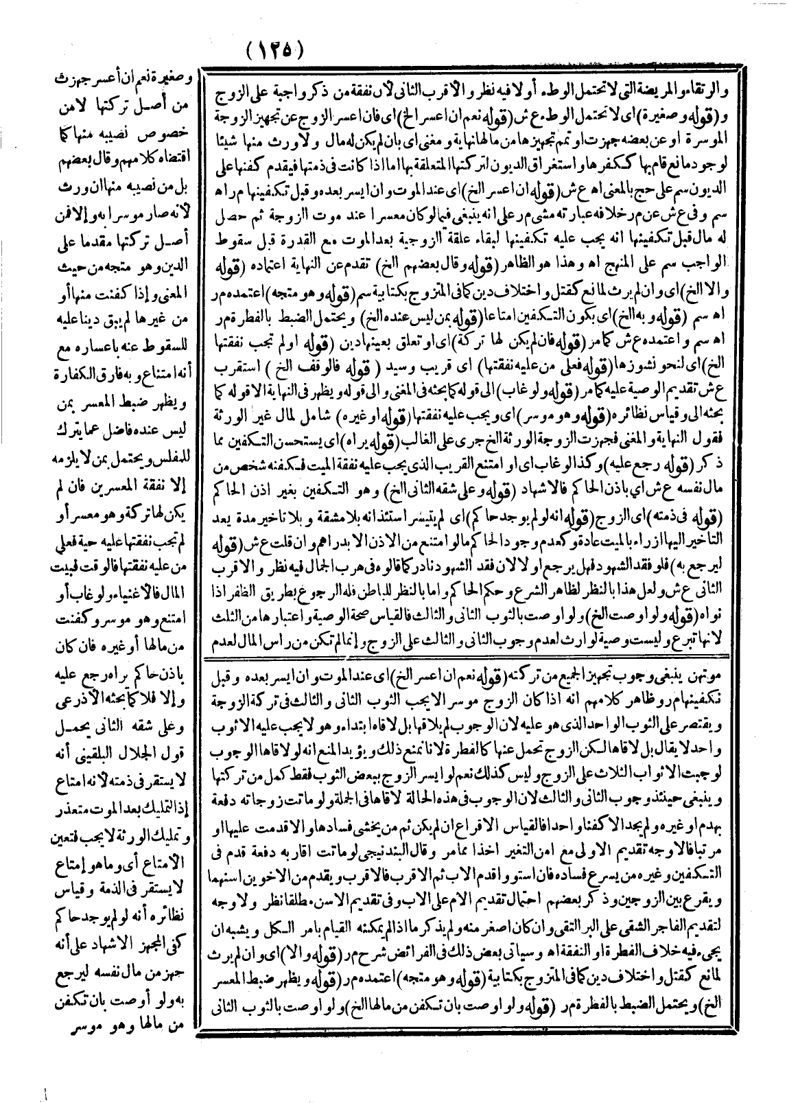 ـــــــــــــــــــــــــــــSمَوْتِهِنَّ يَنْبَغِي وُجُوبُ تَجْهِيزِ الْجَمِيعِ مِنْ تَرِكَتِهِ (قَوْلُهُ: نَعَمْ إنْ أَعْسَرَ إلَخْ) أَيْ عِنْدَ الْمَوْتِ وَإِنْ أَيْسَرَ بَعْدَهُ وَقَبْلَ تَكْفِينِهَا م ر وَظَاهِرُ كَلَامِهِمْ أَنَّهُ إذَا كَانَ الزَّوْجُ مُوسِرًا لَا يَجِبُ الثَّوْبُ الثَّانِي، وَالثَّالِثُ فِي تَرِكَةِ الزَّوْجَةِ وَيُقْتَصَرُ عَلَى الثَّوْبِ الْوَاحِدِ الَّذِي هُوَ عَلَيْهِ لِأَنَّ الْوُجُوبَ لَمْ يُلَاقِهَا بَلْ لَاقَاهُ ابْتِدَاءً وَهُوَ لَا يَجِبُ عَلَيْهِ إلَّا ثَوْبٌ وَاحِدٌ لَا يُقَالُ بَلْ لَاقَاهَا لَكِنَّ الزَّوْجَ تَحَمَّلَ عَنْهَا كَالْفِطْرَةِ لِأَنَّا نَمْنَعُ ذَلِكَ وَيُؤَيِّدُ الْمَنْعَ أَنَّهُ لَوْ لَاقَاهَا الْوُجُوبُ لَوَجَبَتْ الْأَثْوَابُ الثَّلَاثُ عَلَى الزَّوْجِ وَلَيْسَ كَذَلِكَ نَعَمْ لَوْ أَيْسَرَ الزَّوْجُ بِبَعْضِ الثَّوْبِ فَقَطْ كَمَّلَ مِنْ تَرِكَتِهَا وَيَنْبَغِي حِينَئِذٍ وُجُوبُ الثَّانِي وَالثَّالِثِ لِأَنَّ الْوُجُوبَ فِي هَذِهِ الْحَالَةِ لَاقَاهَا فِي الْجُمْلَةِ وَلَوْ مَاتَتْ زَوْجَاتُهُ دَفْعَةً بِهَدْمٍ أَوْ غَيْرِهِ وَلَمْ يَجِدْ إلَّا كَفَنًا وَاحِدًا فَالْقِيَاسُ الْإِقْرَاعُ إنْ لَمْ يَكُنْ ثَمَّ مَنْ يُخْشَى فَسَادُهَا وَإِلَّا قُدِّمَتْ عَلَيْهَا أَوْ مُرَتَّبًا فَالْأَوْجَهُ تَقْدِيمُ الْأُولَى مَعَ أَمْنِ التَّغَيُّرِ أَخْذًا مِمَّا مَرَّ وَقَالَ الْبَنْدَنِيجِيُّ لَوْ مَاتَ أَقَارِبُهُ دَفْعَةً قُدِّمَ فِي التَّكْفِينِ وَغَيْرِهِ مَنْ يُسْرِعُ فَسَادُهُ فَإِنْ اسْتَوَوْا قُدِّمَ الْأَبُ ثُمَّ الْأَقْرَبُ فَالْأَقْرَبُ وَيُقَدَّمُ مِنْ الْأَخَوَيْنِ أَسَنُّهُمَا وَيُقْرَعُ بَيْنَ الزَّوْجَيْنِ وَذَكَرَ بَعْضُهُمْ احْتِمَالَ تَقْدِيمِ الْأُمِّ عَلَى الْأَبِ وَفِي تَقْدِيمِ الْأَسَنِّ مُطْلَقًا نَظَرٌ وَلَا وَجْهَ لِتَقْدِيمِ الْفَاجِرِ الشَّقِيِّ عَلَى الْبَرِّ التَّقِيِّ وَإِنْ كَانَ أَصْغَرَ مِنْهُ وَلَمْ يَذْكُرْ مَا إذَا لَمْ يُمْكِنْهُ الْقِيَامُ بِأَمْرِ الْكُلِّ وَيُشْبِهُ أَنْ يَجِيءَ فِيهِ خِلَافُ الْفِطْرَةِ أَوْ النَّفَقَةِ اهـ وَسَيَأْتِي بَعْضُ ذَلِكَ فِي الْفَرَائِضِ شَرْحُ م ر (قَوْلُهُ: وَإِلَّا) أَيْ وَإِنْ لَمْ يَرِثْ لِمَانِعٍ كَقَتْلٍ وَاخْتِلَافِ دِينٍ كَمَا فِي الْمُتَزَوِّجِ بِكِتَابِيَّةٍ (قَوْلُهُ: وَهُوَ مُتَّجَهٌ) اعْتَمَدَهُ م ر. (قَوْلُهُ: وَيَظْهَرُ ضَبْطُ الْمُعْسِرِ إلَخْ) وَيُحْتَمَلُ الضَّبْطُ بِالْفِطْرَةِ م ر (قَوْلُهُ: وَلَوْ أَوْصَتْ بِأَنْ تُكَفَّنَ مِنْ مَالِهَا إلَخْ) وَلَوْ أَوْصَتْ بِالثَّوْبِ الثَّانِي