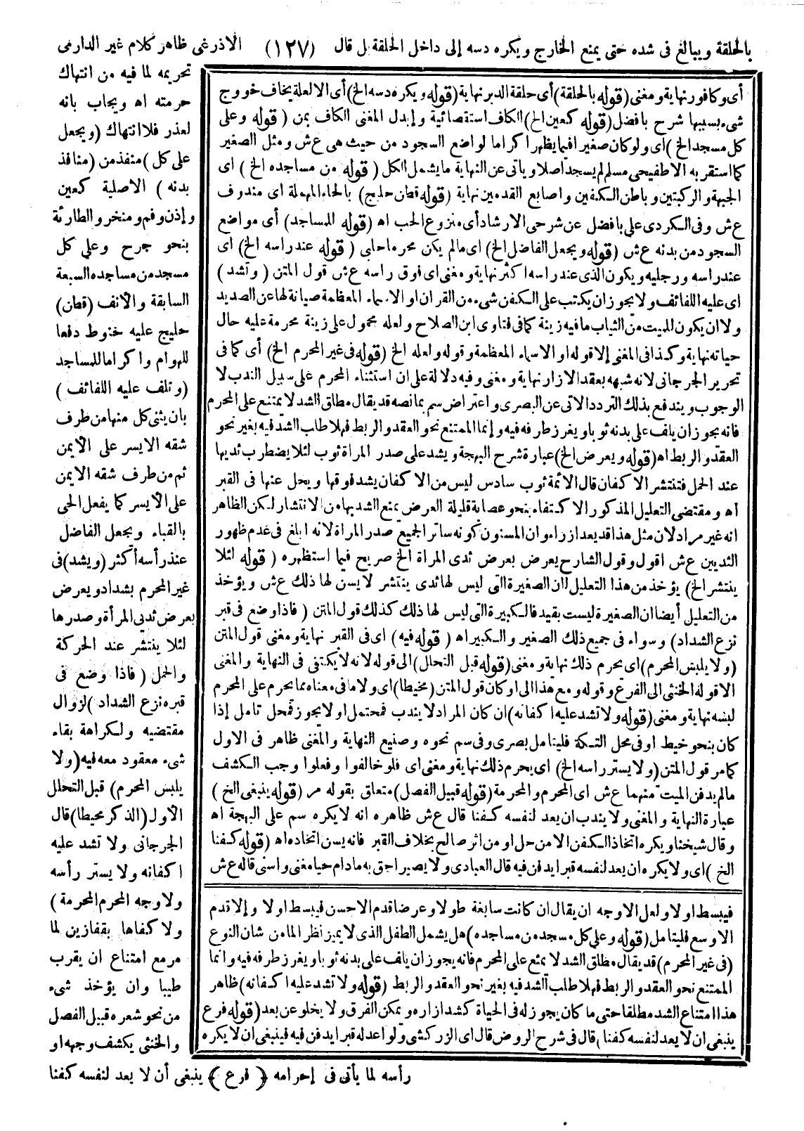 (قَوْلُهُ: وَعَلَى كُلِّ مَسْجِدٍ مِنْ مَسَاجِدِهِ) هَلْ يَشْمَلُ الطِّفْلَ الَّذِي لَا يُمَيِّزُ نَظَرًا لِمَا مِنْ شَأْنِ النَّوْعِ (قَوْلُهُ: فِي غَيْرِ الْمُحْرِمِ) قَدْ يُقَالُ مُطْلَقُ الشَّدِّ لَا يُمْنَعُ عَلَى الْمُحْرِمِ فَإِنَّهُ يَجُوزُ أَنْ يَلُفَّ عَلَى بَدَنِهِ ثَوْبًا وَيَغْرِزَ طَرَفَهُ فِيهِ وَإِنَّمَا الْمُمْتَنِعُ نَحْوُ الْعَقْدِ وَالرَّبْطِ فَهَلَّا طَلَبَ الشَّدَّ فِيهِ بِغَيْرِ نَحْوِ الْعَقْدِ وَالرَّبْطِ.