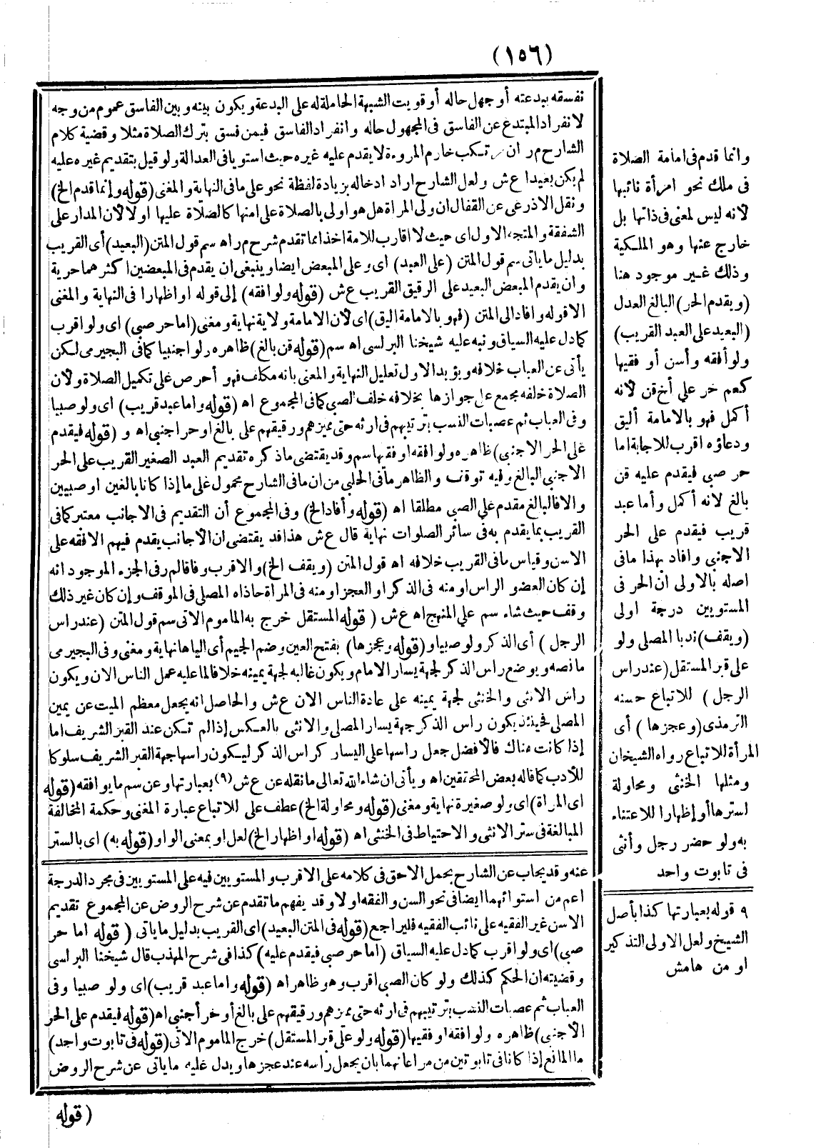 (وَيُقَدَّمُ الْحُرُّ) الْبَالِغُ الْعَدْلُ (الْبَعِيدُ عَلَى الْعَبْدِ الْقَرِيبِ) وَلَوْ أَفْقَهَ وَأَسَنَّ أَوْ فَقِيهًا كَعَمٍّ حُرٍّ عَلَى أَخٍ قِنٍّ لِأَنَّهُ أَكْمَلُ فَهُوَ بِالْإِمَامَةِ أَلْيَقُ وَدُعَاؤُهُ أَقْرَبُ لِلْإِجَابَةِ أَمَّا حُرٌّ صَبِيٌّ فَيُقَدَّمُ عَلَيْهِ قِنٌّ بَالِغٌ لِأَنَّهُ أَكْمَلُ وَأَمَّا عَبْدٌ قَرِيبٌ فَيُقَدَّمُ عَلَى الْحُرِّ الْأَجْنَبِيِّ وَأَفَادَ بِهَذَا مَا فِي أَصْلِهِ بِالْأَوْلَى أَنَّ الْحُرَّ فِي الْمُسْتَوِيَيْنِ دَرَجَةً أَوْلَى.