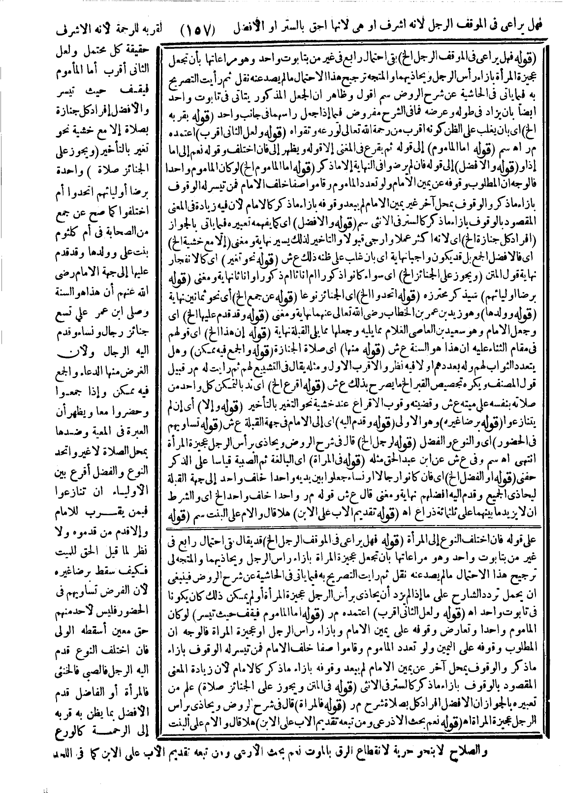 فَهَلْ يُرَاعَى فِي الْمَوْقِفِ الرَّجُلُ لِأَنَّهُ أَشْرَفُ أَوْ هِيَ لِأَنَّهَا أَحَقُّ بِالسَّتْرِ أَوْ الْأَفْضَلُ لِقُرْبِهِ لِلرَّحْمَةِ لِأَنَّهُ الْأَشْرَفُ حَقِيقَةً؟ كُلٌّ مُحْتَمَلٌ وَلَعَلَّ الثَّانِيَ أَقْرَبُ أَمَّا الْمَأْمُومُ فَيَقِفُ حَيْثُ تَيَسَّرَ وَالْأَفْضَلُ إفْرَادُ كُلِّ جِنَازَةٍ بِصَلَاةٍ إلَّا مَعَ خَشْيَةِ نَحْوِ تَغَيُّرٍ بِالتَّأْخِيرِ.