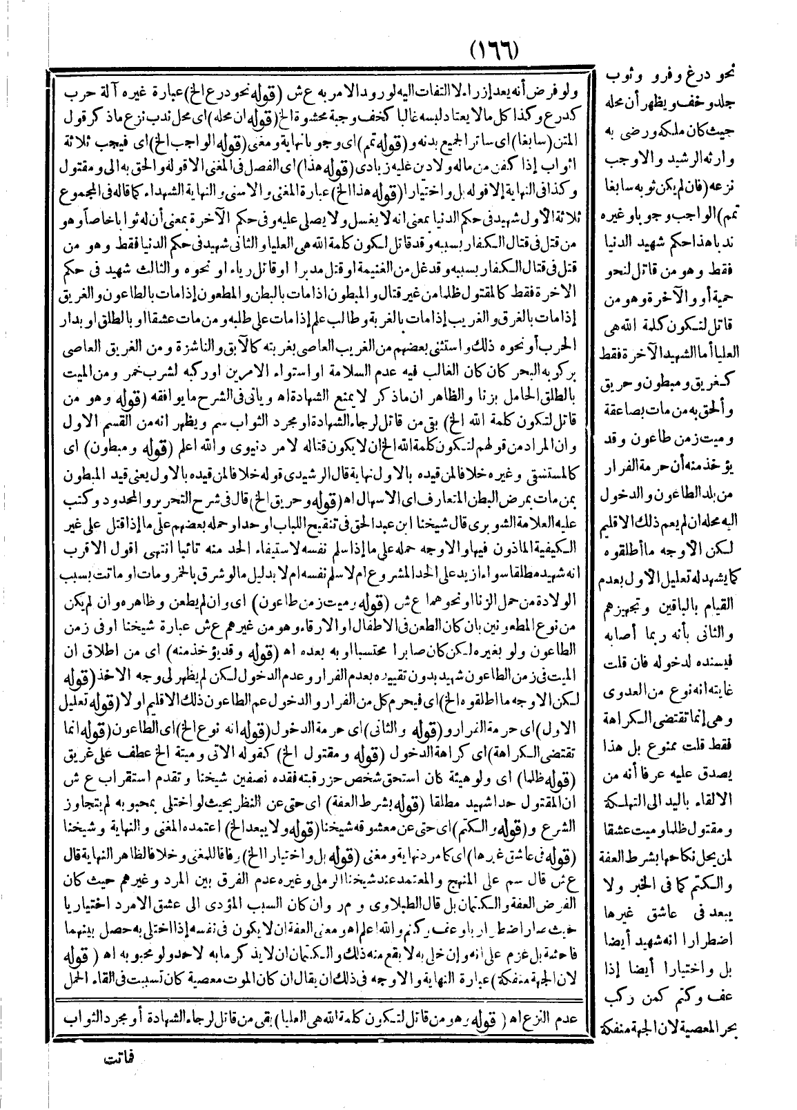 قَوْلُ الْمَتْنِ (سَابِغًا) أَيْ سَاتِرًا لِجَمِيعِ بَدَنِهِ وَ (قَوْلُهُ: تُمِّمَ) أَيْ وُجُوبًا نِهَايَةٌ وَمُغْنِي (قَوْلُهُ: الْوَاجِبُ إلَخْ) أَيْ فَيَجِبُ ثَلَاثَةُ أَثْوَابٍ إذَا كُفِّنَ مِنْ مَالِهِ وَلَا دَيْنَ عَلَيْهِ زِيَادِيٌّ (قَوْلُهُ: هَذَا) أَيْ الْفَصْلُ فِي الْمُغْنِي إلَّا قَوْلَهُ وَأُلْحِقَ بِهِ إلَى " وَمَقْتُولٍ " وَكَذَا فِي النِّهَايَةِ إلَّا قَوْلَهُ بَلْ وَاخْتِيَارًا (قَوْلُهُ: هَذَا إلَخْ) عِبَارَةُ الْمُغْنِي وَالْأَسْنَى وَالنِّهَايَةِ: الشُّهَدَاءُ - كَمَا قَالَهُ فِي الْمَجْمُوعِ - ثَلَاثَةٌ الْأَوَّلُ شَهِيدٌ فِي حُكْمِ الدُّنْيَا بِمَعْنَى أَنَّهُ لَا يُغَسَّلُ وَلَا يُصَلَّى عَلَيْهِ وَفِي حُكْمِ الْآخِرَةِ بِمَعْنَى أَنَّ لَهُ ثَوَابًا خَاصًّا وَهُوَ مَنْ قُتِلَ فِي قِتَالِ الْكُفَّارِ بِسَبَبِهِ وَقَدْ قَاتَلَ لِتَكُونَ كَلِمَةُ اللَّهِ هِيَ الْعُلْيَا وَالثَّانِي شَهِيدٌ فِي حُكْمِ الدُّنْيَا فَقَطْ وَهُوَ مَنْ قُتِلَ فِي قِتَالِ الْكُفَّارِ بِسَبَبِهِ وَقَدْ غَلَّ مِنْ الْغَنِيمَةِ أَوْ قَتَلَ مُدَبَّرًا أَوْ قَاتَلَ رِيَاءً أَوْ نَحْوَهُ وَالثَّالِثُ شَهِيدٌ فِي حُكْمِ الْآخِرَةِ فَقَطْ كَالْمَقْتُولِ ظُلْمًا مِنْ غَيْرِ قِتَالٍ وَالْمَبْطُونِ إذَا مَاتَ بِالْبَطْنِ وَالْمَطْعُونِ إذَا مَاتَ بِالطَّاعُونِ وَالْغَرِيقِ إذَا مَاتَ بِالْغَرَقِ وَالْغَرِيبِ إذَا مَاتَ بِالْغُرْبَةِ وَطَالِبِ عِلْمٍ إذَا مَاتَ عَلَى طَلَبِهِ وَمَنْ مَاتَ عِشْقًا أَوْ بِالطَّلْقِ أَوْ بِدَارِ الْحَرْبِ أَوْ نَحْوِ ذَلِكَ.
