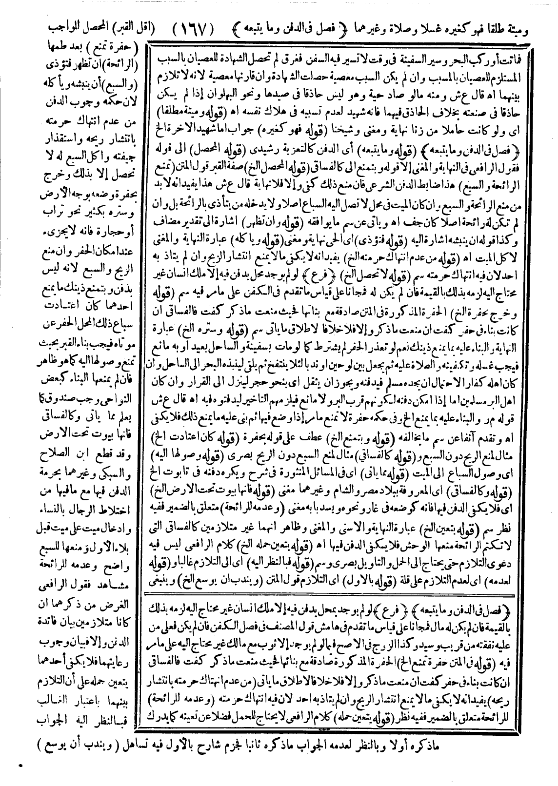 (قَوْلُهُ وَمَا يَتْبَعُهُ) أَيْ الدَّفْنَ كَالتَّعْزِيَةِ رَشِيدِيٌّ (قَوْلُهُ الْمُحَصِّلِ) إلَى قَوْلِهِ فَقَوْلُ الرَّافِعِيِّ فِي النِّهَايَةِ وَالْمُغْنِي إلَى قَوْلِهِ وَبِتَمَنُّعٍ إلَى كَالْفَسَاقِيِ (قَوْلُهُ الْمُحَصِّلِ إلَخْ) صِفَةُ الْقَبْرِ قَوْلُ الْمَتْنِ (تَمْنَعُ الرَّائِحَةَ وَالسَّبُعَ) هَذَا ضَابِطُ الدَّفْنِ الشَّرْعِيِّ فَإِنْ مَنَعَ ذَلِكَ كَفَى وَإِلَّا فَلَا نِهَايَةٌ قَالَ ع ش هَذَا يُفِيدُ أَنَّهُ لَا بُدَّ مِنْ مَنْعِ الرَّائِحَةِ وَالسَّبُعِ وَإِنْ كَانَ الْمَيِّتُ فِي مَحَلٍّ لَا تَصِلَ إلَيْهِ السِّبَاعُ أَصْلًا وَلَا يَدْخُلُهُ مَنْ يَتَأَذَّى بِالرَّائِحَةِ بَلْ وَإِنْ لَمْ تَكُنْ لَهُ رَائِحَةٌ أَصْلًا كَأَنْ جَفَّ اهـ وَيَأْتِي عَنْ سم مَا يُوَافِقُهُ (قَوْلُهُ أَنْ تَظْهَرَ) إشَارَةٌ إلَى تَقْدِيرِ مُضَافٍ وَكَذَا قَوْلُهُ أَنْ يَنْبُشَهُ إشَارَةٌ إلَيْهِ (قَوْلُهُ فَتُؤْذِي) أَيْ الْحَيَّ نِهَايَةٌ وَمُغْنِي (قَوْلُهُ وَيَأْكُلُهُ) عِبَارَةُ النِّهَايَةِ وَالْمُغْنِي لِأَكْلِ الْمَيِّتِ اهـ.