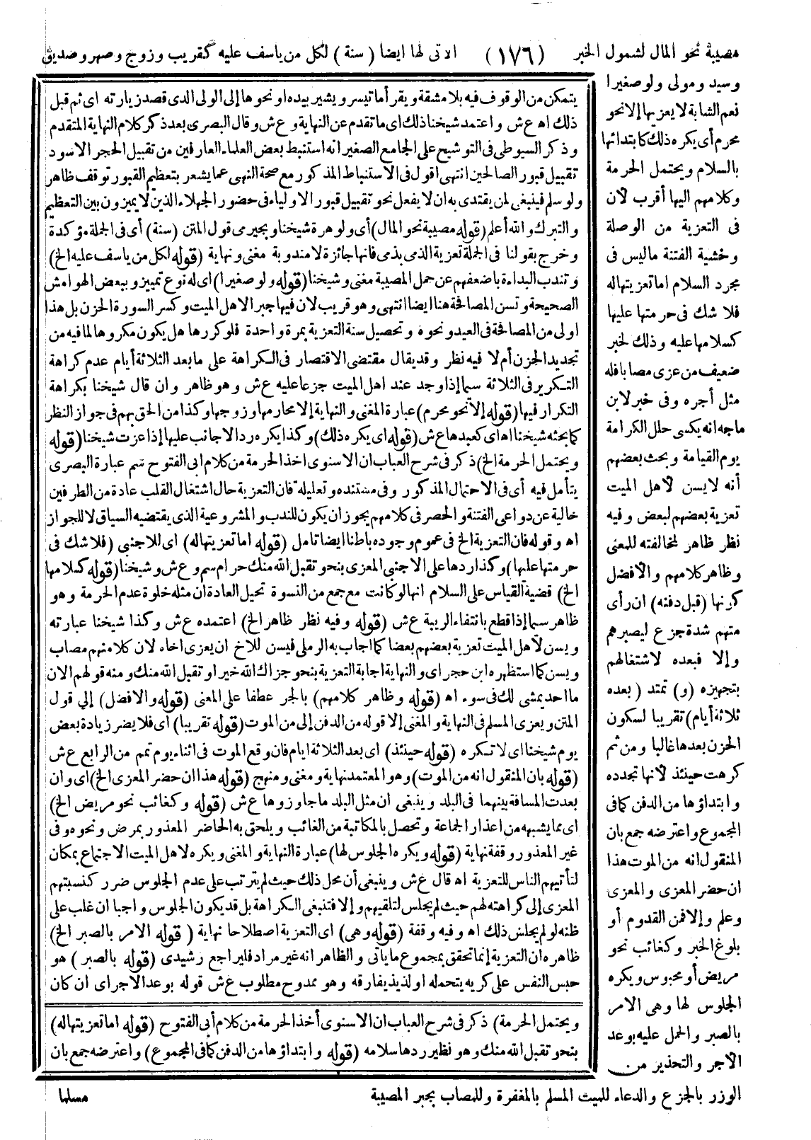 وَيَنْبَغِي أَنَّ مَحَلَّ ذَلِكَ حَيْثُ لَمْ يَتَرَتَّبْ عَلَى عَدَمِ الْجُلُوسِ ضَرَرٌ كَنِسْبَتِهِمْ الْمُعِزِّي إلَى كَرَاهَتِهِ لَهُمْ حَيْثُ لَمْ يَجْلِسْ لِتَلَقِّيهمْ وَإِلَّا فَتَنْبَغِي الْكَرَاهَةُ بَلْ قَدْ يَكُونُ الْجُلُوسُ وَاجِبًا إنْ غَلَبَ عَلَى ظَنِّهِ لَوْ لَمْ يَجْلِسْ ذَلِكَ اهـ وَفِيهِ وَقْفَةٌ (قَوْلُهُ وَهِيَ) أَيْ التَّعْزِيَةُ اصْطِلَاحًا نِهَايَةٌ (قَوْلُهُ الْأَمْرُ بِالصَّبْرِ إلَخْ) ظَاهِرُهُ أَنَّ التَّعْزِيَةَ إنَّمَا تُحَقَّقُ بِمَجْمُوعِ مَا يَأْتِي وَالظَّاهِرُ أَنَّهُ غَيْرُ مُرَادٍ فَلْيُرَاجَعْ رَشِيدِيٌّ (قَوْلُهُ بِالصَّبْرِ) هُوَ حَبْسُ النَّفْسِ عَلَى كَرِيهٍ يَتَحَمَّلُهُ أَوْ لَذِيذٍ يُفَارِقُهُ وَهُوَ مَمْدُوحٌ وَمَطْلُوبٌ ع ش قَوْلُهُ بِوَعْدِ الْأَجْرِ أَيْ إنْ كَانَ
