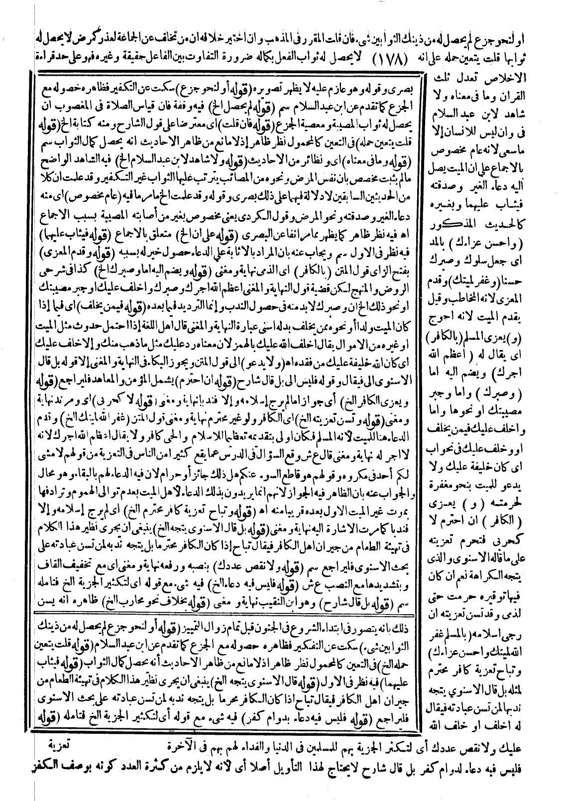 (وَ) يُعَزَّى (الْكَافِرُ) إنْ احْتَرَمَ لَا كَحَرْبِيٍّ فَتَحْرُمُ تَعْزِيَتُهُ عَلَى مَا قَالَهُ الْإِسْنَوِيُّ وَاَلَّذِي يُتَّجَهُ الْكَرَاهَةُ نَعَمْ إنْ كَانَ فِيهَا تَوْقِيرُهُ حَرُمَتْ حَتَّى لِذِمِّيٍّ وَقَدْ تُسَنُّ تَعْزِيَتُهُ إنْ رُجِيَ إسْلَامُهُ (بِالْمُسْلِمِ غَفَرَ اللَّهُ لِمَيِّتِك وَأَحْسَنَ عَزَاءَك) وَتُبَاحُ تَعْزِيَةُ كَافِرٍ مُحْتَرَمٍ لِمِثْلِهِ بَلْ قَالَ الْإِسْنَوِيُّ يُتَّجَهُ نَدْبُهَا لِمَنْ تُسَنُّ عِيَادَتُهُ فَيُقَالُ لَهُ أَخْلَفَ أَوْ خَلَفَ اللَّهُ عَلَيْك وَلَا نَقَصَ عَدَدُكَ أَيْ لِتَكْثُرَ الْجِزْيَةُ بِهِمْ لِلْمُسْلِمِينَ فِي الدُّنْيَا وَالْفِدَاءُ لَهُمْ بِهِمْ فِي الْآخِرَةِ فَلَيْسَ فِيهِ دُعَاءٌ بِدَوَامِ كُفْرٍ بَلْ قَالَ شَارِحٌ لَا يُحْتَاجُ لِهَذَا التَّأْوِيلِ أَصْلًا أَيْ لِأَنَّهُ لَا يَلْزَمُ مِنْ كَثْرَةِ الْعَدَدِ كَوْنُهُ بِوَصْفِ الْكُفْرِ