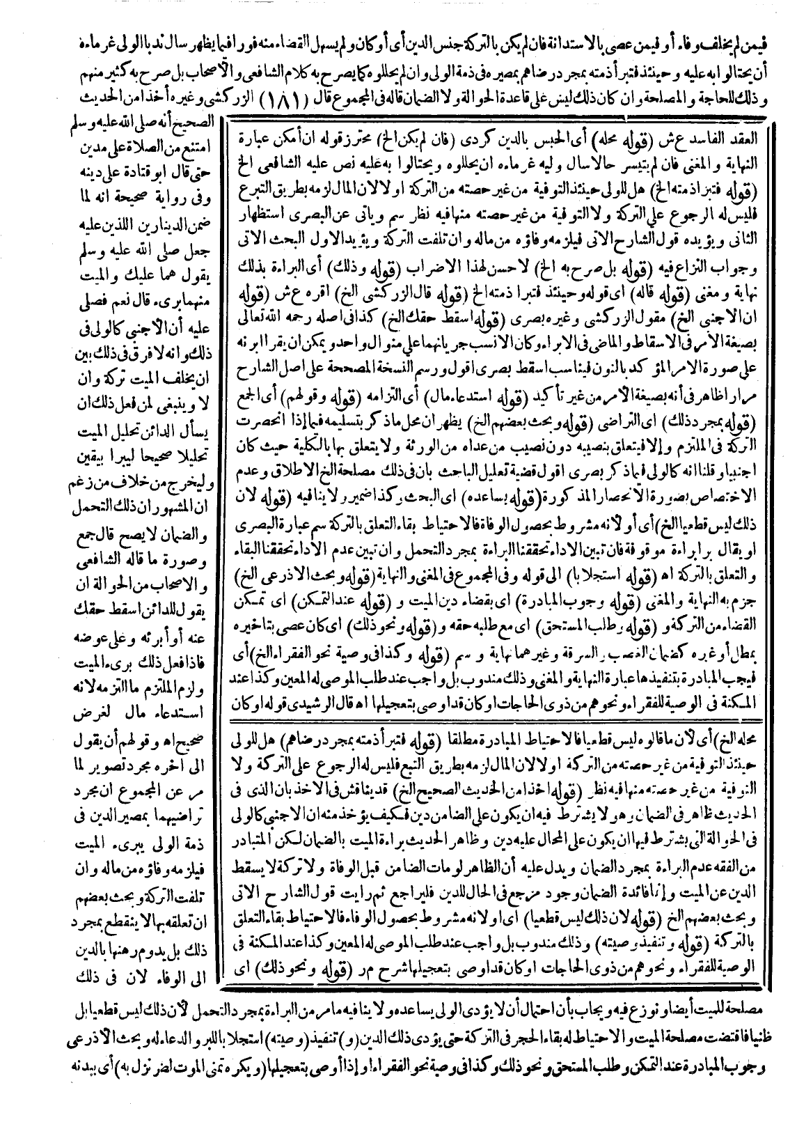 فِيمَنْ لَمْ يَخْلُفُ وَفَاءً أَوْ فِيمَنْ عَصَى بِالِاسْتِدَانَةِ فَإِنْ لَمْ يَكُنْ بِالتَّرِكَةِ جِنْسُ الدَّيْنِ أَيْ أَوْ كَانَ وَلَمْ يَسْهُلْ الْقَضَاءُ مِنْهُ فَوْرًا فِيمَا يَظْهَرُ سَأَلَ نَدْبًا الْوَلِيُّ غُرَمَاءَهُ أَنْ يَحْتَالُوا بِهِ عَلَيْهِ وَحِينَئِذٍ فَتَبْرَأُ ذِمَّتُهُ بِمُجَرَّدِ رِضَاهُمْ بِمَصِيرِهِ فِي ذِمَّةِ الْوَلِيِّ وَإِنْ لَمْ يُحَلِّلُوهُ كَمَا يُصَرِّحُ بِهِ كَلَامُ الشَّافِعِيِّ وَالْأَصْحَابِ بَلْ صَرَّحَ بِهِ كَثِيرٌ مِنْهُمْ وَذَلِكَ لِلْحَاجَةِ وَالْمَصْلَحَةِ وَإِنْ كَانَ ذَلِكَ لَيْسَ عَلَى قَاعِدَةِ الْحَوَالَةِ وَلَا الضَّمَانِ قَالَهُ فِي الْمَجْمُوعِ قَالَ الزَّرْكَشِيُّ وَغَيْرُهُ أَخْذًا مِنْ الْحَدِيثِ الصَّحِيحِ «أَنَّهُ - صَلَّى اللَّهُ عَلَيْهِ وَسَلَّمَ - امْتَنَعَ مِنْ الصَّلَاةِ عَلَى مَدِينٍ حَتَّى قَالَ أَبُو قَتَادَةَ عَلَيَّ دَيْنُهُ» وَفِي رِوَايَةٍ صَحِيحَةٍ «أَنَّهُ لَمَّا ضَمِنَ الدِّينَارَيْنِ اللَّذَيْنِ عَلَيْهِ جَعَلَ - صَلَّى اللَّهُ عَلَيْهِ وَسَلَّمَ - يَقُولُ هُمَا عَلَيْك وَالْمَيِّتُ مِنْهُمَا بَرِيءٌ قَالَ نَعَمْ فَصَلَّى عَلَيْهِ» أَنَّ الْأَجْنَبِيَّ كَالْوَلِيِّ فِي ذَلِكَ وَأَنَّهُ لَا فَرْقَ فِي ذَلِكَ بَيْنَ أَنْ يَخْلُفَ الْمَيِّتُ تَرِكَةً وَأَنْ لَا وَيَنْبَغِي لِمَنْ فَعَلَ ذَلِكَ أَنْ يَسْأَلَ الدَّائِنَ تَحْلِيلَ الْمَيِّتِ تَحْلِيلًا صَحِيحًا لِيَبْرَأَ بِيَقِينٍ وَلِيَخْرُجَ مِنْ خِلَافِ مَنْ زَعَمَ أَنَّ الْمَشْهُورَ أَنَّ ذَلِكَ التَّحَمُّلَ وَالضَّمَانَ لَا يَصِحُّ قَالَ جَمْعٌ وَصُورَةُ مَا قَالَهُ الشَّافِعِيُّ وَالْأَصْحَابُ مِنْ الْحَوَالَةِ أَنْ يَقُولَ لِلدَّائِنِ أَسْقِطْ حَقَّك عَنْهُ أَوْ أَبْرِئْهُ وَعَلَيَّ عِوَضُهُ فَإِذَا فَعَلَ ذَلِكَ بَرِئَ الْمَيِّتُ وَلَزِمَ الْمُلْتَزِمُ مَا الْتَزَمَهُ لِأَنَّهُ اسْتِدْعَاءُ مَالٍ لِغَرَضٍ صَحِيحٍ اهـ وَقَوْلُهُمْ أَنْ يَقُولَ إلَى آخِرِهِ مُجَرَّدُ تَصْوِيرٍ لِمَا مَرَّ عَنْ الْمَجْمُوعِ أَنَّ مُجَرَّدَ تَرَاضِيهِمَا بِمَصِيرِ الدَّيْنِ فِي ذِمَّةِ الْوَلِيِّ يُبَرِّئُ الْمَيِّتَ فَيَلْزَمُهُ وَفَاؤُهُ مِنْ مَالِهِ وَإِنْ تَلْفِت التَّرِكَةُ وَبَحَثَ بَعْضُهُمْ أَنَّ تَعَلُّقَهُ بِهَا لَا يَنْقَطِعُ بِمُجَرَّدِ ذَلِكَ بَلْ يَدُومُ رَهْنُهَا بِالدَّيْنِ إلَى الْوَفَاءِ لِأَنَّ فِي ذَلِكَ مَصْلَحَةً لِلْمَيِّتِ أَيْضًا وَنُوَزِّعُ فِيهِ وَيُجَابُ بِأَنَّ احْتِمَالَ أَنْ لَا يُؤَدِّيَ الْوَلِيُّ يُسَاعِدُهُ وَلَا يُنَافِيهِ مَا مَرَّ مِنْ الْبَرَاءَةِ بِمُجَرَّدِ التَّحَمُّلِ لِأَنَّ ذَلِكَ قَطْعِيًّا بَلْ ظَنِّيًّا فَاقْتَضَتْ مَصْلَحَةُ الْمَيِّتِ وَالِاحْتِيَاطُ لَهُ بَقَاءَ الْحَجْرِ فِي التَّرِكَةِ حَتَّى يُؤَدِّيَ ذَلِكَ الدَّيْنَ (وَ) تَنْفِيذِ (وَصِيَّتِهِ) اسْتِجْلَابًا لِلْبِرِّ وَالدُّعَاءِ لَهُ وَبَحَثَ الْأَذْرَعِيُّ وُجُوبَ الْمُبَادَرَةِ عِنْدَ التَّمَكُّنِ وَطَلَبِ الْمُسْتَحِقِّ وَنَحْوِ ذَلِكَ وَكَذَا فِي وَصِيَّةِ نَحْوِ الْفُقَرَاءِ أَوْ إذَا أَوْصَى بِتَعْجِيلِهَا