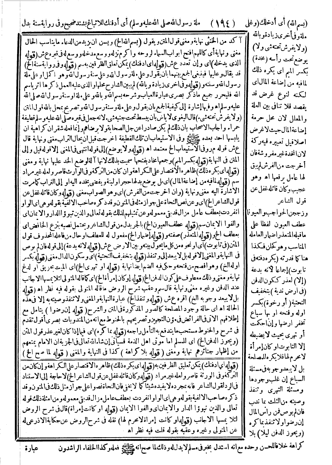 عِبَارَةُ الْعُبَابِ وَشَرْحِهِ بِسْمِ اللَّهِ وَبِاَللَّهِ وَعَلَى مِلَّةِ أَوْ سُنَّةِ رَسُولِ اللَّهِ - صَلَّى اللَّهُ عَلَيْهِ وَسَلَّمَ - اهـ وَفِيهَا إشَارَةٌ إلَى كَيْفِيَّةِ الْجَمْعِ بِأَنْ يَقُولَ وَعَلَى مِلَّةِ وَسُنَّةِ رَسُولِ اللَّهِ وَتَصْرِيحٌ بِمَحَلِّ بِاَللَّهِ قَوْلُ الْمَتْنِ (وَلَا يُفْرَشُ تَحْتَهُ شَيْءٌ) قَالَ الْبَغَوِيّ لَا بَأْسَ بِأَنْ يُبْسَطَ تَحْتَ جَنْبِهِ شَيْءٌ لِأَنَّهُ «جَعَلَ فِي قَبْرِهِ - صَلَّى اللَّهُ عَلَيْهِ وَسَلَّمَ - قَطِيفَةً حَمْرَاءَ» وَأَجَابَ الْأَصْحَابُ بِأَنَّ ذَلِكَ لَمْ يَكُنْ صَادِرًا عَنْ جُلِّ الصَّحَابَةِ وَلَا بِرِضَاهُمْ وَإِنَّمَا فَعَلَهُ شُقْرَانُ كَرَاهِيَةَ أَنْ يَلْبَسَهَا أَحَدٌ بَعْدَهُ - صَلَّى اللَّهُ عَلَيْهِ وَسَلَّمَ - وَفِي الِاسْتِيعَابِ أَنَّ تِلْكَ الْقَطِيفَةَ أُخْرِجَتْ قَبْلَ أَنْ يُحَالَ التُّرَابُ مُغْنِي وَنِهَايَةٌ قَالَ ع ش قَوْلُهُ م ر وَفِي الِاسْتِيعَابِ إلَخْ مُعْتَمَدٌ اهـ.