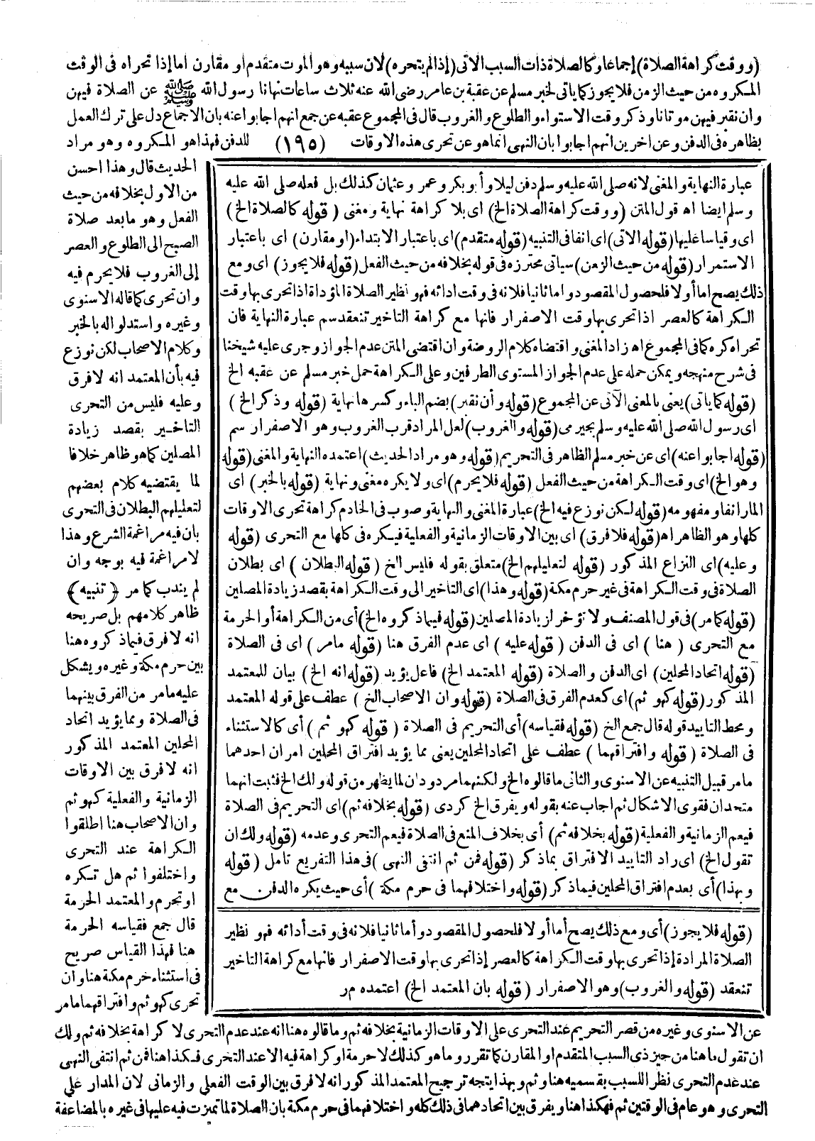 (وَوَقْتُ كَرَاهَةِ الصَّلَاةِ) إجْمَاعًا وَكَالصَّلَاةِ ذَاتِ السَّبَبِ الْآتِي (إذَا لَمْ يَتَحَرَّهُ) لِأَنَّ سَبَبَهُ وَهُوَ الْمَوْتُ مُتَقَدِّمٌ أَوْ مُقَارِنٌ أَمَّا إذَا تَحَرَّاهُ فِي الْوَقْتِ الْمَكْرُوهِ مِنْ حَيْثُ الزَّمَنُ فَلَا يَجُوزُ كَمَا يَأْتِي لِخَبَرِ مُسْلِمٍ عَنْ عُقْبَةَ بْنِ عَامِرٍ - رَضِيَ اللَّهُ عَنْهُ - «ثَلَاثُ سَاعَاتٍ نَهَانَا رَسُولُ اللَّهِ - صَلَّى اللَّهُ عَلَيْهِ وَسَلَّمَ - عَنْ الصَّلَاةِ فِيهِنَّ وَأَنْ نَقْبُرَ فِيهِنَّ مَوْتَانَا وَذَكَرَ وَقْتَ الِاسْتِوَاءِ وَالطُّلُوعِ وَالْغُرُوبِ» قَالَ فِي الْمَجْمُوعِ عَقِبَهُ عَنْ جَمْعٍ أَنَّهُمْ أَجَابُوا عَنْهُ بِأَنَّ الْإِجْمَاعَ دَلَّ عَلَى تَرْكِ الْعَمَلِ بِظَاهِرِهِ فِي الدَّفْنِ وَعَنْ آخَرِينَ أَنَّهُمْ أَجَابُوا بِأَنَّ النَّهْيَ إنَّمَا هُوَ عَنْ تَحَرِّي هَذِهِ الْأَوْقَاتِ لِلدَّفْنِ فَهَذَا هُوَ الْمَكْرُوهُ وَهُوَ مُرَادُ الْحَدِيثِ قَالَ وَهَذَا أَحْسَنُ مِنْ الْأَوَّلِ بِخِلَافِهِ مِنْ حَيْثُ الْفِعْلُ وَهُوَ مَا بَعْدَ صَلَاةِ الصُّبْحِ إلَى الطُّلُوعِ وَالْعَصْرِ إلَى الْغُرُوبِ فَلَا يَحْرُمُ فِيهِ وَإِنْ تَحَرَّى كَمَا قَالَهُ الْإِسْنَوِيُّ وَغَيْرُهُ وَاسْتَدَلُّوا لَهُ بِالْخَبَرِ وَكَلَامِ الْأَصْحَابِ لَكِنْ نُوَزِّعُ فِيهِ بِأَنَّ الْمُعْتَمَدَ أَنَّهُ لَا فَرْقَ وَعَلَيْهِ فَلَيْسَ مِنْ التَّحَرِّي التَّأْخِيرُ بِقَصْدِ زِيَادَةِ الْمُصَلِّينَ كَمَا هُوَ ظَاهِرٌ خِلَافًا لِمَا يَقْتَضِيهِ كَلَامُ بَعْضِهِمْ لِتَعْلِيلِهِمْ الْبُطْلَانَ فِي التَّحَرِّي بِأَنَّ فِيهِ مُرَاغَمَةَ الشَّرْعِ وَهَذَا لَا مُرَاغَمَةَ فِيهِ بِوَجْهٍ وَإِنْ لَمْ يُنْدَبْ كَمَا مَرَّ.