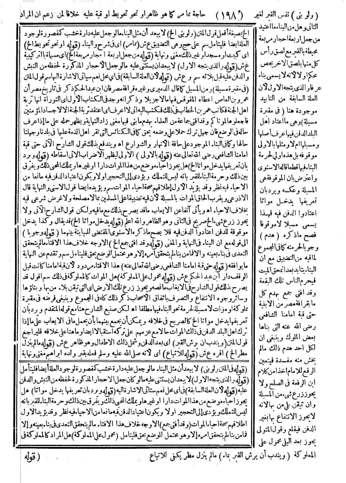 وَلَكِنْ قَوْلُ الشَّارِحِ الْآتِي وَلَا يَجُوزُ زَرْعُ شَيْءٍ إلَخْ صَرِيحٌ فِي الثَّانِي وَهُوَ الظَّاهِرُ وَاَللَّهُ أَعْلَمُ (قَوْلُهُ يَدْخُلُ مَوَاتًا إلَخْ) قَدْ يُقَالُ وَكَذَا يَدْخُلُ مَوْقُوفَةً لِلدَّفْنِ اعْتَادُوا الدَّفْنَ فِيهِ فَلَا يَصِحُّ مَا ذَكَرَهُ الْإِسْنَوِيُّ الْمُقْتَضِي لِلْمُبَايَنَةِ بَيْنَهُمَا (قَوْلُهُ وُجُوبًا) إلَى قَوْلِهِ مَعَ أَنَّ الْبِنَاءَ فِي النِّهَايَةِ وَالْمُغْنِي (قَوْلُهُ وَقَدْ أَفْتَى جَمْعٌ إلَخْ) الْأَوْجَهُ خِلَافُ هَذَا الْإِفْتَاءِ مَا لَمْ يَتَحَقَّقْ التَّعَدِّي فِي بِنَاءٍ بِعَيْنِهِ وَإِلَّا فَمَا مِنْ بِنَاءٍ لَمْ يَتَحَقَّقْ أَمْرُهُ إلَّا وَهُوَ مُحْتَمِلٌ لِلْوَضْعِ بِحَقٍّ فَلْيُتَأَمَّلْ سم وَتَقَدَّمَ عَنْ النِّهَايَةِ مَا يُوَافِقُهُ (قَوْلُهُ حَتَّى قُبَّةِ إمَامِنَا الشَّافِعِيِّ - رَضِيَ اللَّهُ عَنْهُ - إلَخْ) هَذَا الْإِفْتَاءُ مَرْدُودٌ لِأَنَّ قُبَّةَ إمَامِنَا كَانَتْ قَبْلَ الْوَقْفِ دَارَ ابْنِ عَبْدِ الْحَكَمِ ع ش (قَوْلُهُ مَحْمُولٌ عَلَى الْمَمْلُوكَةِ) هَلْ الْمَوَاتُ كَالْمَمْلُوكَةِ فِي ذَلِكَ سم.
