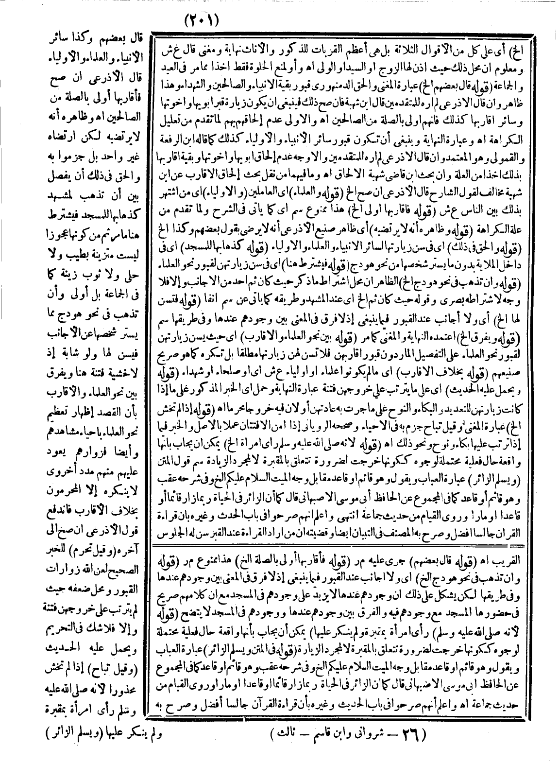 قَالَ الْأَذْرَعِيُّ إنْ صَحَّ فَأَقَارِبُهَا أَوْلَى بِالصِّلَةِ مِنْ الصَّالِحِينَ اهـ وَظَاهِرُهُ أَنَّهُ لَا يَرْتَضِيهِ لَكِنْ ارْتَضَاهُ غَيْرُ وَاحِدٍ بَلْ جَزَمُوا بِهِ وَالْحَقُّ فِي ذَلِكَ أَنْ يَفْصِلَ بَيْنَ أَنْ تَذْهَبَ لِمَشْهَدٍ كَذَهَابِهَا لِلْمَسْجِدِ فَيُشْتَرَطُ هُنَا مَا مَرَّ ثُمَّ مِنْ كَوْنِهَا عَجُوزًا لَيْسَتْ مُتَزَيِّنَةً بِطِيبٍ وَلَا حُلِيٍّ وَلَا ثَوْبِ زِينَةٍ كَمَا فِي الْجَمَاعَةِ بَلْ أَوْلَى وَأَنْ تَذْهَبَ فِي نَحْوِ هَوْدَجٍ مِمَّا يَسْتُرُ شَخْصَهَا عَنْ الْأَجَانِبِ فَيُسَنُّ لَهَا وَلَوْ شَابَّةً إذْ لَا خَشْيَةَ فِتْنَةٍ هُنَا وَيُفَرَّقُ بَيْنَ نَحْوِ الْعُلَمَاءِ وَالْأَقَارِبِ بِأَنَّ الْقَصْدَ إظْهَارُ تَعْظِيمِ نَحْوِ الْعُلَمَاءِ بِإِحْيَاءِ مَشَاهِدِهِمْ وَأَيْضًا فَزُوَّارُهُمْ يَعُودُ عَلَيْهِمْ مِنْهُمْ مَدَدٌ أُخْرَوِيٌّ لَا يُنْكِرُهُ إلَّا الْمَحْرُومُونَ بِخِلَافِ الْأَقَارِبِ فَانْدَفَعَ قَوْلُ الْأَذْرَعِيِّ إنْ صَحَّ إلَى آخِرِهِ (وَقِيلَ تَحْرُمُ) لِلْخَبَرِ الصَّحِيحِ «لَعَنَ اللَّهُ زَوَّارَاتِ الْقُبُورِ» وَمَحَلُّ ضَعْفِهِ حَيْثُ لَمْ يَتَرَتَّبْ عَلَى خُرُوجِهِنَّ فِتْنَةٌ وَإِلَّا فَلَا شَكَّ فِي التَّحْرِيمِ وَيُحْمَلُ عَلَيْهِ الْحَدِيثُ (وَقِيلَ تُبَاحُ) إذَا لَمْ تَخْشَ مَحْذُورًا لِأَنَّهُ - صَلَّى اللَّهُ عَلَيْهِ وَسَلَّمَ - «رَأَى امْرَأَةً بِمَقْبَرَةٍ وَلَمْ يُنْكِرْ عَلَيْهَا» (وَيُسَلِّمُ الزَّائِرُ)