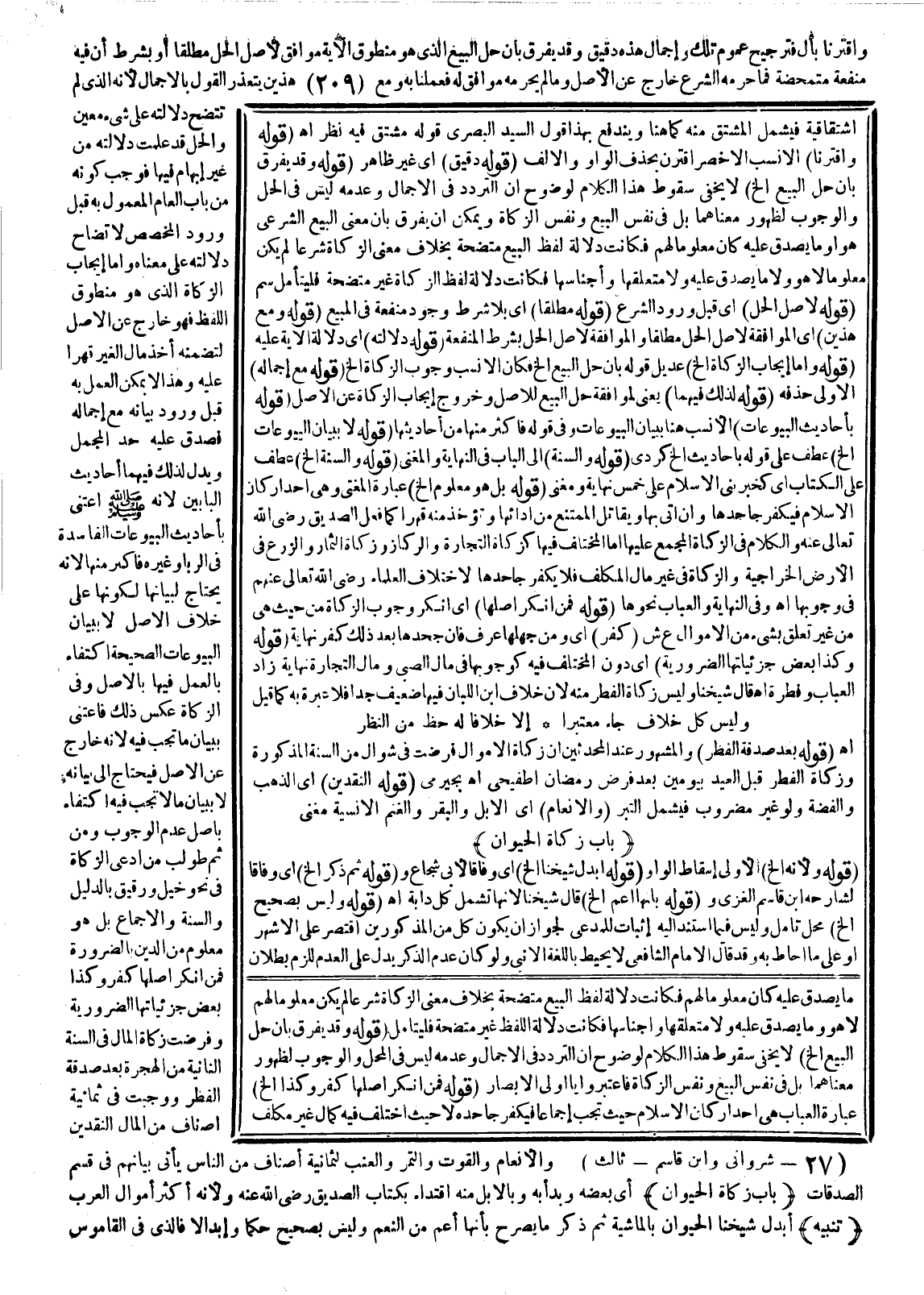 وَاقْتَرَنَا بِأَلْ فَتَرْجِيحُ عُمُومِ تِلْكَ وَإِجْمَالِ هَذِهِ دَقِيقٌ، وَقَدْ يُفَرَّقُ بِأَنَّ حِلَّ الْبَيْعِ الَّذِي هُوَ مَنْطُوقُ الْآيَةِ مُوَافِقٌ لِأَصْلِ الْحِلِّ مُطْلَقًا أَوْ بِشَرْطِ أَنَّ فِيهِ مَنْفَعَةً مُتَمَحِّضَةً فَمَا حَرَّمَهُ الشَّرْعُ خَارِجٌ عَنْ الْأَصْلِ، وَمَا لَمْ يُحَرِّمْهُ مُوَافِقٌ لَهُ فَعَلِمْنَا بِهِ وَمَعَ هَذَيْنِ يَتَعَذَّرُ الْقَوْلُ بِالْإِجْمَالِ؛ لِأَنَّهُ الَّذِي لَمْ تَتَّضِحْ دَلَالَتُهُ عَلَى شَيْءٍ مُعَيَّنٍ وَالْحِلُّ قَدْ عُلِمَتْ دَلَالَتُهُ مِنْ غَيْرِ إبْهَامٍ فِيهَا فَوَجَبَ كَوْنُهُ مِنْ بَابِ الْعَامِّ الْمَعْمُولِ بِهِ قَبْلَ وُرُودِ الْمُخَصِّصِ لِاتِّضَاحِ دَلَالَتِهِ عَلَى مَعْنَاهُ، وَأَمَّا إيجَابُ الزَّكَاةِ الَّذِي هُوَ مَنْطُوقُ اللَّفْظِ فَهُوَ خَارِجٌ عَنْ الْأَصْلِ لِتَضَمُّنِهِ أَخْذَ مَالِ الْغَيْرِ قَهْرًا عَلَيْهِ، وَهَذَا لَا يُمْكِنُ الْعَمَلُ بِهِ قَبْلَ وُرُودِ بَيَانِهِ مَعَ إجْمَالِهِ فَصَدَقَ عَلَيْهِ حَدُّ الْمُجْمَلِ، وَيَدُلُّ لِذَلِكَ فِيهِمَا أَحَادِيثُ الْبَابَيْنِ؛ لِأَنَّهُ - صَلَّى اللَّهُ عَلَيْهِ وَسَلَّمَ - اعْتَنَى بِأَحَادِيثِ الْبُيُوعَاتِ الْفَاسِدَةِ الرِّبَا وَغَيْرِهِ فَأَكْثَرَ مِنْهَا؛ لِأَنَّهُ يُحْتَاجُ لِبَيَانِهَا لِكَوْنِهَا عَلَى خِلَافِ الْأَصْلِ لَا بِبَيَانِ الْبُيُوعَاتِ الصَّحِيحَةِ اكْتِفَاءً بِالْعَمَلِ فِيهَا بِالْأَصْلِ، وَفِي الزَّكَاةِ عَكَسَ ذَلِكَ فَاعْتَنَى بِبَيَانِ مَا تَجِبُ فِيهِ؛ لِأَنَّهُ خَارِجٌ عَنْ الْأَصْلِ فَيُحْتَاجُ إلَى بَيَانِهِ لَا بِبَيَانِ مَا لَا تَجِبُ فِيهِ اكْتِفَاءً بِأَصْلِ عَدَمِ الْوُجُوبِ، وَمِنْ ثَمَّ طُولِبَ مَنْ ادَّعَى الزَّكَاةَ فِي نَحْوِ خَيْلٍ وَرَقِيقٍ بِالدَّلِيلِ وَالسُّنَّةُ وَالْإِجْمَاعُ بَلْ هُوَ مَعْلُومٌ مِنْ الدِّينِ بِالضَّرُورَةِ فَمَنْ أَنْكَرَ أَصْلَهَا كَفَرَ، وَكَذَا بَعْضُ جُزْئِيَّاتِهَا الضَّرُورِيَّةِ وَفُرِضَتْ زَكَاةُ الْمَالِ فِي السَّنَةِ الثَّانِيَةِ مِنْ الْهِجْرَةِ بَعْدَ صَدَقَةِ الْفِطْرِ وَوَجَبَتْ فِي ثَمَانِيَةِ أَصْنَافٍ مِنْ الْمَالِ النَّقْدَيْنِ وَالْأَنْعَامِ وَالْقُوتِ وَالتَّمْرِ وَالْعِنَبِ لِثَمَانِيَةِ أَصْنَافٍ مِنْ النَّاسِ يَأْتِي بَيَانُهُمْ فِي قِسْمِ الصَّدَقَاتِ