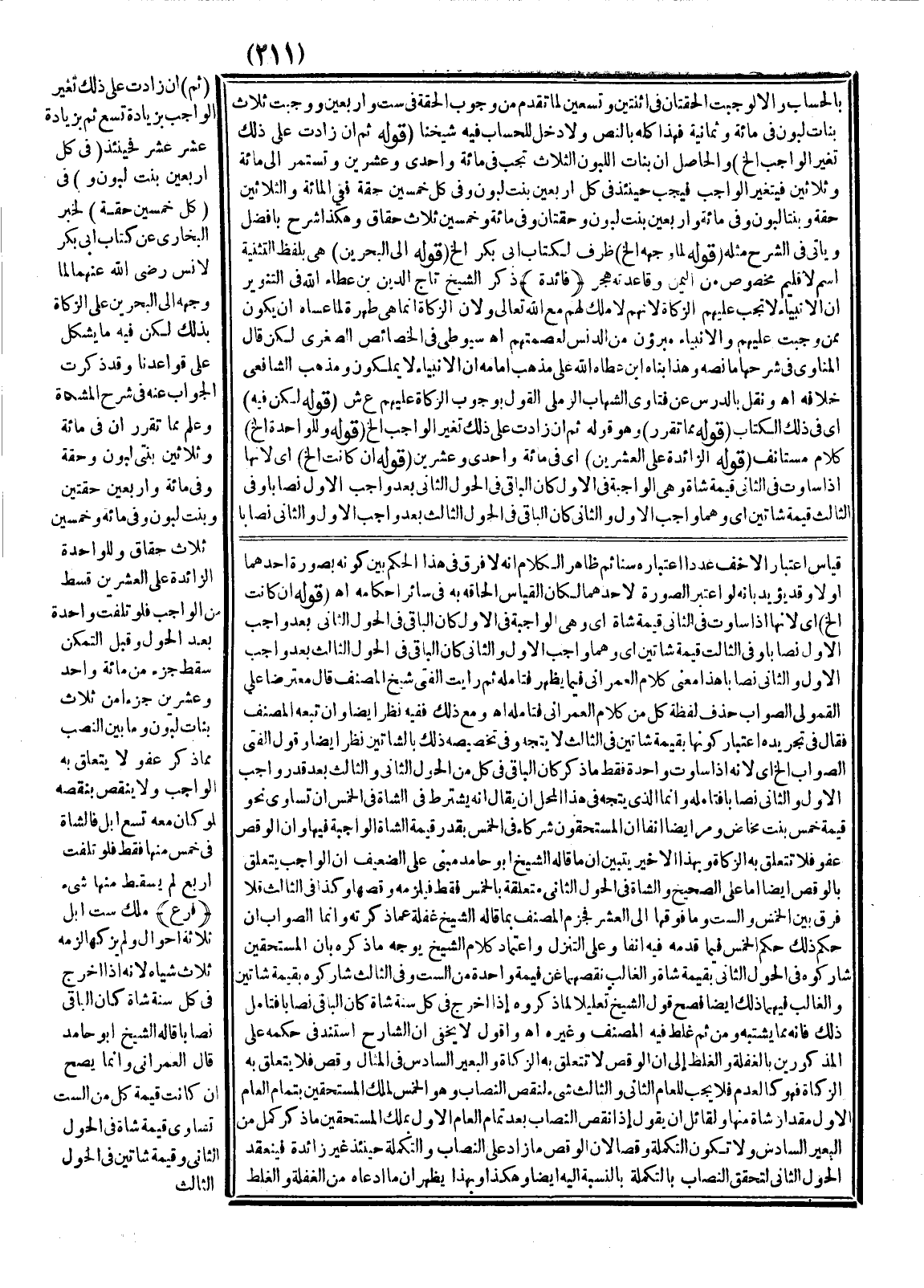 ـــــــــــــــــــــــــــــQبِالْحِسَابِ، وَإِلَّا لَوَجَبَتْ الْحِقَّتَانِ فِي اثْنَتَيْنِ وَتِسْعِينَ لِمَا تَقَدَّمَ مِنْ وُجُوبِ الْحِقَّةِ فِي سِتٍّ وَأَرْبَعِينَ وَوَجَبَتْ ثَلَاثُ بَنَاتِ لَبُونٍ فِي مِائَةٍ وَثَمَانِيَةٍ فَهَذَا كُلُّهُ بِالنَّصِّ، وَلَا دَخْلَ لِلْحِسَابِ فِيهِ شَيْخُنَا (قَوْلُهُ: ثُمَّ إنْ زَادَتْ عَلَى ذَلِكَ تَغَيَّرَ الْوَاجِبُ إلَخْ) وَالْحَاصِلُ: أَنَّ بَنَاتِ اللَّبُونِ الثَّلَاثَ تَجِبُ فِي مِائَةٍ وَإِحْدَى وَعِشْرِينَ وَتَسْتَمِرُّ إلَى مِائَةٍ وَثَلَاثِينَ فَيَتَغَيَّرُ الْوَاجِبُ فَيَجِبُ حِينَئِذٍ فِي كُلِّ أَرْبَعِينَ بِنْتُ لَبُونٍ، وَفِي كُلِّ خَمْسِينَ حِقَّةٌ فَفِي الْمِائَةِ وَالثَّلَاثِينَ حِقَّةٌ وَبِنْتَا لَبُونٍ، وَفِي مِائَةٍ وَأَرْبَعِينَ بِنْتُ لَبُونٍ وَحِقَّتَانِ، وَفِي مِائَةٍ وَخَمْسِينَ ثَلَاثُ حِقَاقٍ وَهَكَذَا شَرْحُ بَافَضْلٍ وَيَأْتِي فِي الشَّرْحِ مِثْلُهُ (قَوْلُهُ: لَمَّا وَجَّهَهُ إلَخْ) ظَرْفٌ لِكِتَابِ أَبِي بَكْرٍ إلَخْ (قَوْلُهُ: إلَى الْبَحْرَيْنِ) هِيَ بِلَفْظِ التَّثْنِيَةِ اسْمٌ لِإِقْلِيمٍ مَخْصُوصٍ مِنْ الْيَمَنِ، وَقَاعِدَتُهُ هَجَرُ (فَائِدَةٌ)