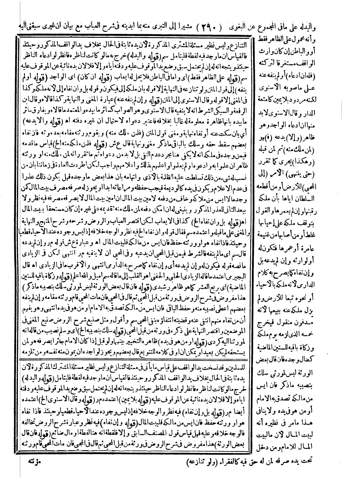 وَالْيَدُ لَهُ عَلَى مَا فِي الْمَجْمُوعِ عَنْ الْبَغَوِيّ مُشِيرًا إلَى التَّبَرِّي مِنْهُ بِمَا أَبْدَيْته فِي شَرْحِ الْعُبَابِ مَعَ بَيَانِ أَنَّ غَيْرِي سَبَقَنِي إلَيْهِ وَأَنَّهُ مَحْمُولٌ عَلَى الظَّاهِرِ فَقَطْ أَوْ وَالْبَاطِنِ إنْ كَانَ وَارِثُ الْوَاقِفِ مُسْتَغْرِقًا لِتِرْكَتِهِ.