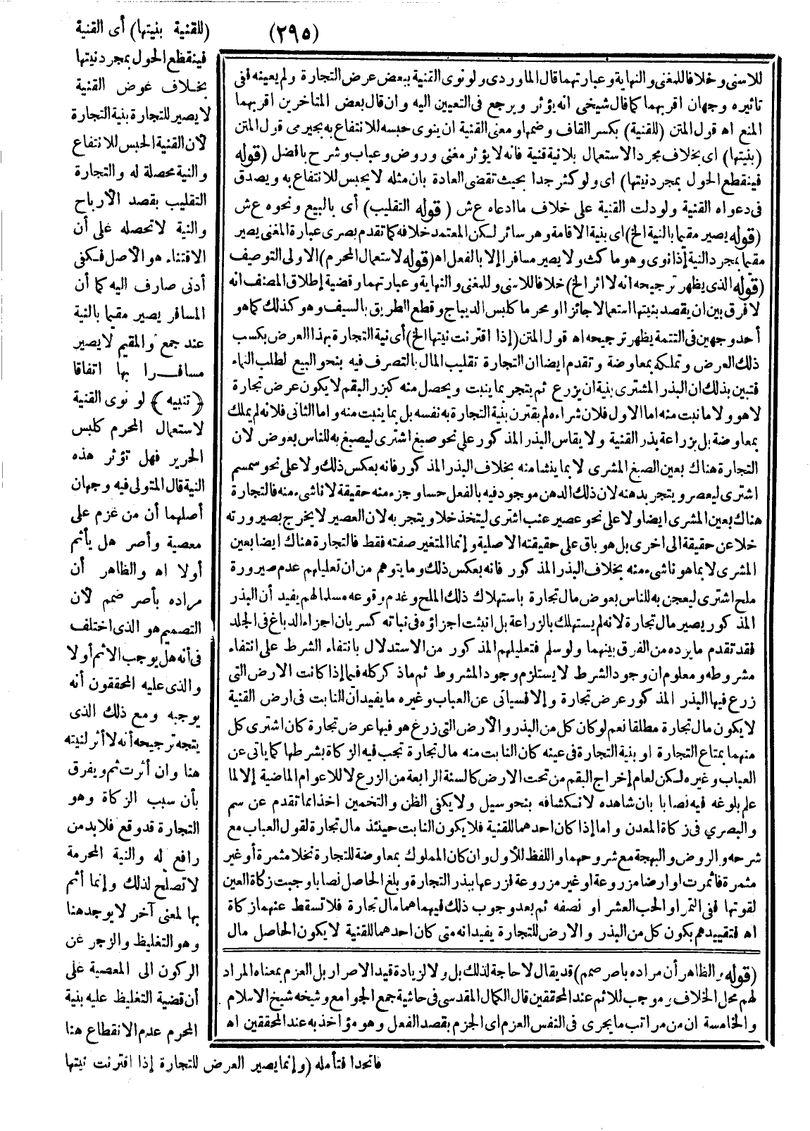 (قَوْلُهُ فَيَنْقَطِعُ الْحَوْلُ بِمُجَرَّدِ نِيَّتِهَا) أَيْ وَلَوْ كَثُرَ جِدًّا بِحَيْثُ تَقْضِي الْعَادَةُ بِأَنَّ مِثْلَهُ لَا يُحْبَسُ لِلِانْتِفَاعِ بِهِ وَيُصَدَّقُ فِي دَعْوَاهُ الْقِنْيَةَ وَلَوْ دَلَّتْ الْقَرِينَةُ عَلَى خِلَافِ مَا ادَّعَاهُ ع ش (قَوْلُهُ التَّقْلِيبُ) أَيْ بِالْبَيْعِ وَنَحْوِهِ ع ش (قَوْلُهُ يَصِيرُ مُقِيمًا بِالنِّيَّةِ إلَخْ) أَيْ بِنِيَّةِ الْإِقَامَةِ وَهُوَ سَائِرٌ لَكِنَّ الْمُعْتَمَدَ خِلَافُهُ كَمَا تَقَدَّمَ بَصْرِيٌّ عِبَارَةُ الْمُغْنِي يَصِيرُ مُقِيمًا بِمُجَرَّدِ النِّيَّةِ إذَا نَوَى وَهُوَ مَاكِثٌ وَلَا يَصِيرُ مُسَافِرًا إلَّا بِالْفِعْلِ اهـ.