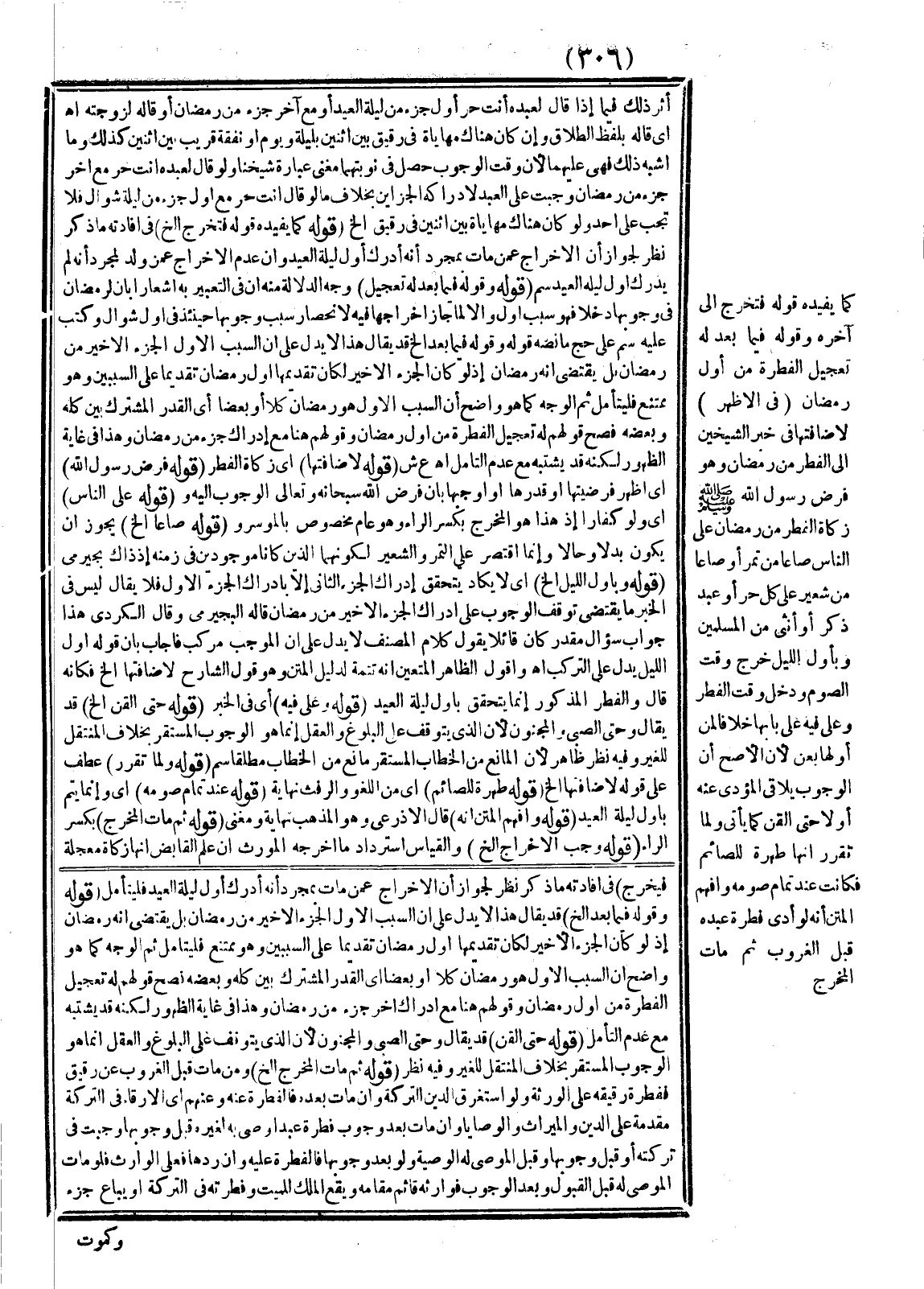 وَقَالَ الْكُرْدِيُّ هَذَا جَوَابُ سُؤَالٍ مُقَدَّرٍ كَأَنَّ قَائِلًا يَقُولُ كَلَامُ الْمُصَنِّفِ لَا يَدُلُّ عَلَى أَنَّ الْمُوجِبَ مُرَكَّبٌ فَأَجَابَ بِأَنَّ قَوْلَهُ أَوَّلَ اللَّيْلِ يَدُلُّ عَلَى التَّرَكُّبِ اهـ وَأَقُولُ: الظَّاهِرُ الْمُتَعَيَّنُ أَنَّهُ تَتِمَّةٌ لِدَلِيلِ الْمَتْنِ وَهُوَ قَوْلُ الشَّارِحِ لِإِضَافَتِهَا إلَخْ فَكَأَنَّهُ قَالَ وَالْفِطْرُ الْمَذْكُورُ إنَّمَا يَتَحَقَّقُ بِأَوَّلِ لَيْلَةِ الْعِيدِ (قَوْلُهُ وَعَلَى فِيهِ) أَيْ فِي الْخَبَرِ (قَوْلُهُ حَتَّى الْقِنَّ إلَخْ) قَدْ يُقَالُ وَحَتَّى الصَّبِيِّ وَالْمَجْنُونِ؛ لِأَنَّ الَّذِي يَتَوَقَّفُ عَلَى الْبُلُوغِ وَالْعَقْلِ إنَّمَا هُوَ الْوُجُوبُ الْمُسْتَقِرُّ بِخِلَافِ الْمُنْتَقِلِ لِلْغَيْرِ وَفِيهِ نَظَرٌ ظَاهِرٌ؛ لِأَنَّ الْمَانِعَ مِنْ الْخِطَابِ الْمُسْتَقِرِّ مَانِعٌ مِنْ الْخِطَابِ مُطْلَقًا سم (قَوْلُهُ وَلِمَا تَقَرَّرَ) عَطْفٌ عَلَى قَوْلِهِ لِإِضَافَتِهَا إلَخْ (قَوْلُهُ طُهْرَةٌ لِلصَّائِمِ) أَيْ مِنْ اللَّغْوِ وَالرَّفَثِ نِهَايَةٌ (قَوْلُهُ عِنْدَ تَمَامِ صَوْمِهِ) أَيْ وَإِنَّمَا يَتِمُّ بِأَوَّلِ لَيْلَةِ الْعِيدِ (قَوْلُهُ وَأَفْهَمَ الْمَتْنُ أَنَّهُ إلَخْ) قَالَ الْأَذْرَعِيُّ وَهُوَ الْمَذْهَبُ نِهَايَةٌ وَمُغْنِي (قَوْلُهُ ثُمَّ مَاتَ الْمُخْرِجُ) بِكَسْرِ الرَّاءِ.