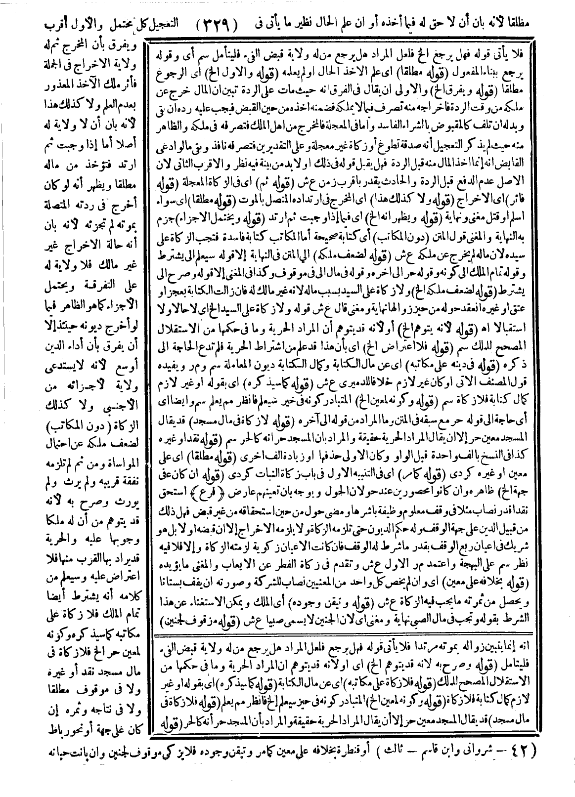 مُطْلَقًا؛ لِأَنَّهُ بَانَ أَنْ لَا حَقَّ لَهُ فِيمَا أَخَذَهُ أَوْ إنْ عَلِمَ الْحَالَ نَظِيرَ مَا يَأْتِي فِي التَّعْجِيلِ كُلٌّ مُحْتَمَلٌ وَالْأَوَّلُ أَقْرَبُ وَيُفَرَّقُ بِأَنَّ الْمَخْرَجَ ثَمَّ لَهُ وِلَايَةُ الْإِخْرَاجِ فِي الْجُمْلَةِ فَأَثَّرَ مِلْكُ الْآخِذِ الْمَعْذُورِ بِعَدَمِ الْعِلْمِ وَلَا كَذَلِكَ هَذَا؛ لِأَنَّهُ بَانَ أَنْ لَا وِلَايَةَ لَهُ أَصْلًا أَمَّا إذَا وَجَبَتْ ثُمَّ ارْتَدَّ فَتُؤْخَذُ مِنْ مَالِهِ مُطْلَقًا وَيَظْهَرُ أَنَّهُ لَوْ كَانَ أَخْرَجَ فِي رِدَّتِهِ الْمُتَّصِلَةِ بِمَوْتِهِ لَمْ تُجْزِئْهُ؛ لِأَنَّهُ بَانَ أَنَّهُ حَالَةَ الْإِخْرَاجِ غَيْرُ مَالِكٍ فَلَا وِلَايَةَ لَهُ عَلَى التَّفْرِقَةِ وَيُحْتَمَلُ الْإِجْزَاءُ كَمَا هُوَ الظَّاهِرُ فِيمَا لَوْ أَخْرَجَ دُيُونَهُ حِينَئِذٍ إلَّا أَنْ يُفَرَّقَ بِأَنَّ أَدَاءَ الدَّيْنِ أَوْسَعُ؛ لِأَنَّهُ لَا يَسْتَدْعِي وِلَايَةً لِإِجْزَائِهِ مِنْ الْأَجْنَبِيِّ وَلَا كَذَلِكَ الزَّكَاةُ (دُونَ الْمُكَاتَبِ) لِضَعْفِ مِلْكِهِ عَنْ احْتِمَالِ الْمُوَاسَاةِ وَمِنْ ثَمَّ لَمْ تَلْزَمْهُ نَفَقَةُ قَرِيبِهِ وَلَمْ يَرِثْ وَلَمْ يُورَثْ وَصَرَّحَ بِهِ؛ لِأَنَّهُ قَدْ يُتَوَهَّمُ مِنْ أَنَّ لَهُ مِلْكًا وُجُوبُهَا عَلَيْهِ وَالْحُرِّيَّةُ قَدْ يُرَادُ بِهَا الْقُرْبُ مِنْهَا فَلَا اعْتِرَاضَ عَلَيْهِ وَسَيُعْلَمُ مِنْ كَلَامِهِ أَنَّهُ يُشْتَرَطُ أَيْضًا تَمَامُ الْمِلْكِ فَلَا زَكَاةَ عَلَى مُكَاتَبِهِ كَمَا سَيَذْكُرُهُ وَكَوْنُهُ لِمُعَيَّنٍ حُرٍّ إلَخْ فَلَا زَكَاةَ فِي مَالِ مَسْجِدٍ نَقْدٍ أَوْ غَيْرِهِ وَلَا فِي مَوْقُوفٍ مُطْلَقًا وَلَا فِي نِتَاجِهِ وَثَمَرِهِ إنْ كَانَ عَلَى جِهَةٍ أَوْ نَحْوِ رِبَاطٍ أَوْ قَنْطَرَةٍ بِخِلَافِهِ عَلَى مُعَيَّنٍ كَمَا مَرَّ وَتَيَقَّنَ وُجُودَهُ فَلَا يُزَكَّى مَوْقُوفٌ لِجَنِينٍ وَإِنْ بَانَتْ حَيَاتُهُ